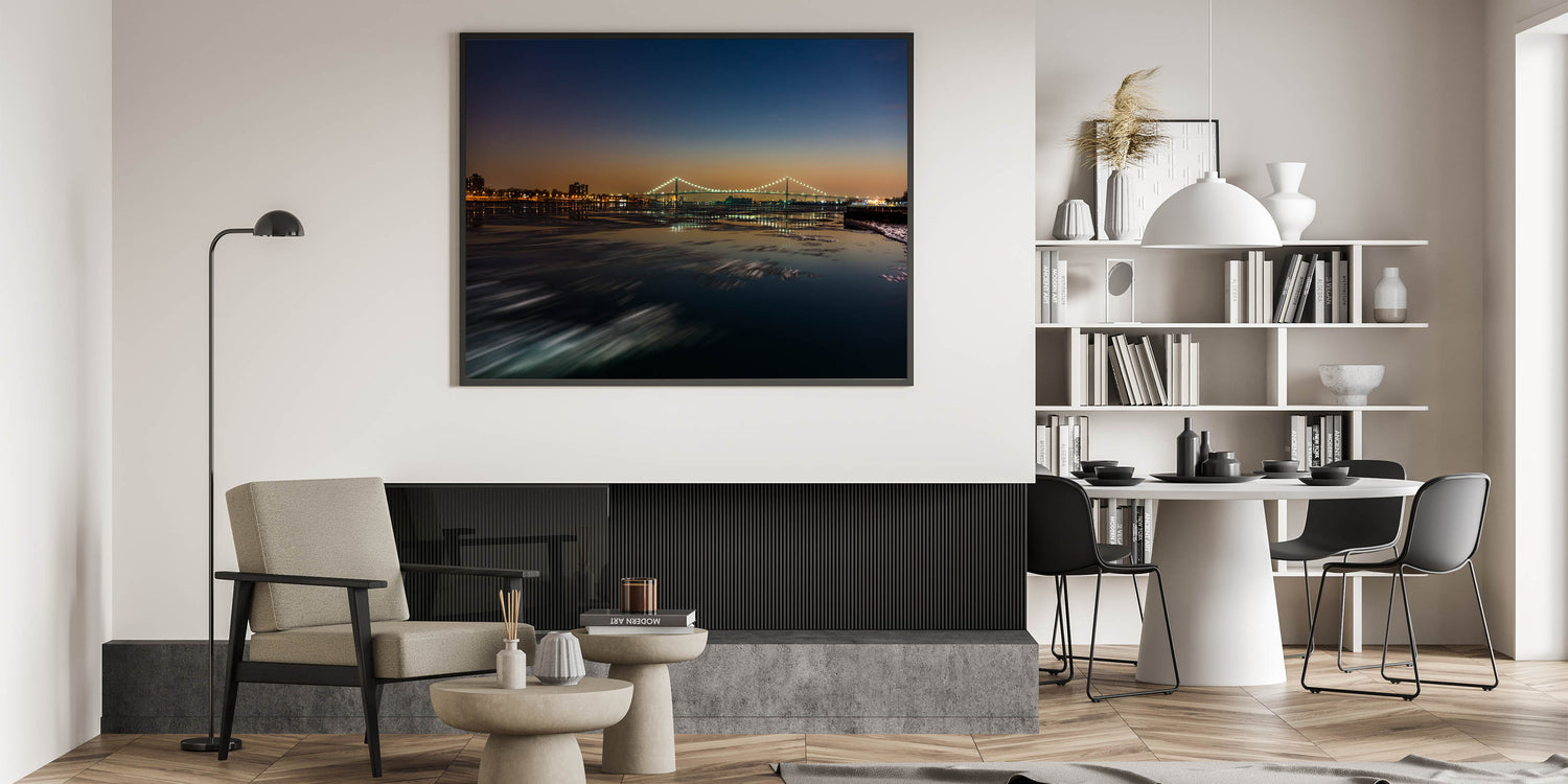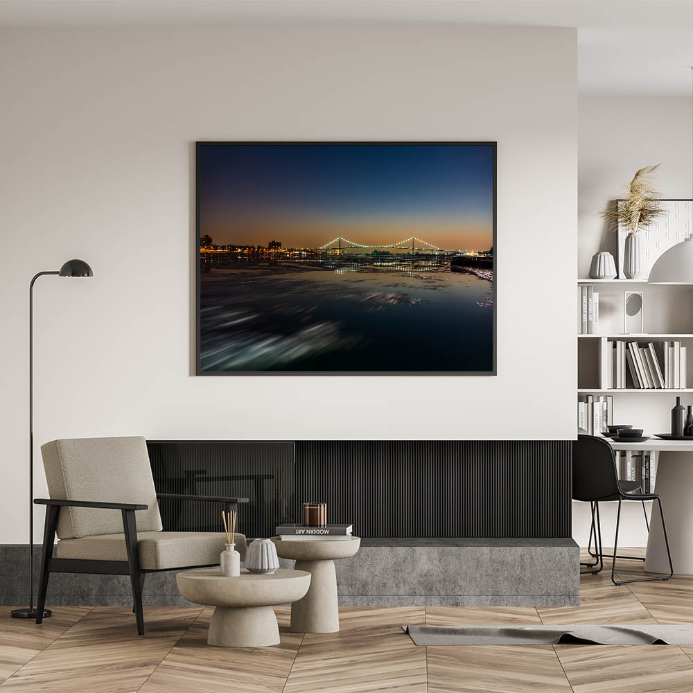 Experience the tranquil beauty of Detroit with this serene evening bridge wall art. This high-quality photography print captures the iconic bridge illuminated against the fading light of day, with its reflection shimmering in the calm waters below. Perfect for adding a peaceful and elegant touch to any space, this artwork is ideal for those who appreciate the serene charm of cityscapes at dusk.
