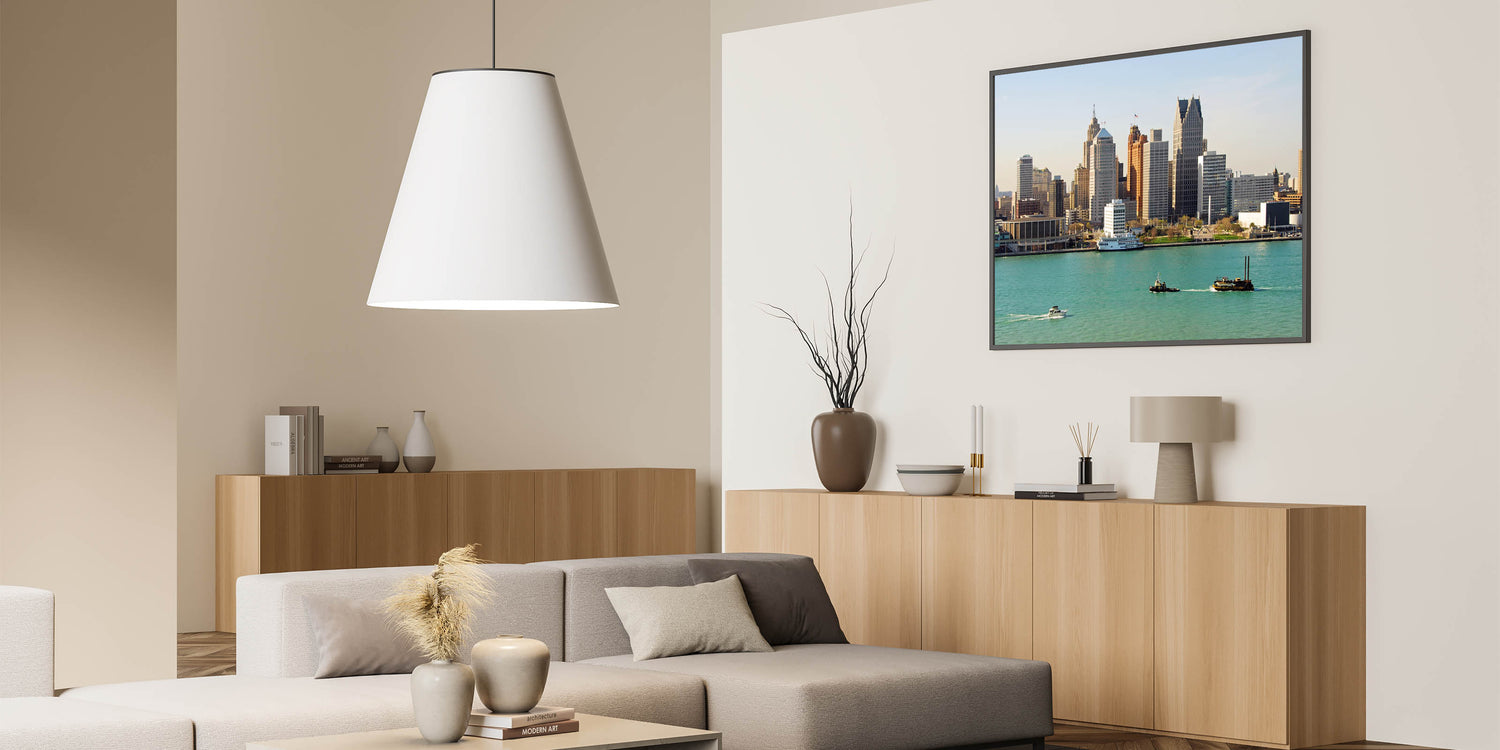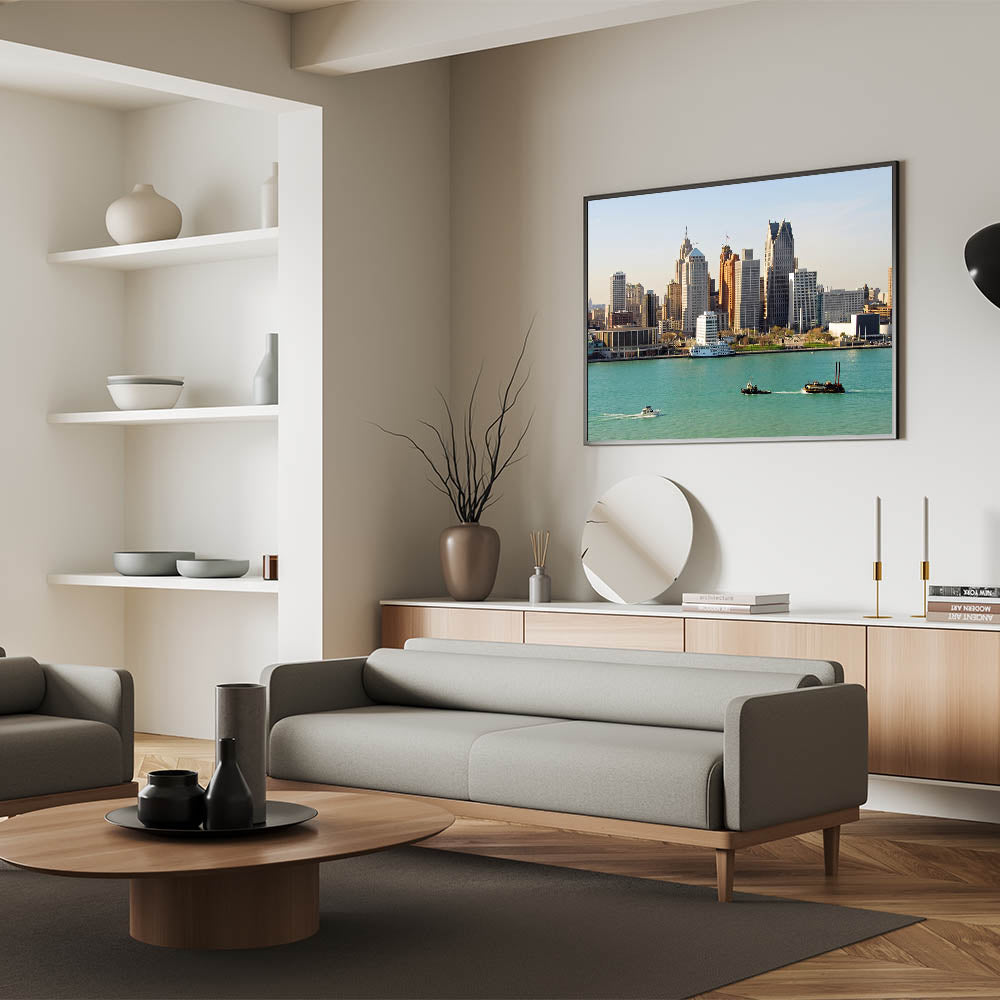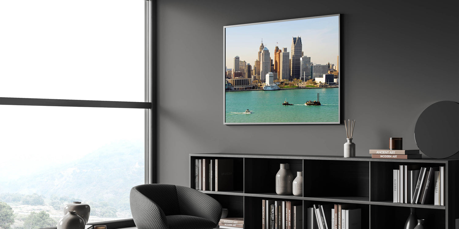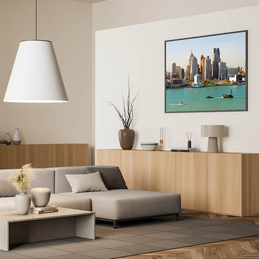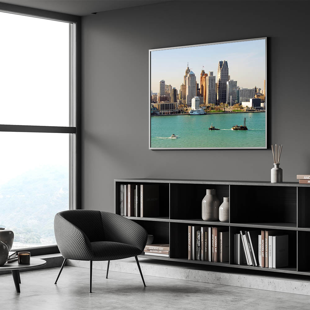Enhance your home or office with this beautiful Detroit cityscape art, showcasing the city in all its daytime glory. This artwork will make a striking addition to any room, bringing a sense of calm and sophistication to your space.