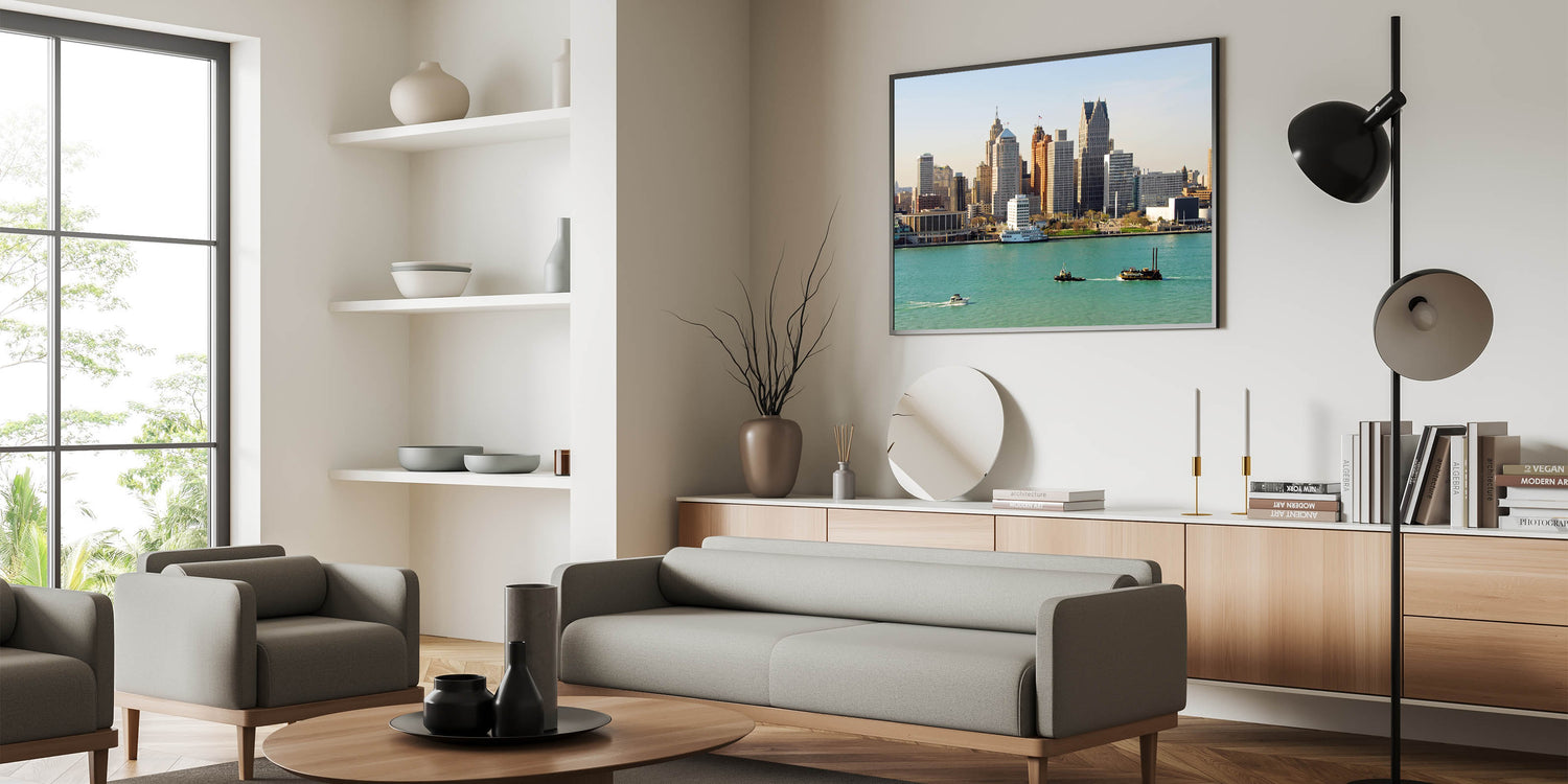 Bring the calm and beauty of Detroit's skyline into your space with this serene daytime cityscape wall art. This high-quality photography print captures the city's iconic architecture, beautifully reflected in the tranquil waters of the Detroit River. Ideal for adding a touch of urban elegance to any room, this artwork is perfect for those who appreciate the charm and beauty of Detroit during the day.
