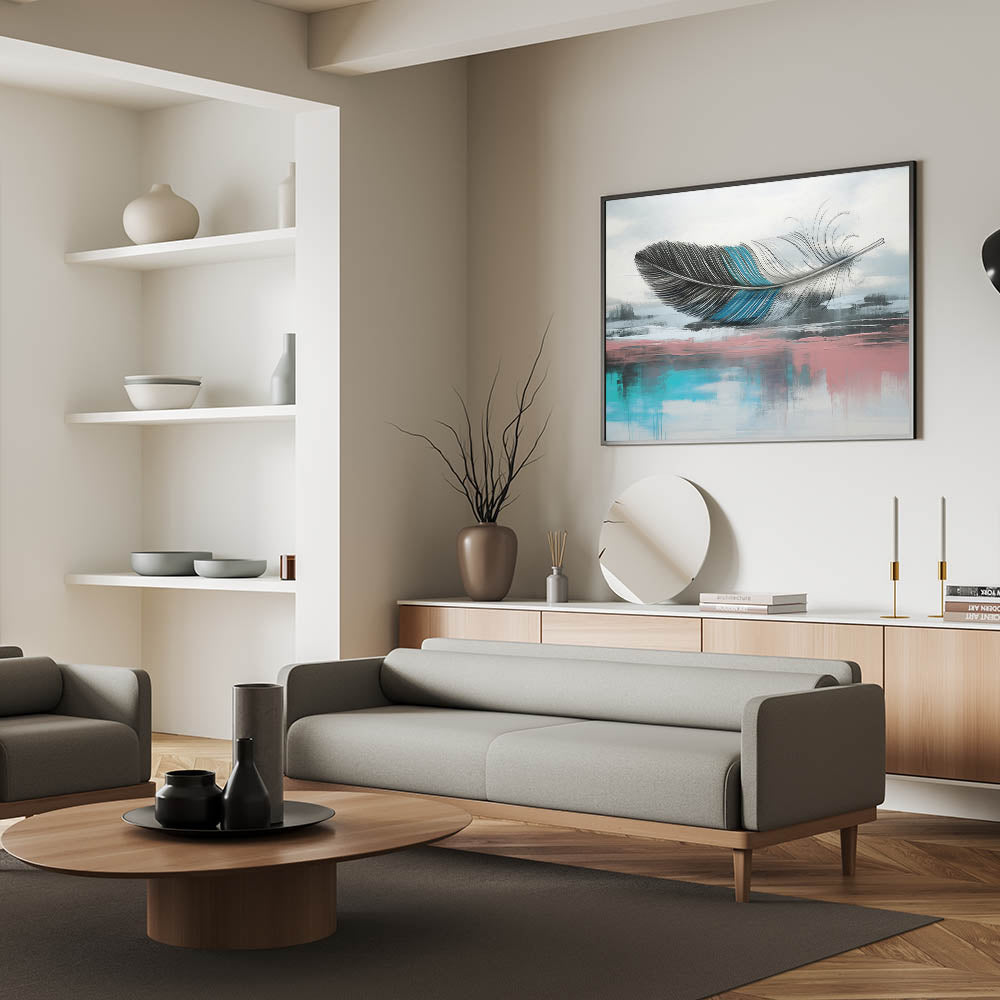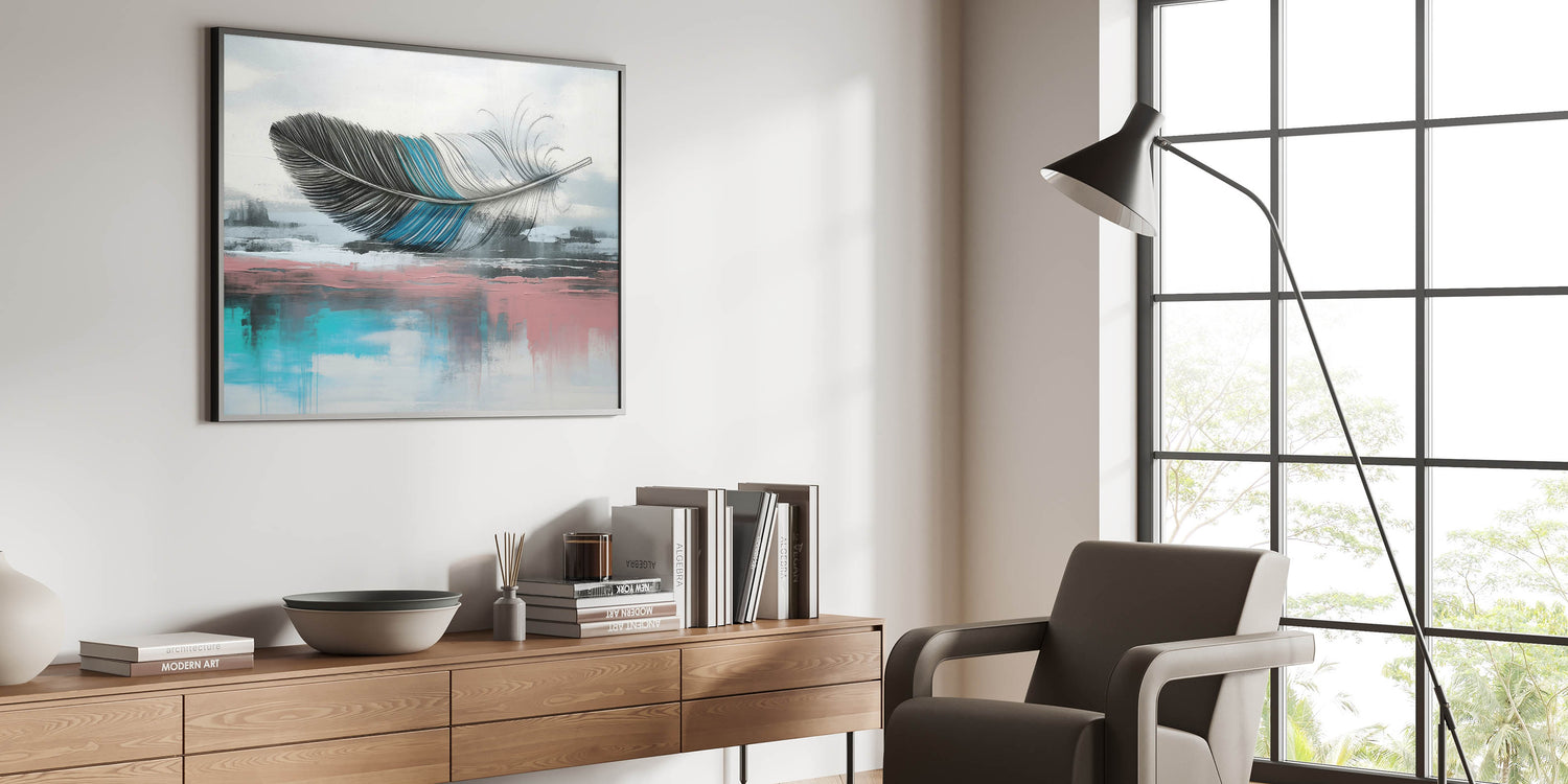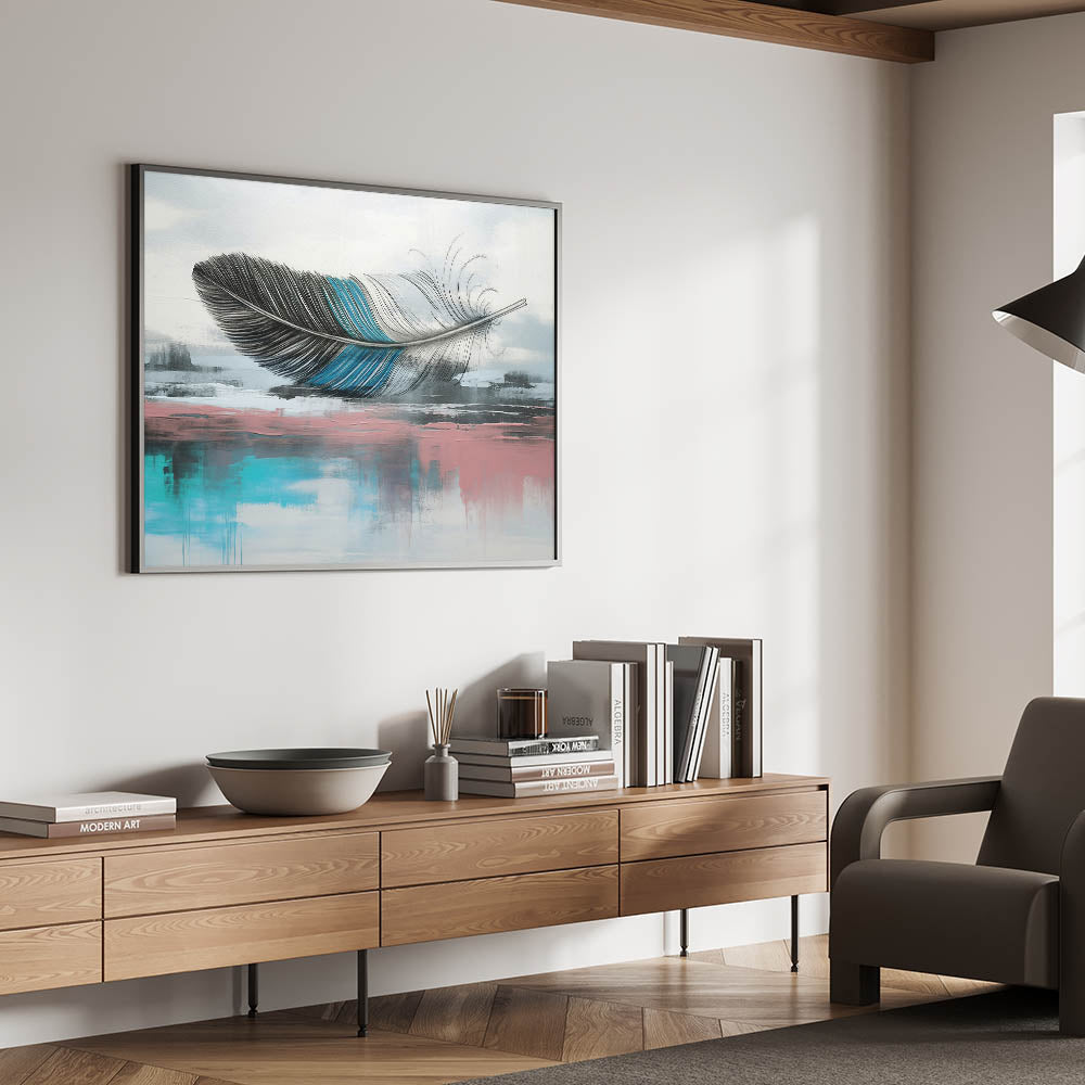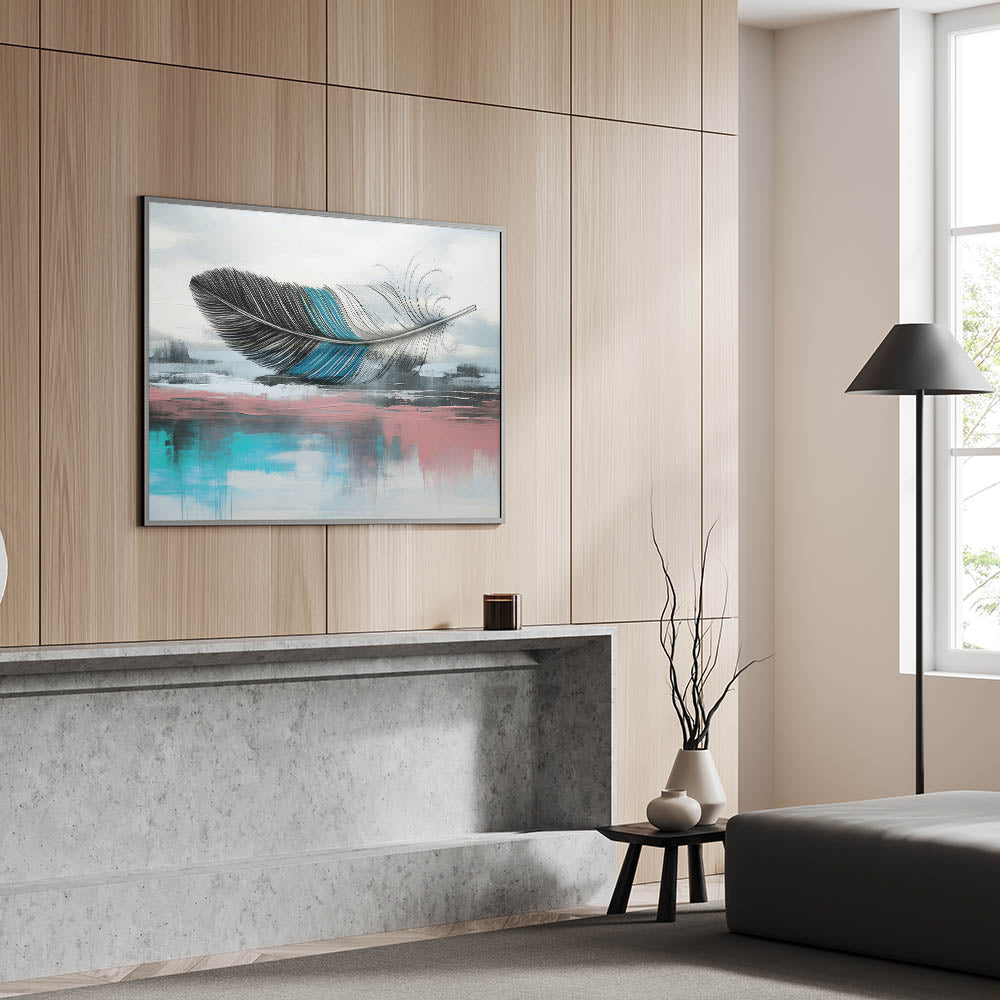 Infuse your space with calm and elegance with this serene feather abstract art. This modern pastel line canvas blends soft hues of teal, pink, and gray, creating a tranquil scene that soothes the eye. The delicate feather, intricately detailed against a peaceful backdrop, adds a touch of nature-inspired beauty to any interior.