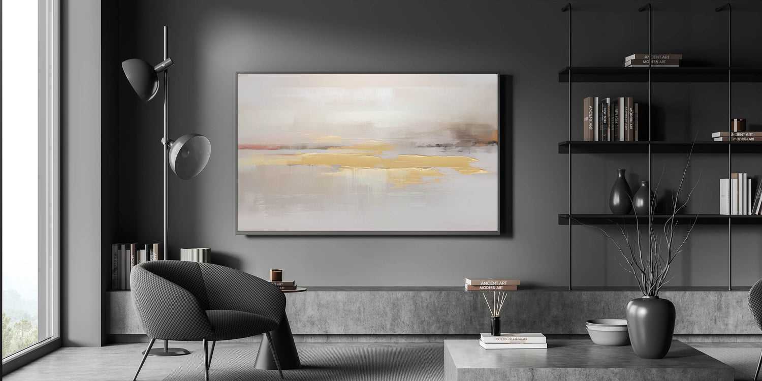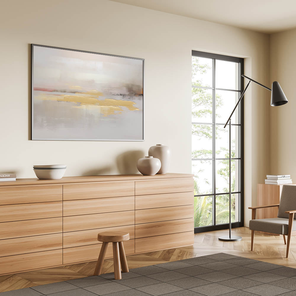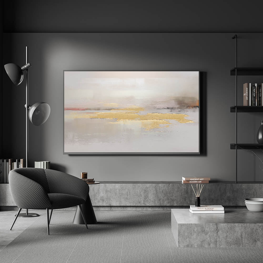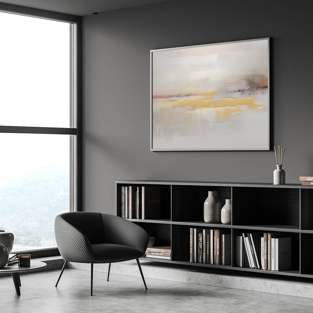 Add a touch of luxury and calm to your living space with this Serene Golden Strokes and Lines Abstract Art piece. This artwork features soft, flowing golden strokes that blend seamlessly with muted tones of grey and white, creating a tranquil yet sophisticated visual experience. The subtle layering and texture in the brushstrokes give the piece a rich, dimensional quality that draws the eye and invites contemplation.