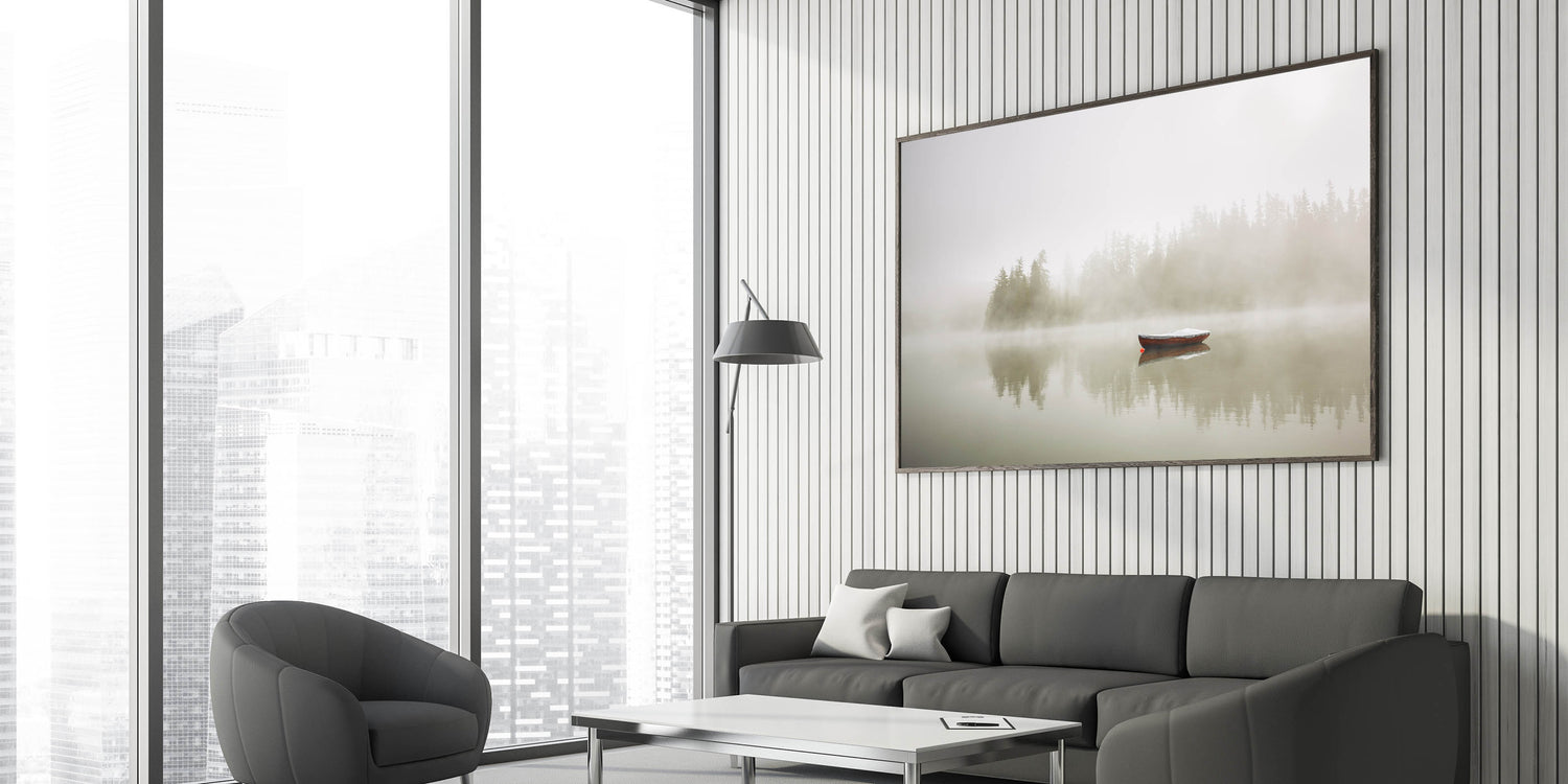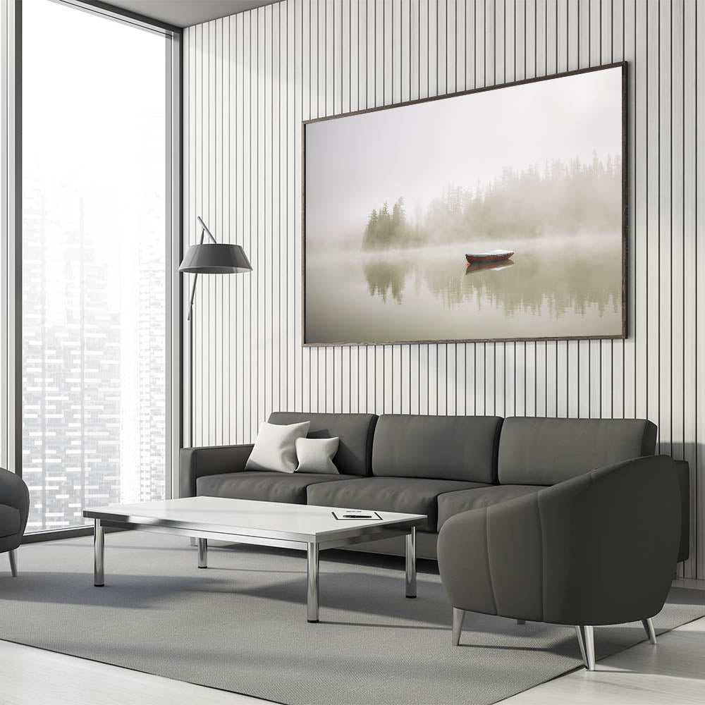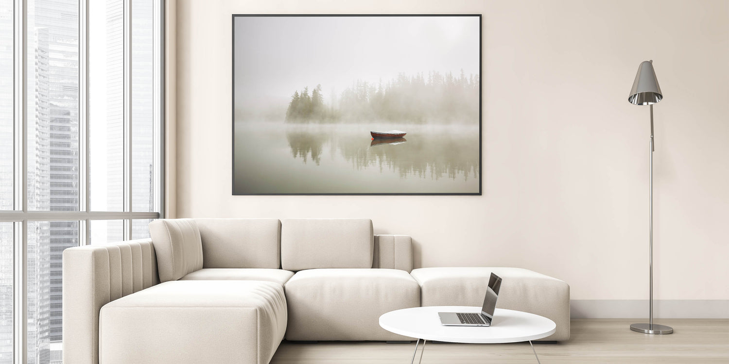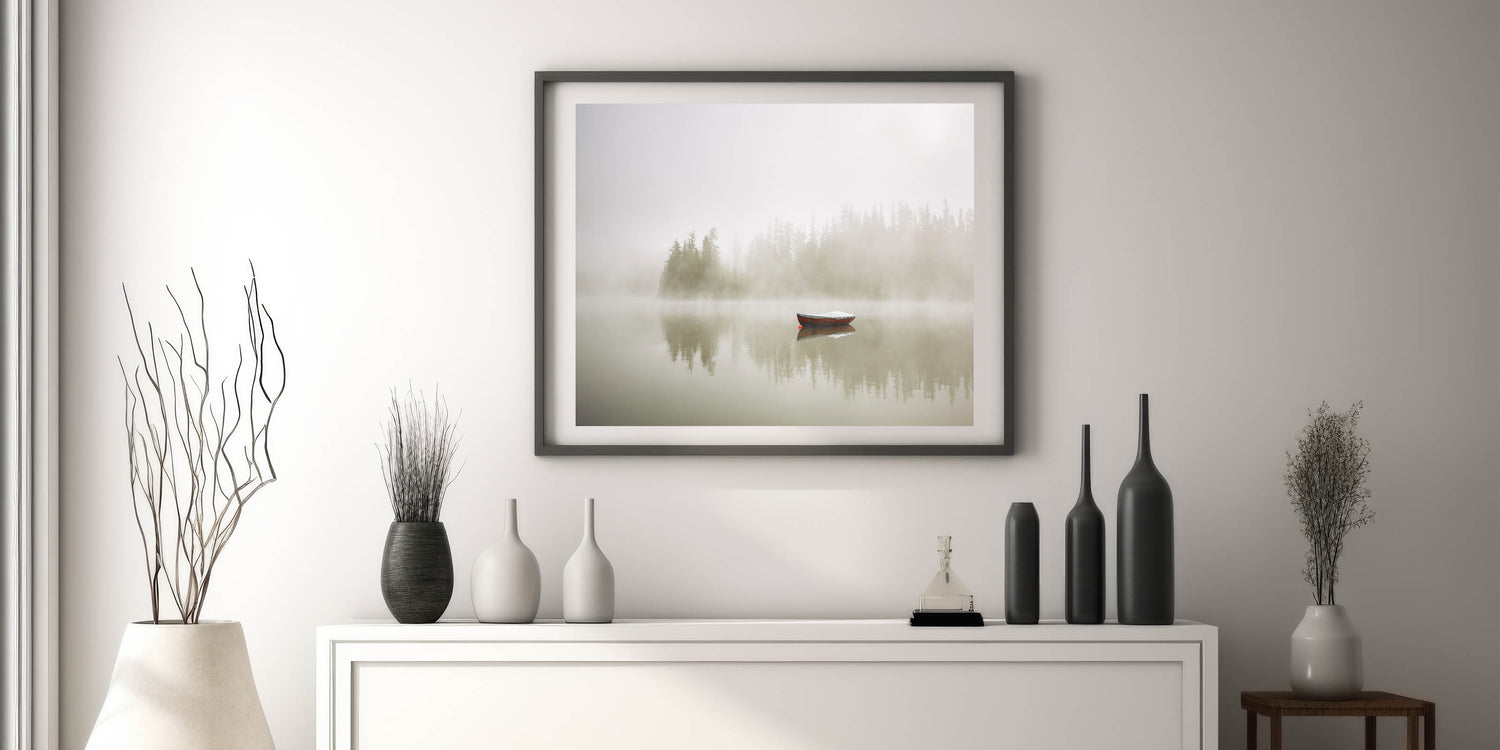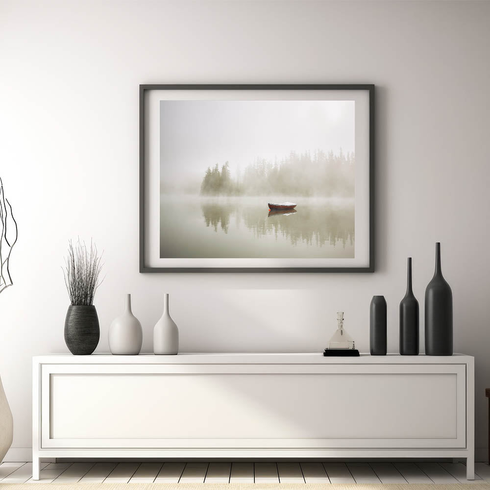 This misty lakeside print is perfect for those who appreciate the quiet beauty of nature and wish to create a peaceful retreat within their home.