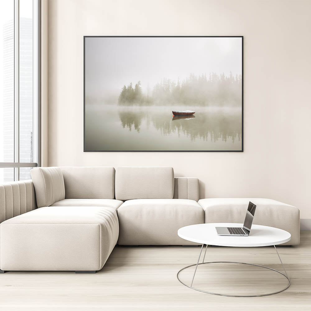Serene Misty Lake Art - Tranquil Boat and Fog Canvas for Calm Decor