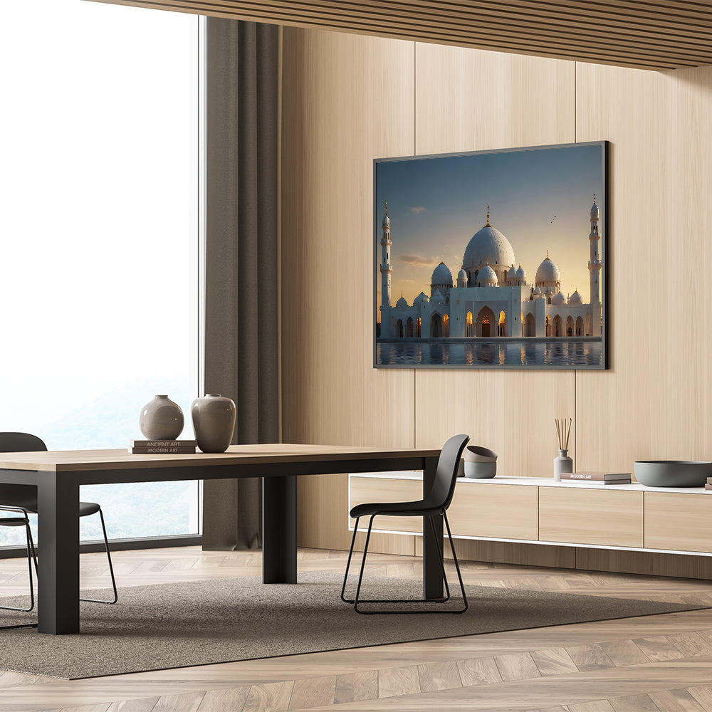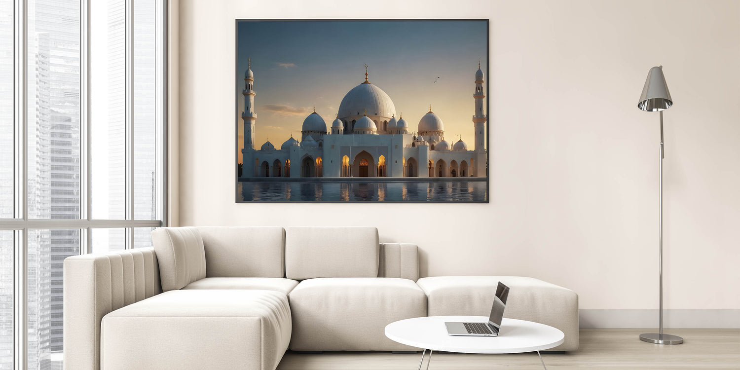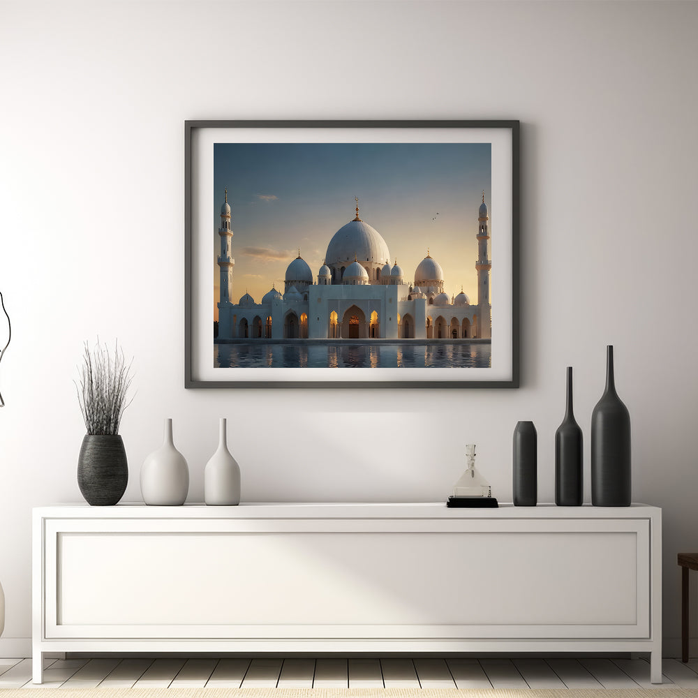 Transform your space with the serene beauty of this mosque domes wall art, capturing the peaceful reflection of a grand mosque against the water at sunset. The soft glow of the sunset highlights the intricate details of the mosque’s domes and minarets, creating a calming and majestic scene. This artwork is perfect for those who appreciate the harmony of nature and architecture, offering a tranquil and elegant addition to any room. Whether placed in a living room, bedroom, or meditation space, this print evokes a sense of peace and spiritual beauty.
