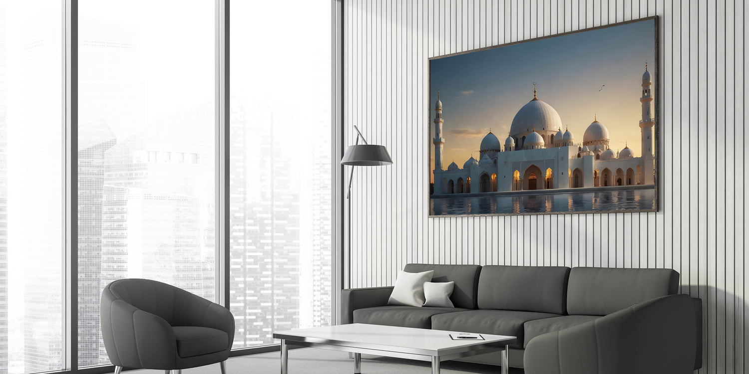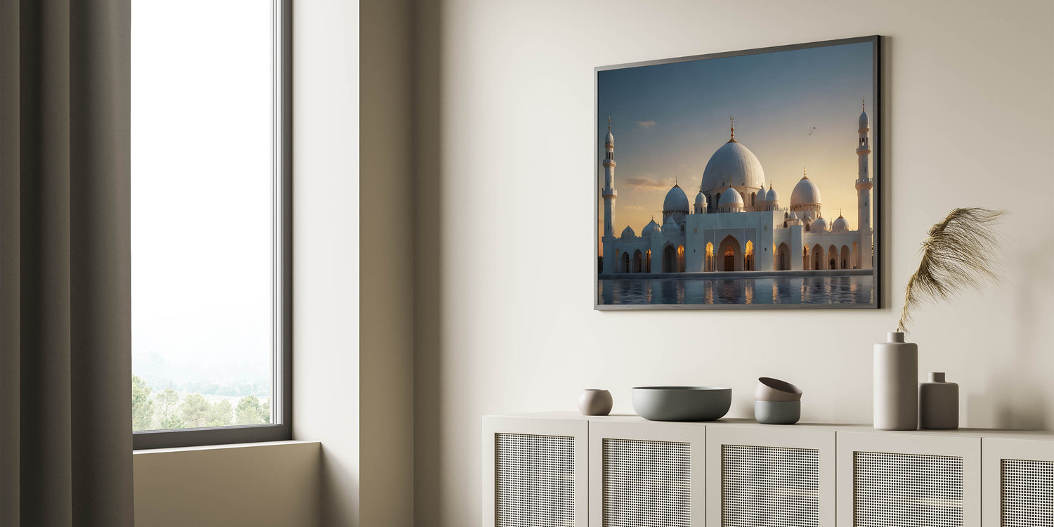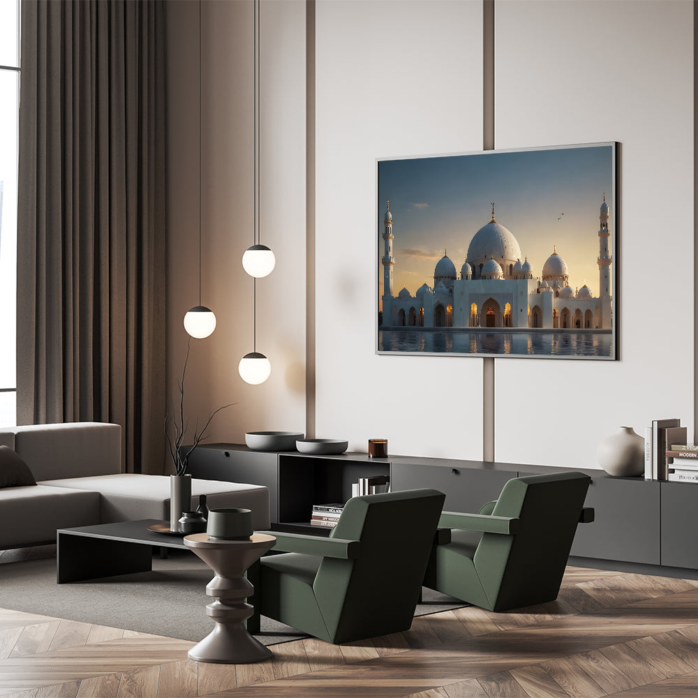 Transform your space with the serene beauty of this mosque domes wall art, capturing the peaceful reflection of a grand mosque against the water at sunset. The soft glow of the sunset highlights the intricate details of the mosque’s domes and minarets, creating a calming and majestic scene. This artwork is perfect for those who appreciate the harmony of nature and architecture, offering a tranquil and elegant addition to any room. Whether placed in a living room, bedroom, or meditation space, this print evokes a sense of peace and spiritual beauty.