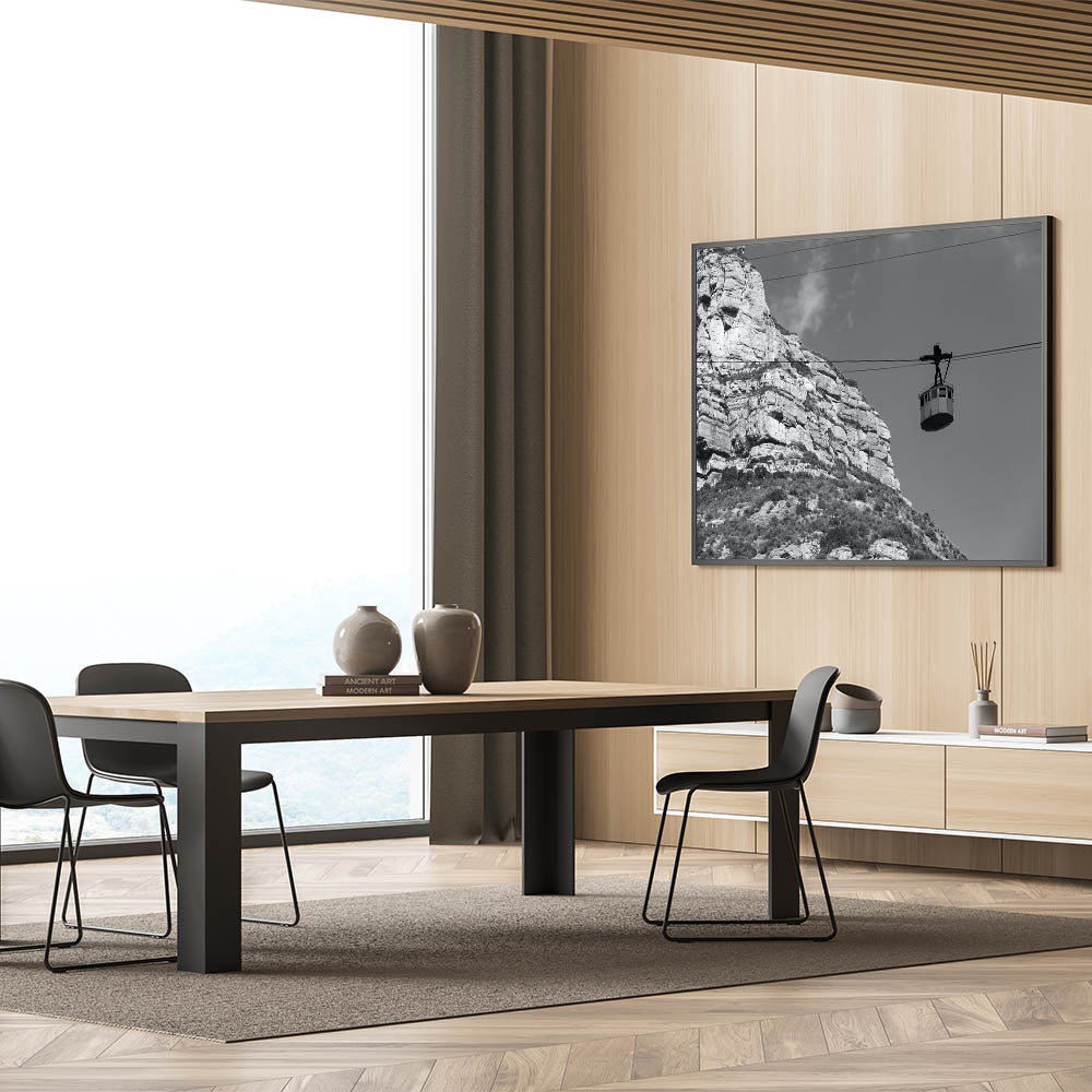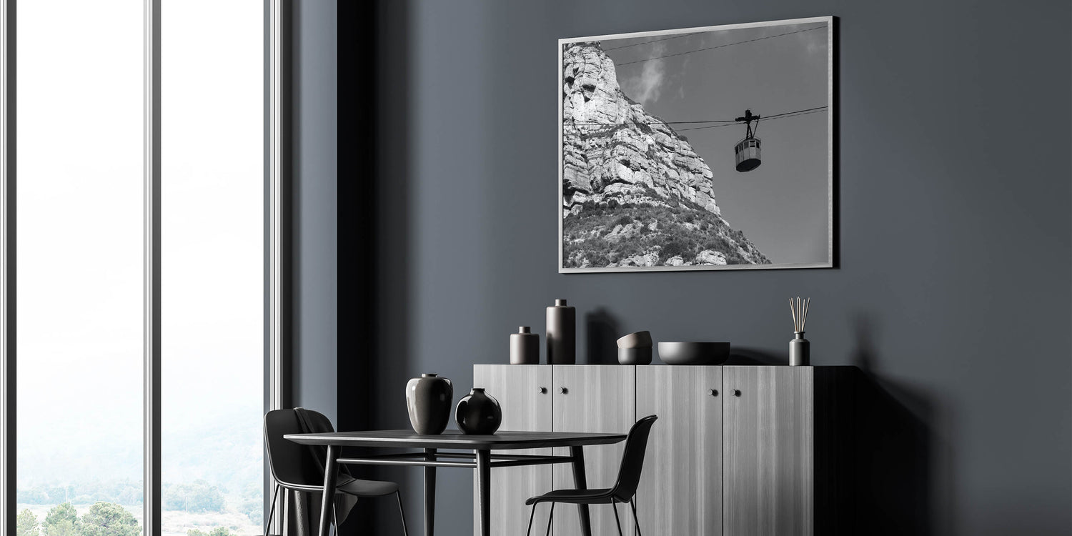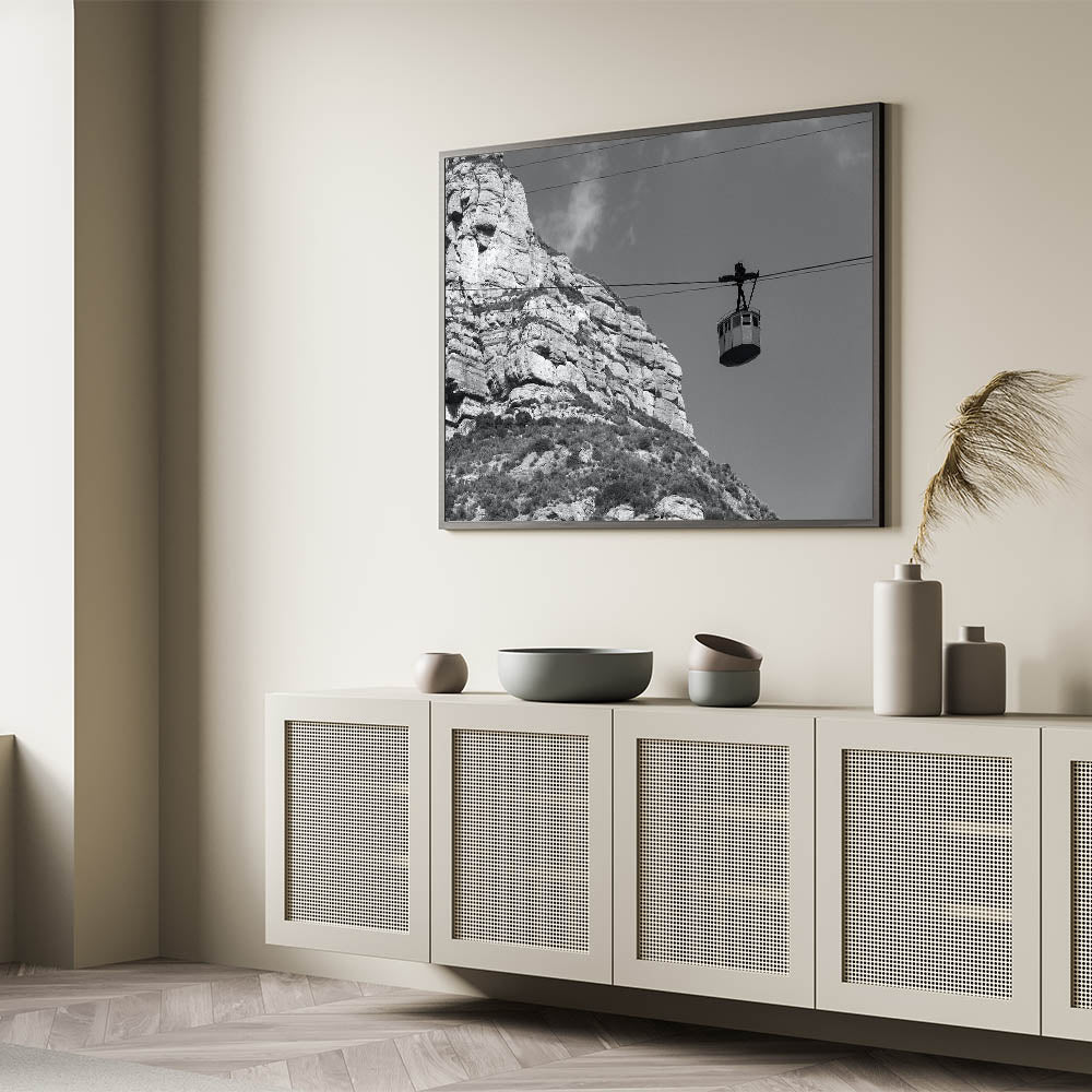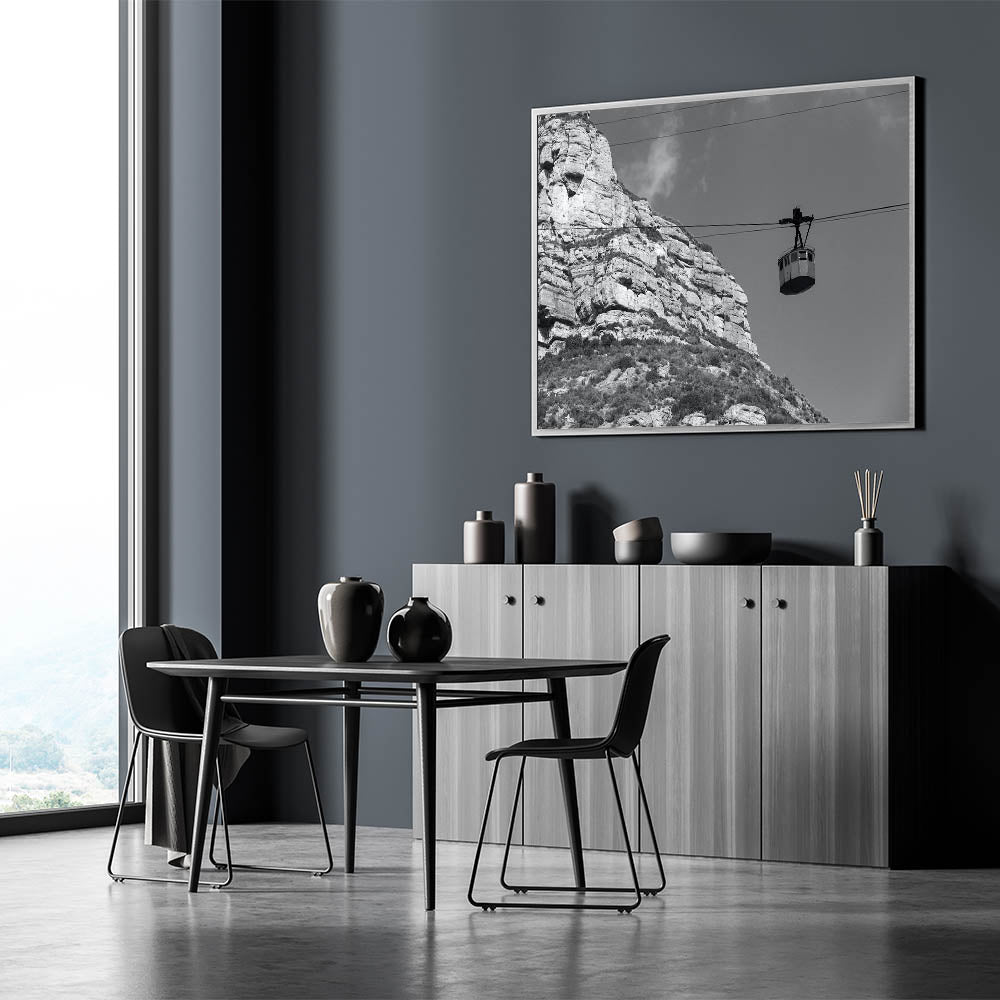 Embrace the thrill of adventure with this stunning wall art featuring a cable car suspended high above a rugged mountain landscape. Captured in monochrome tones, this high-quality service vehicles art highlights the stark contrast between the man-made structure and the natural rock formations, creating a visually striking and dramatic image. Perfect for those who love the blend of nature and engineering, this piece adds a sense of daring exploration to any space.