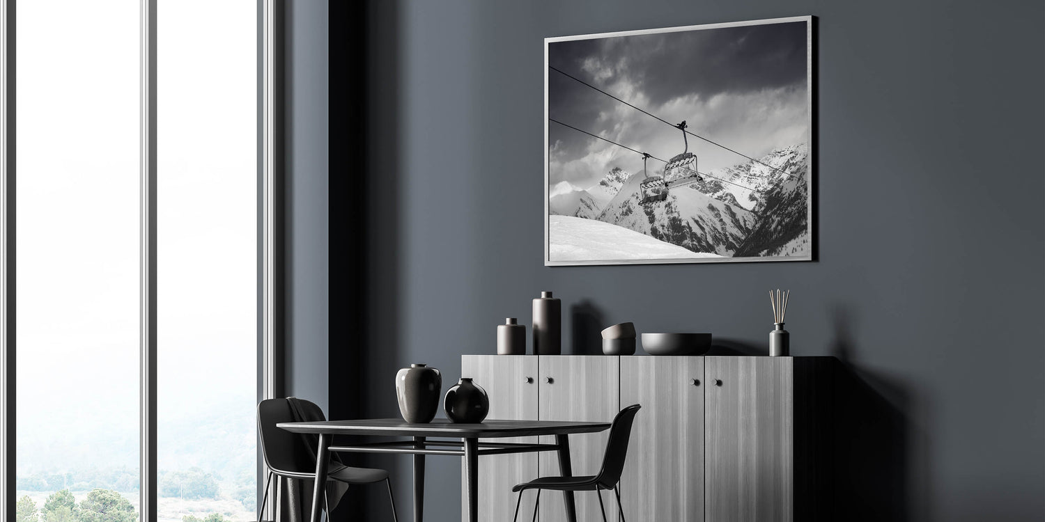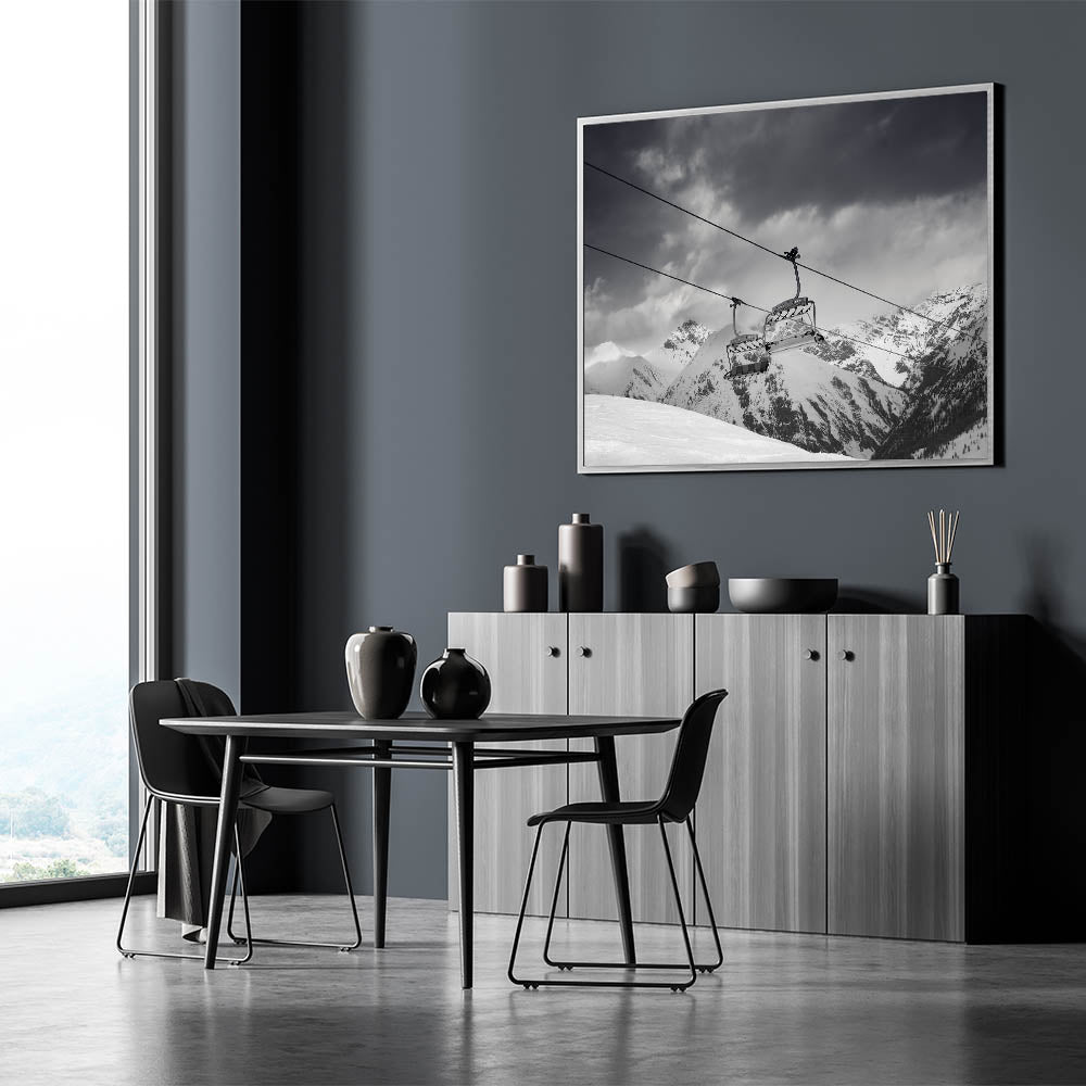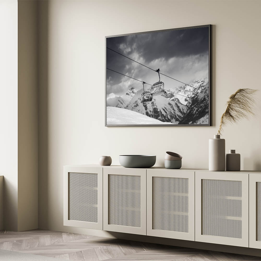 - High-resolution print capturing the dramatic atmosphere of the snowy mountains and ski lift
