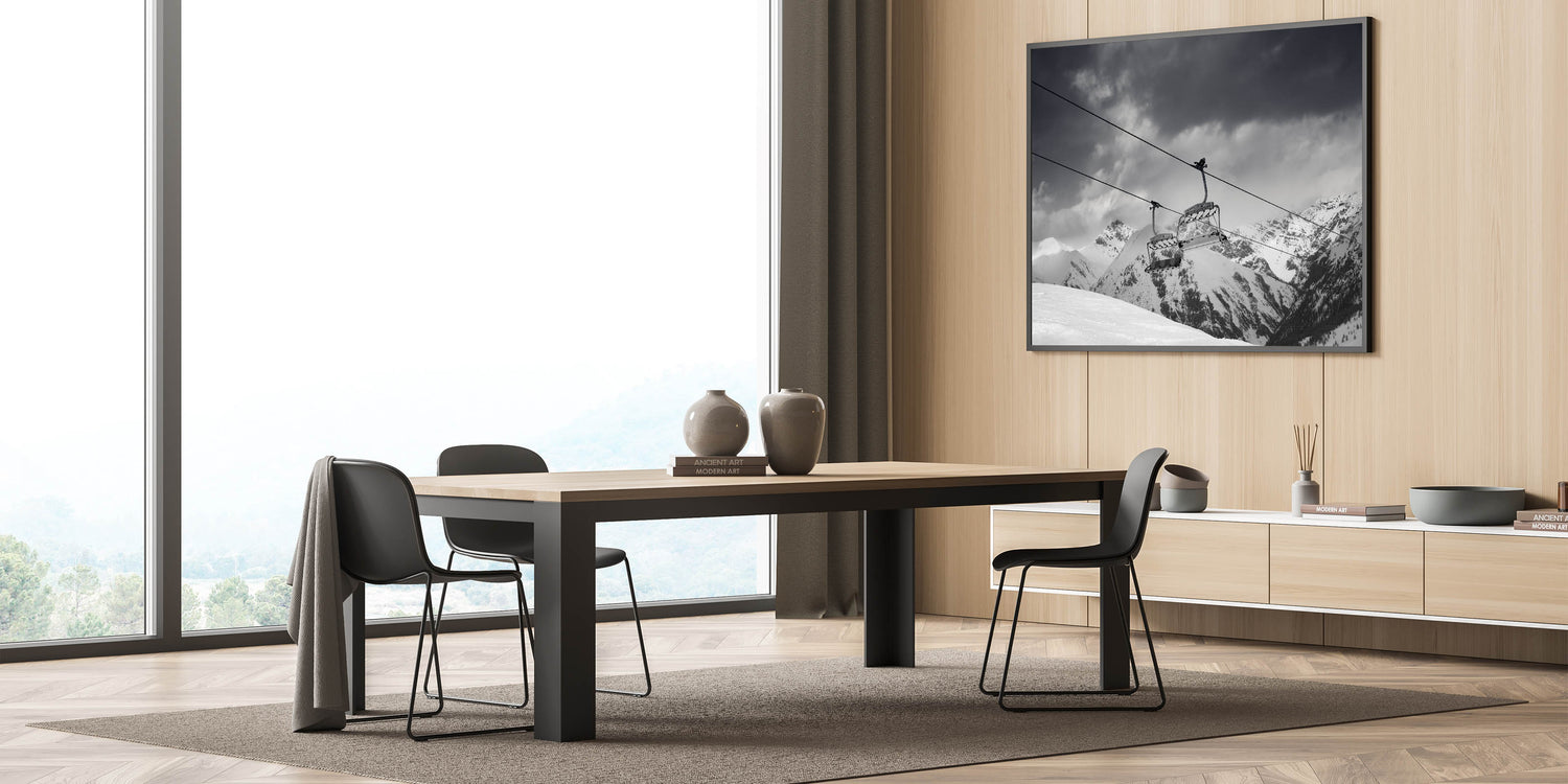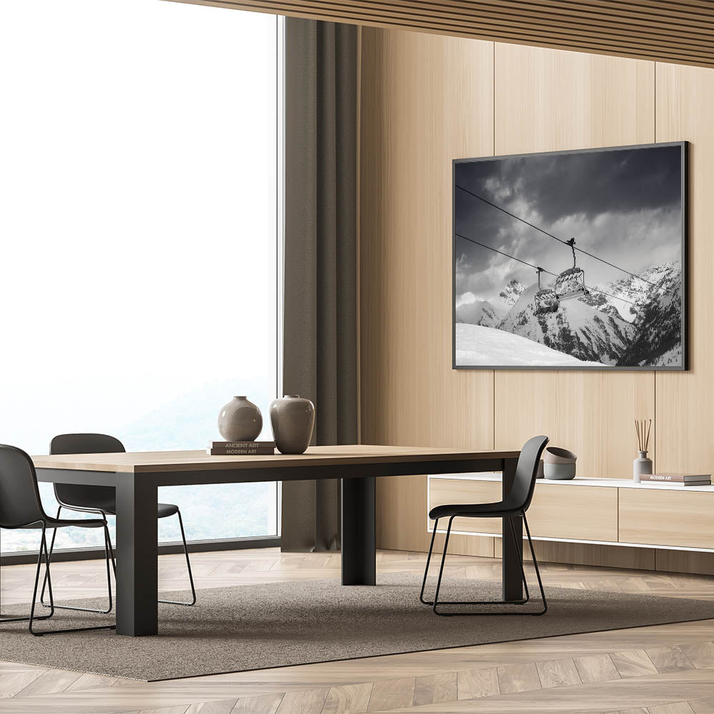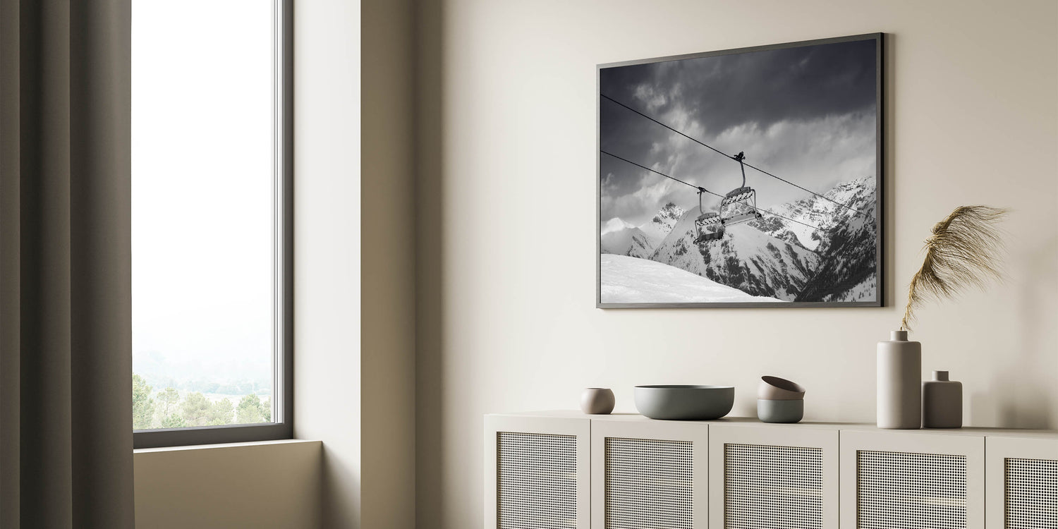 - High-resolution print capturing the dramatic atmosphere of the snowy mountains and ski lift