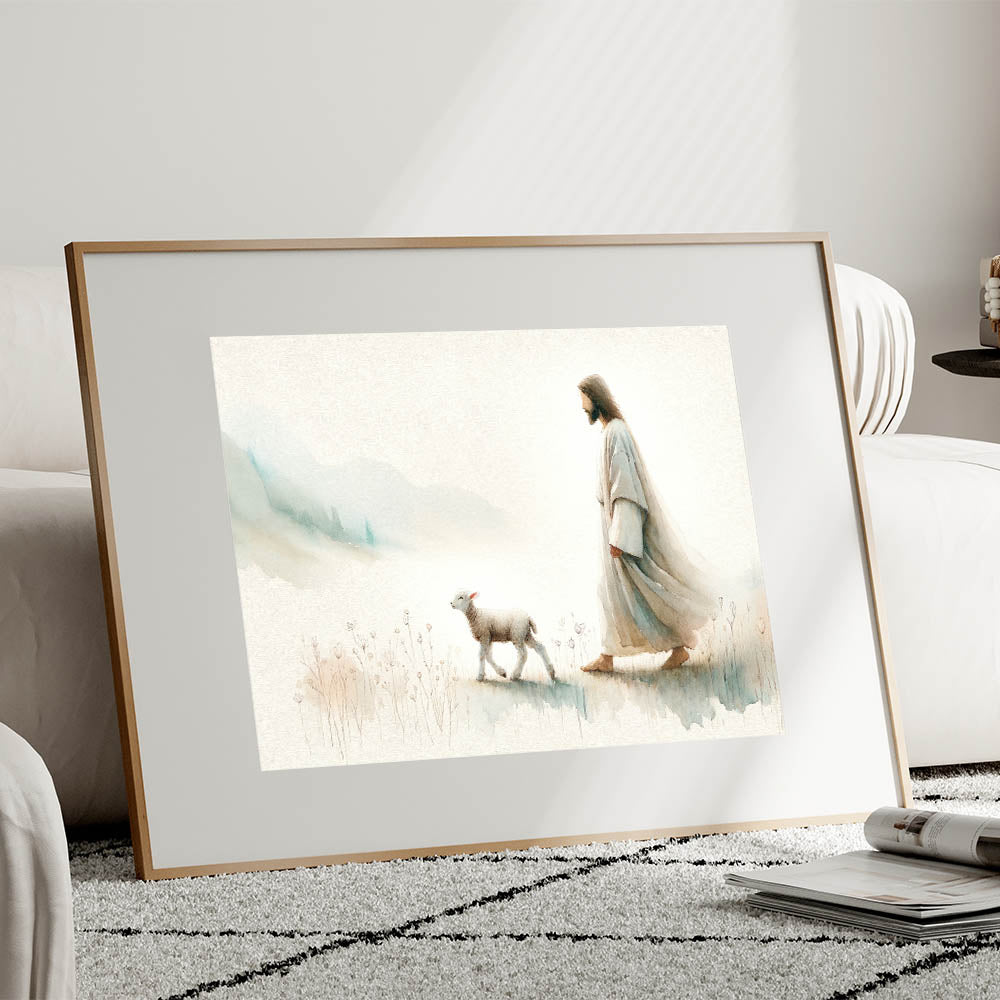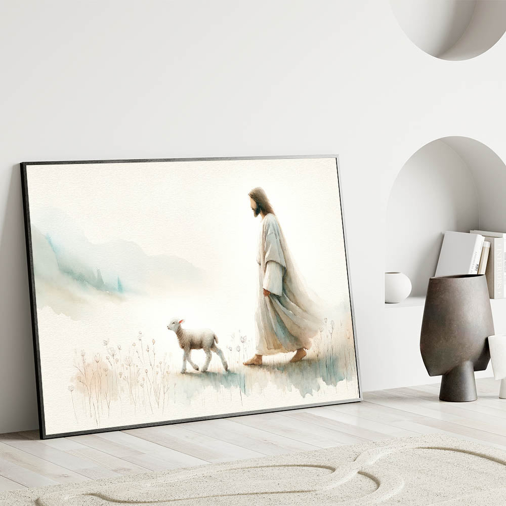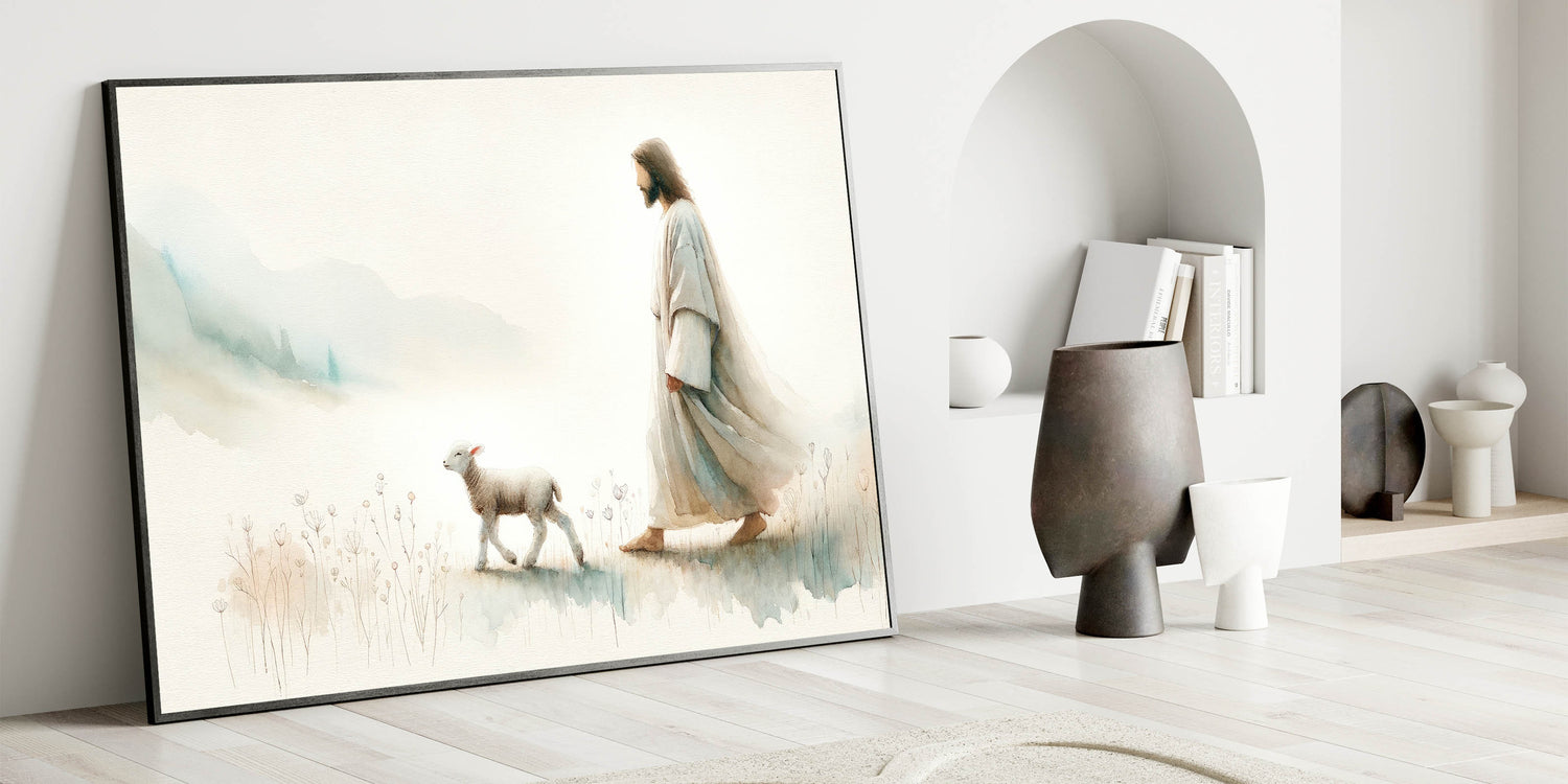 Immerse your home in tranquility with this captivating Shepherd and Lamb Wall Art. This beautiful piece of art portrays a serene moment between a shepherd and a lamb, symbolizing peace, guidance, and the simplicity of pastoral life. The soft, muted tones of this artwork bring a gentle and calming ambiance to any space, making it a perfect addition to farmhouse, rustic, or spiritual-themed decor.