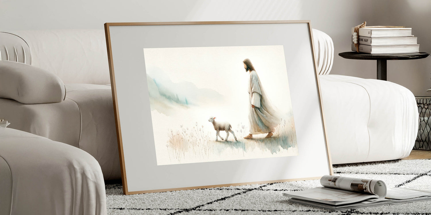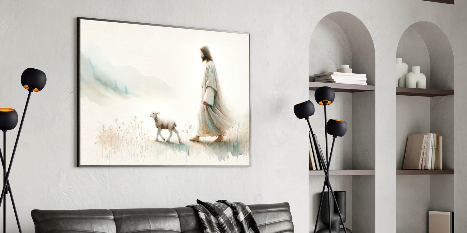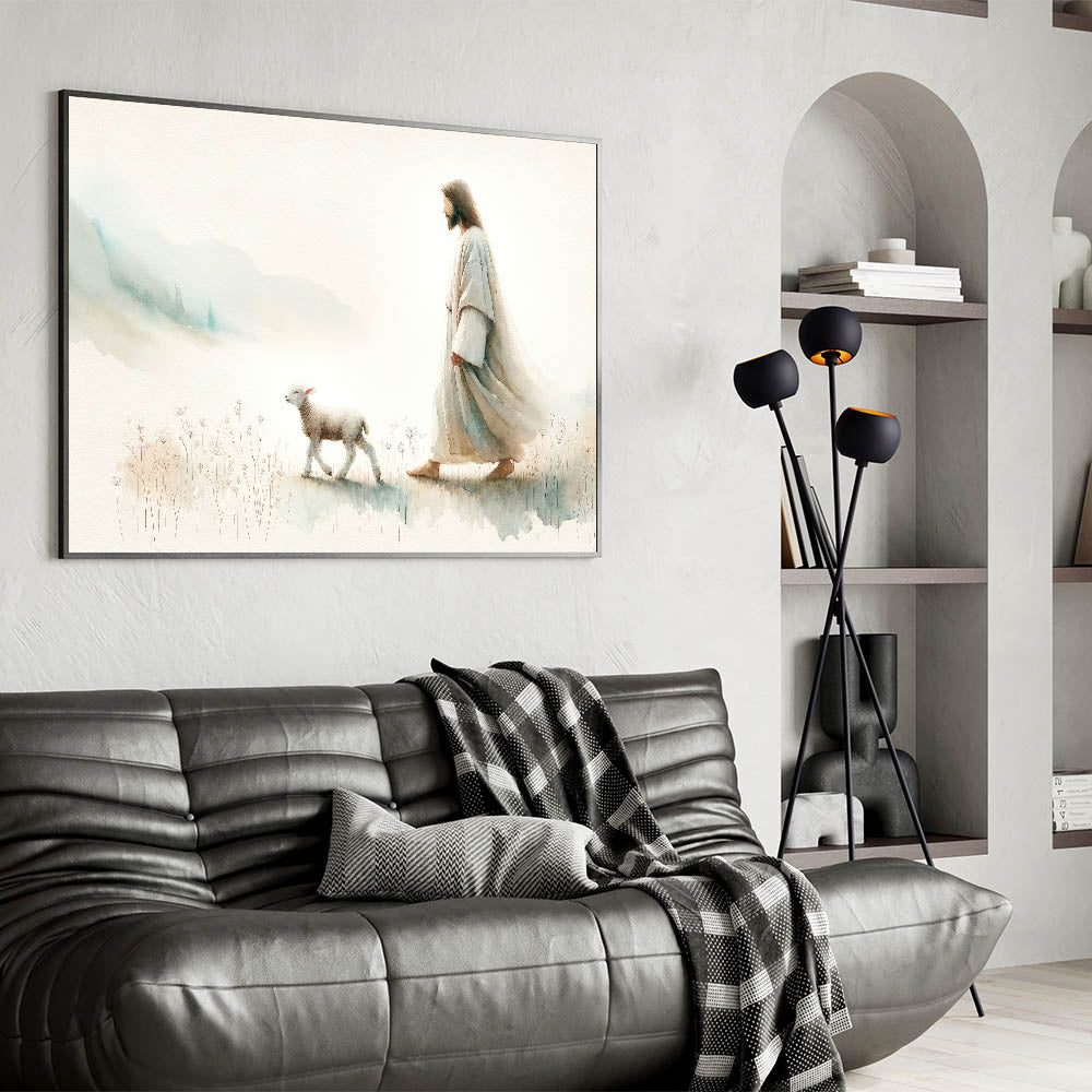 Immerse your home in tranquility with this captivating Shepherd and Lamb Wall Art. This beautiful piece of art portrays a serene moment between a shepherd and a lamb, symbolizing peace, guidance, and the simplicity of pastoral life. The soft, muted tones of this artwork bring a gentle and calming ambiance to any space, making it a perfect addition to farmhouse, rustic, or spiritual-themed decor.