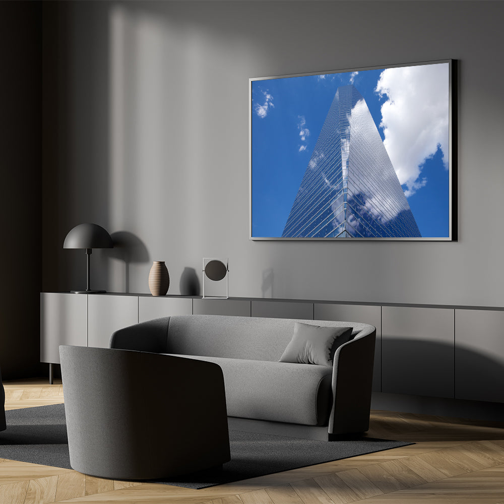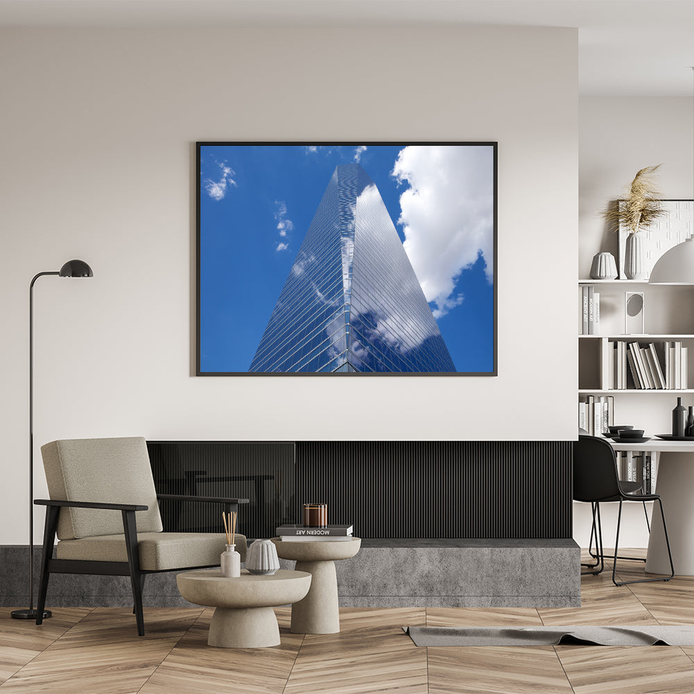 Experience the grandeur of urban architecture with this striking skyscraper photography wall art. This artwork captures a towering building reflecting the bright blue sky and fluffy white clouds, creating a mesmerizing blend of glass and sky. The sleek lines and mirror-like surfaces offer a modern and dynamic look, perfect for contemporary interiors., this piece provides flexibility to suit your decor preferences.