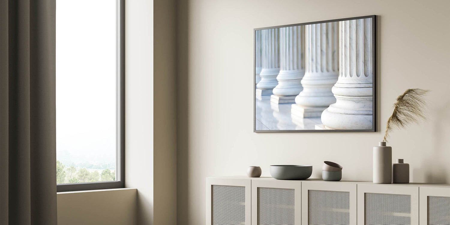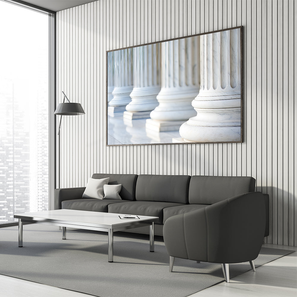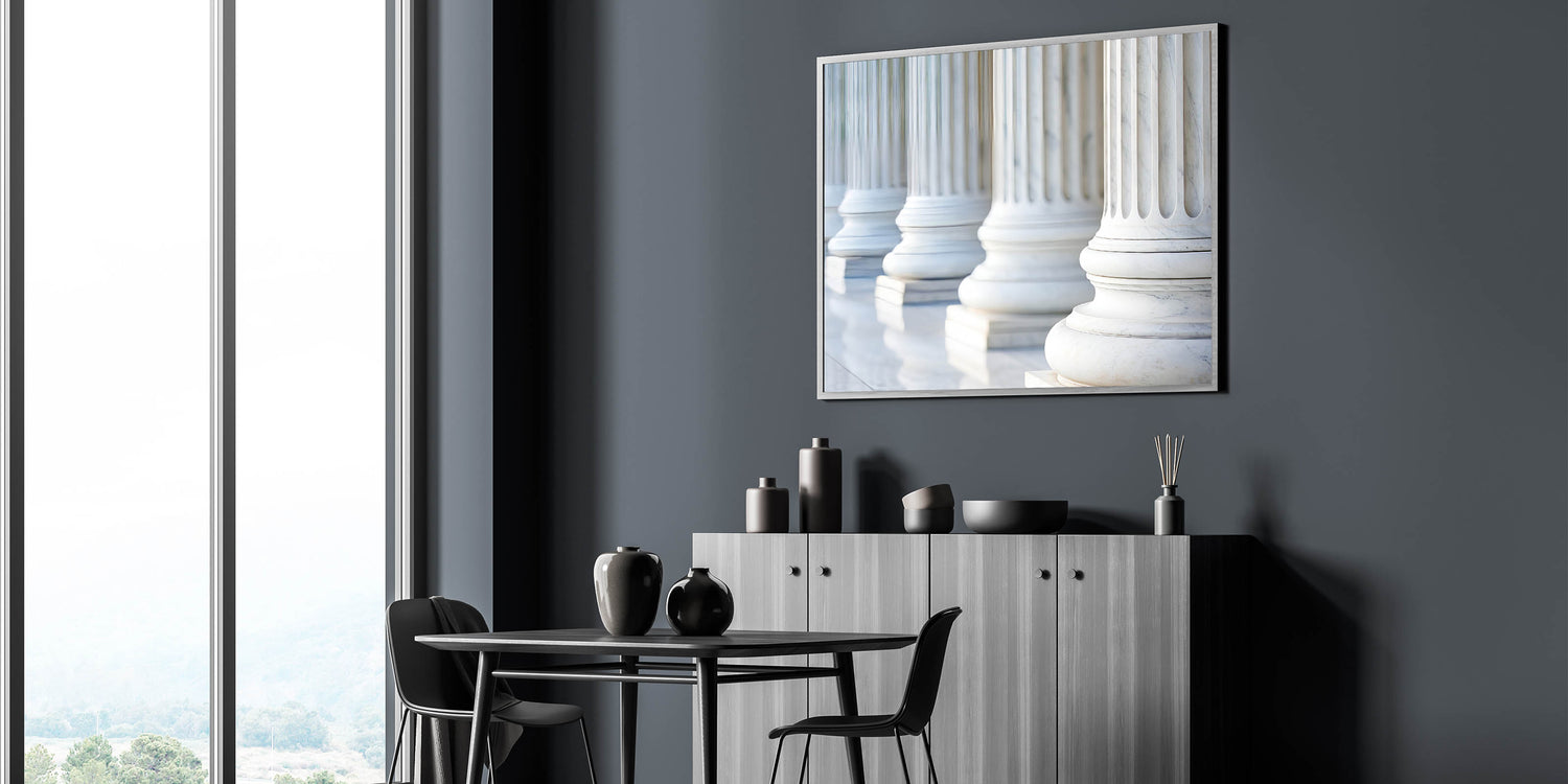 This artwork is perfect for anyone looking to infuse their space with a sense of classical elegance. The sleek marble columns create a captivating focal point, making it a versatile addition to any room, from the living room to the office.