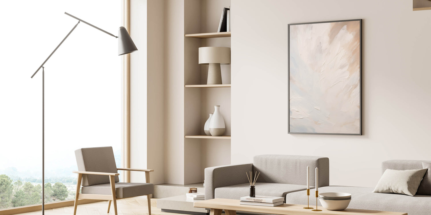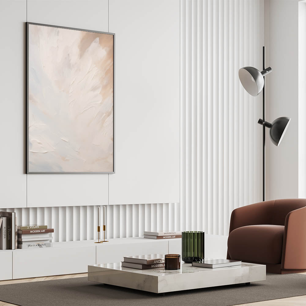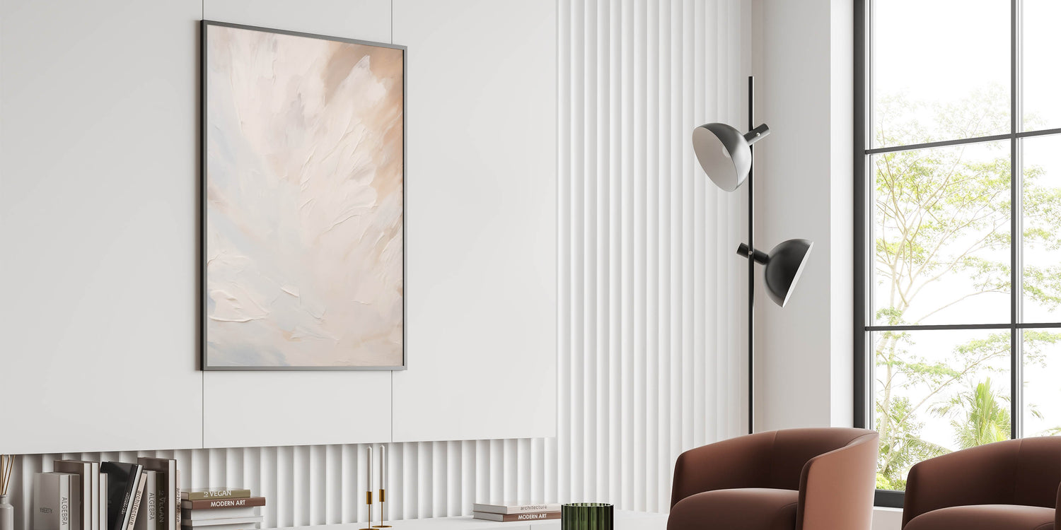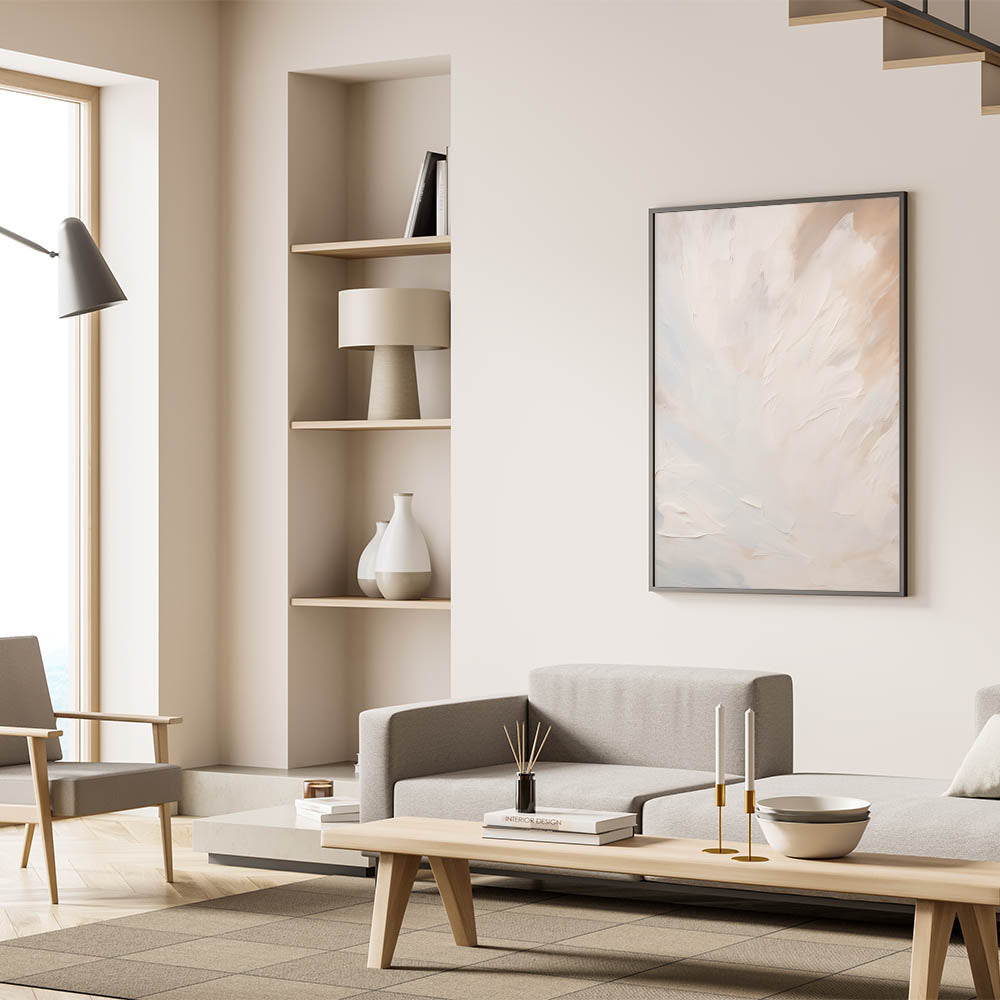 Elevate the ambiance of your space with this soft, minimalist abstract art piece. Featuring smooth, flowing textures in gentle shades of white and beige, this artwork exudes a sense of calm and serenity. The ethereal design makes it a perfect choice for those who appreciate subtle elegance and the soothing effect of light, neutral tones.