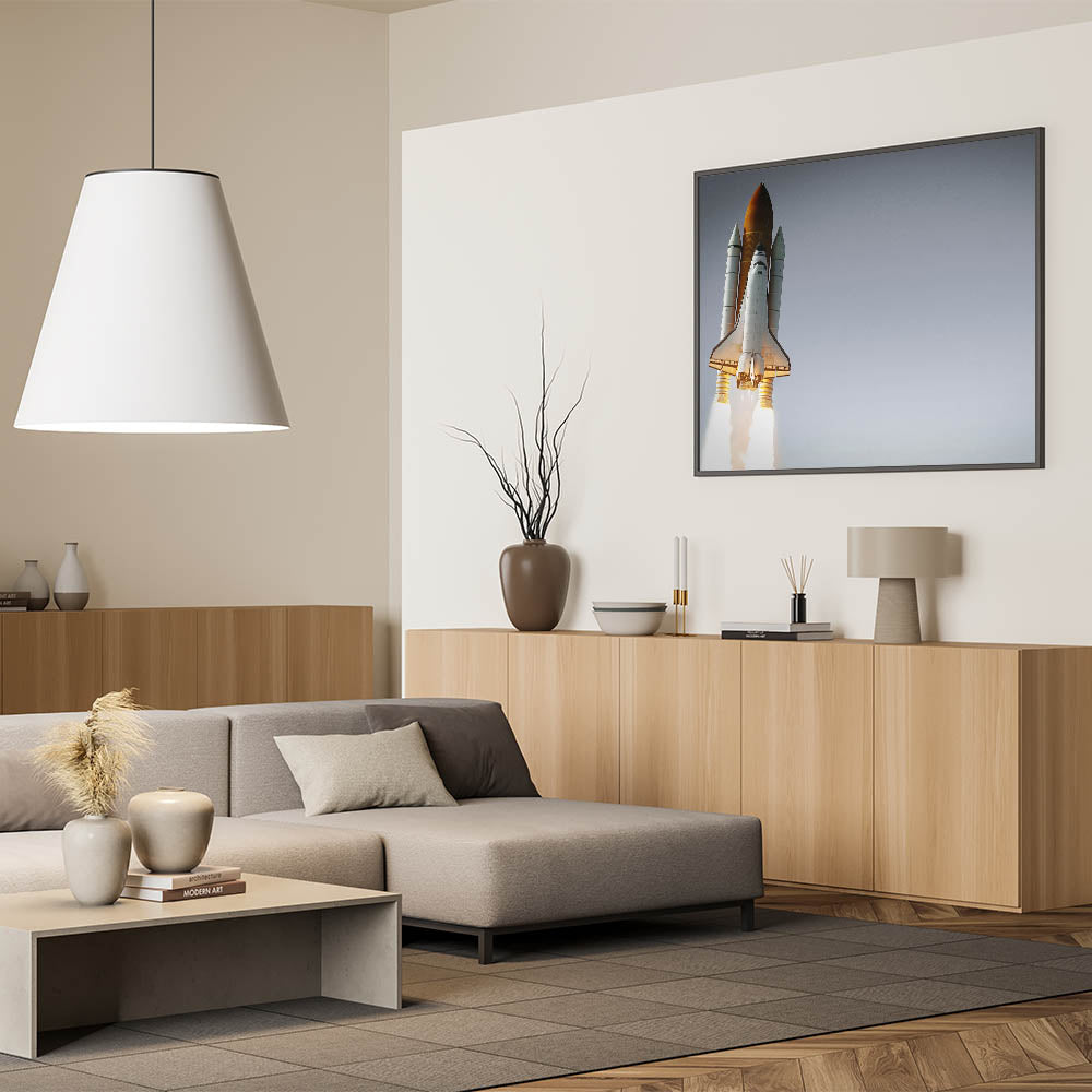 Experience the exhilarating power of space travel with this striking wall art depicting a space shuttle launch. The clean, minimalist backdrop contrasts beautifully with the intricate details of the shuttle, creating a modern and captivating piece. Perfect for those who are fascinated by space exploration, this artwork will make a bold statement in any room, whether it’s your living room, office, or study.