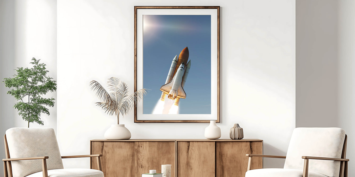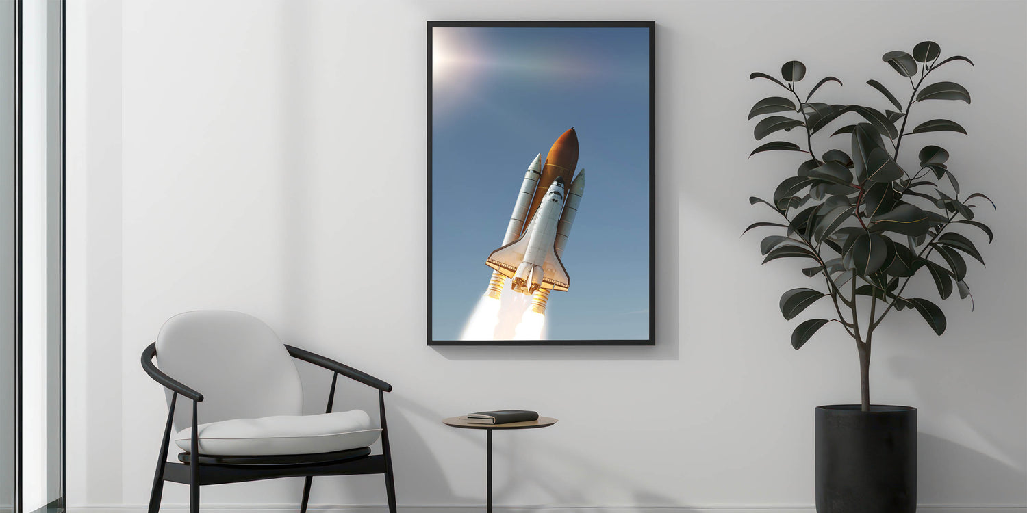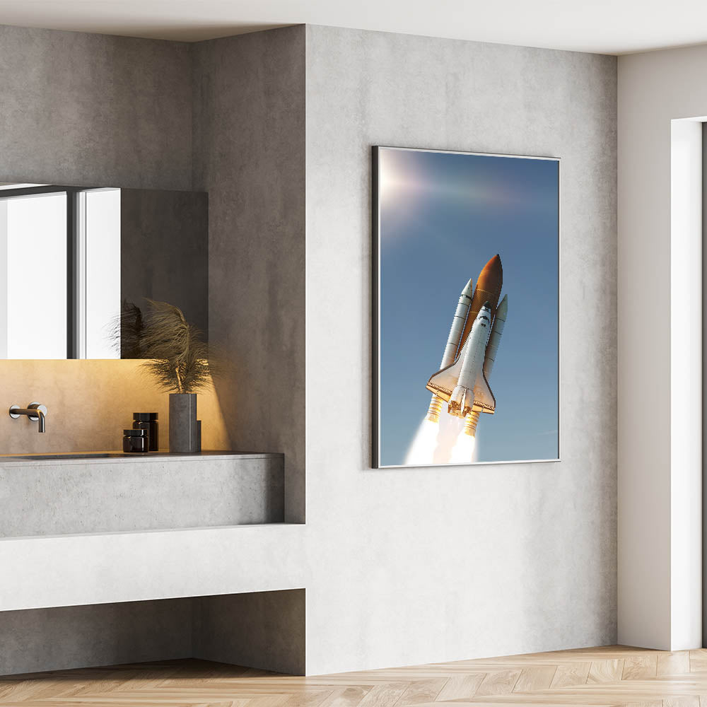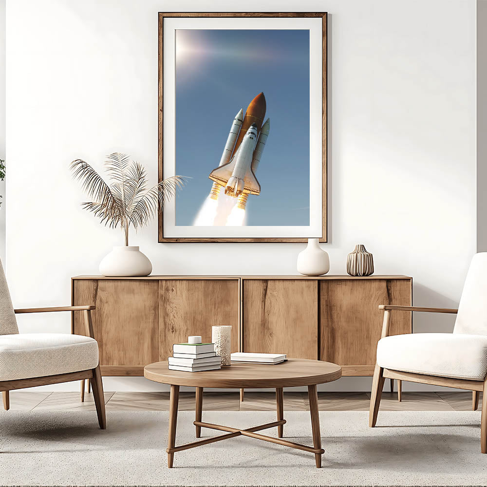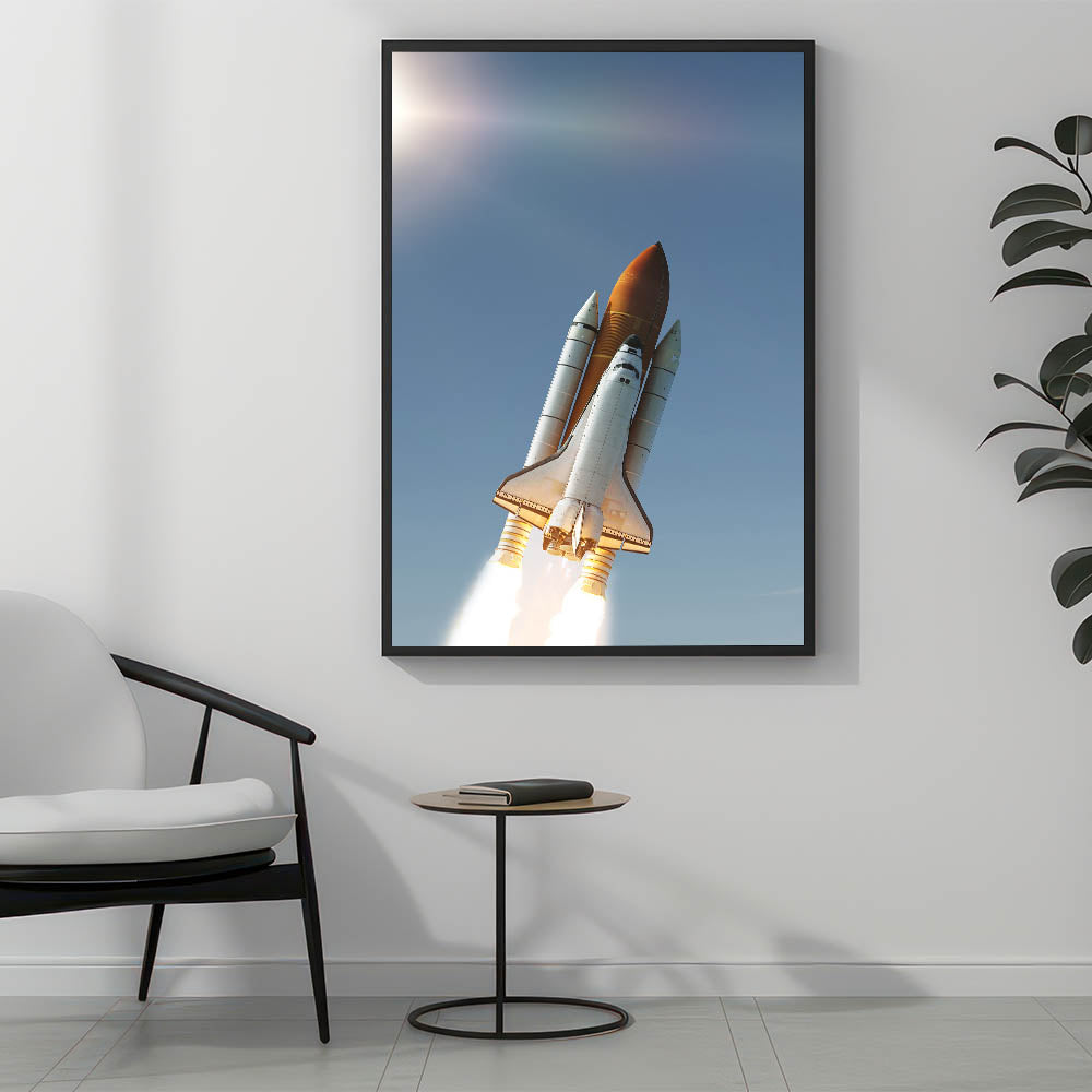 Elevate your space with this powerful wall art capturing the ascent of a space shuttle into the sky. The bright sunlight and clear blue backdrop highlight the shuttle’s dynamic movement, creating a visually striking and inspiring piece. Perfect for those who are passionate about space exploration and modern design, this artwork will add a sense of adventure and innovation to any room.
