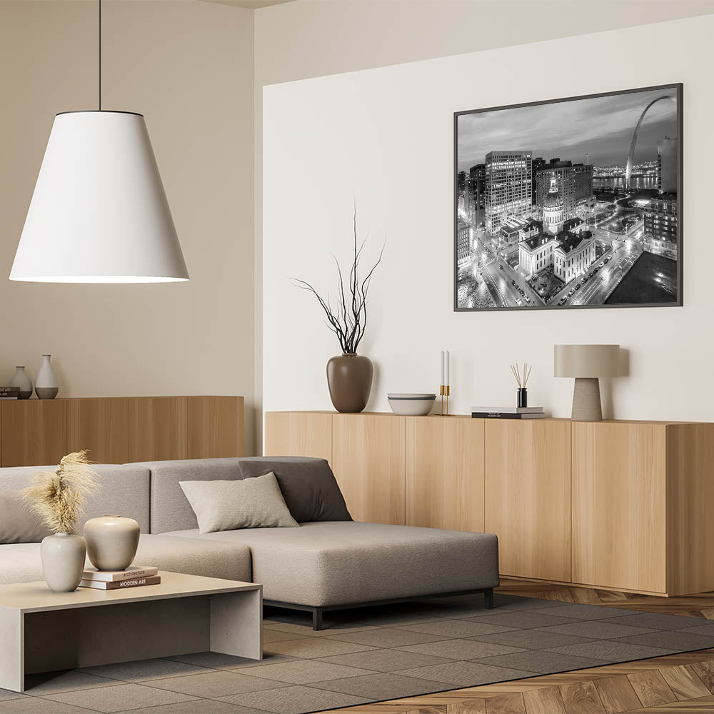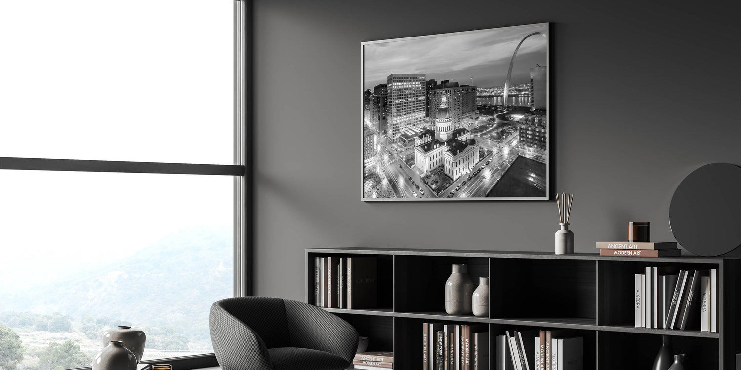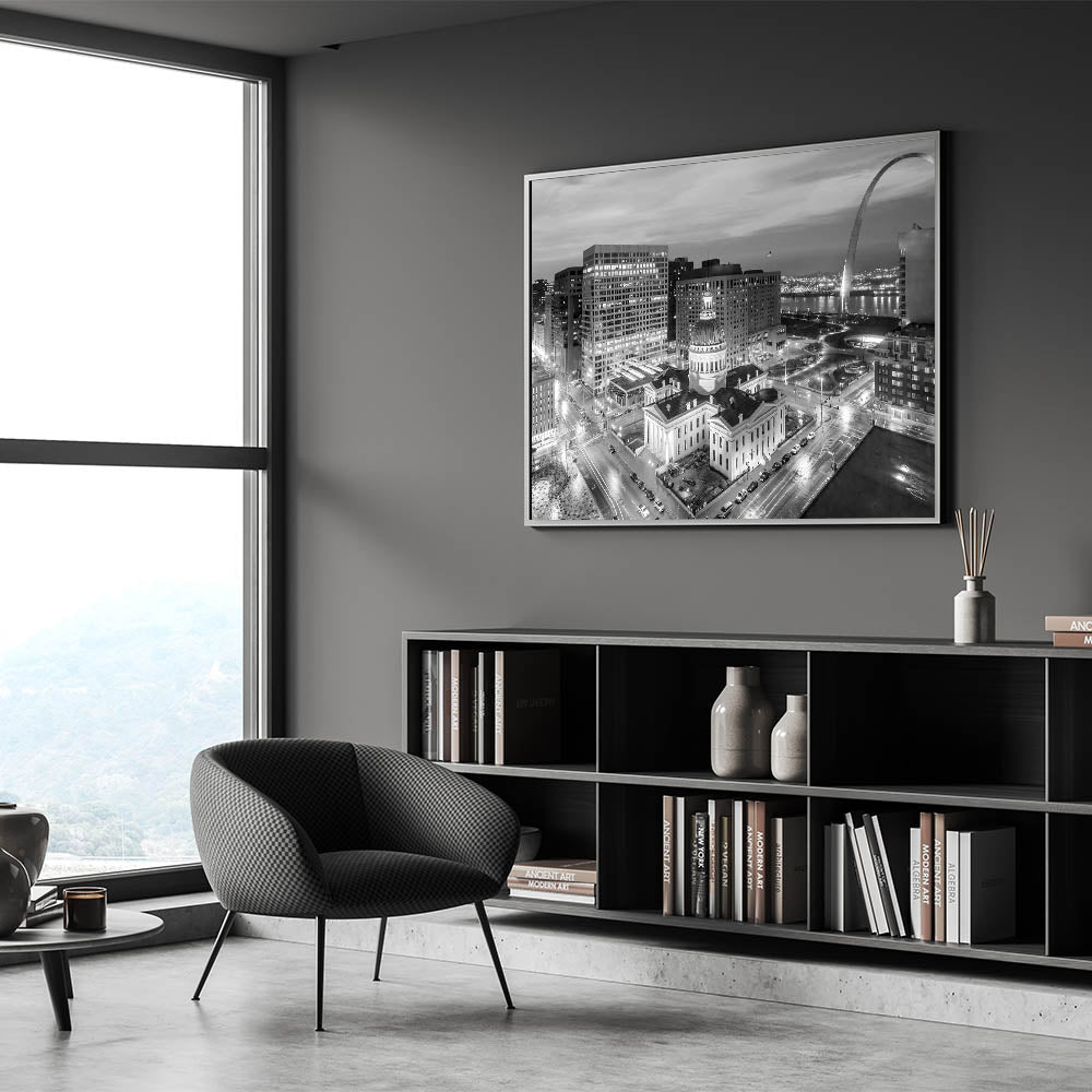 Capture the timeless beauty of St. Louis with our stunning black and white photography wall art. This elegant piece showcases the historic Old Courthouse set against the modern skyline, with the iconic Gateway Arch rising in the background. The monochromatic palette highlights the architectural details and adds a classic touch to any decor, making it a perfect addition to your home or office.