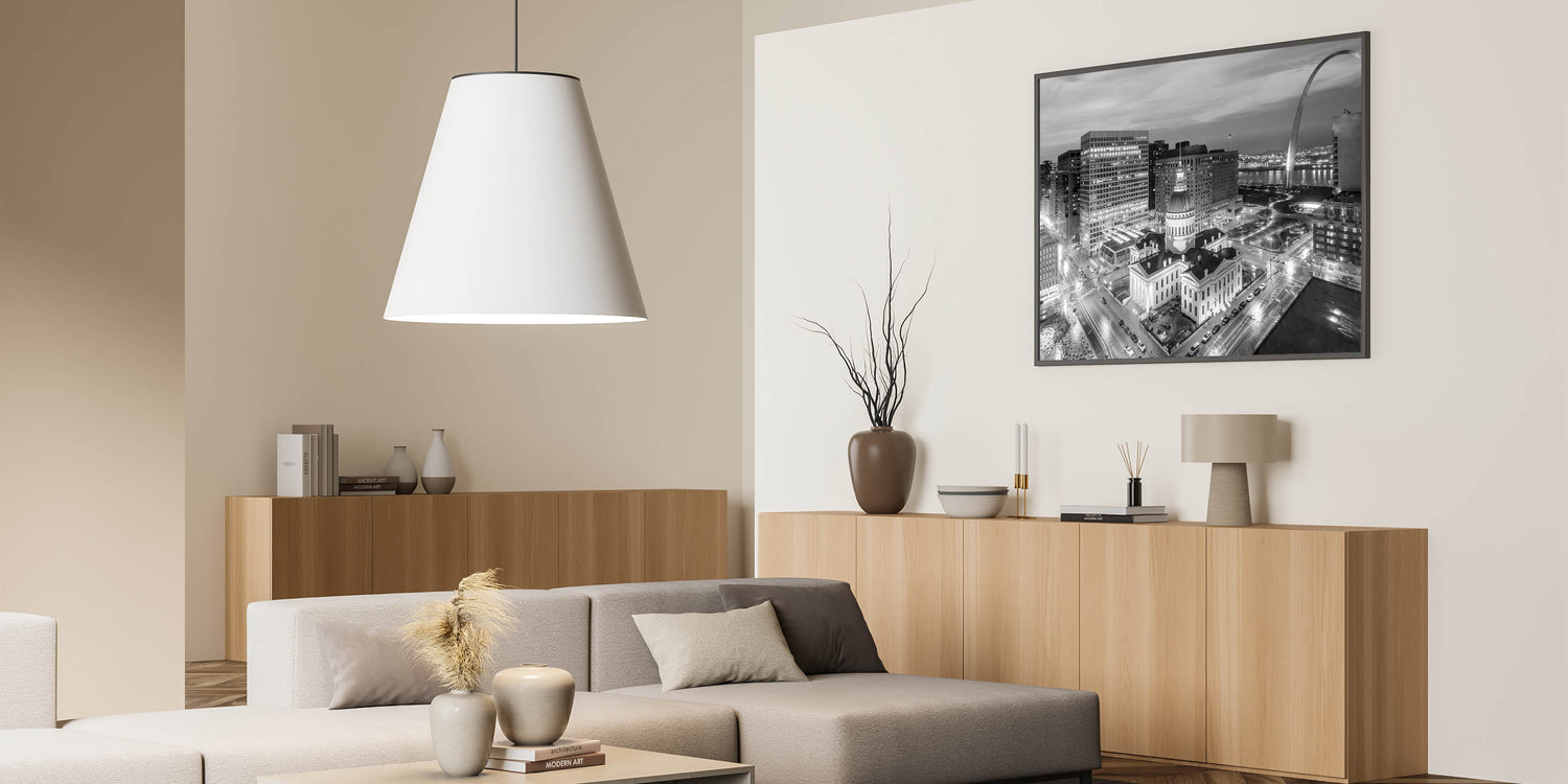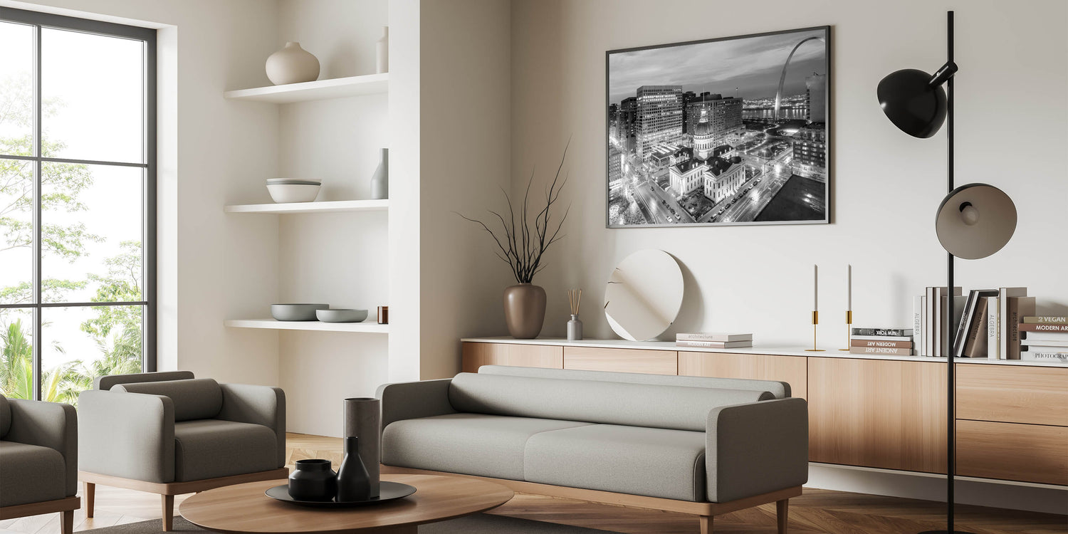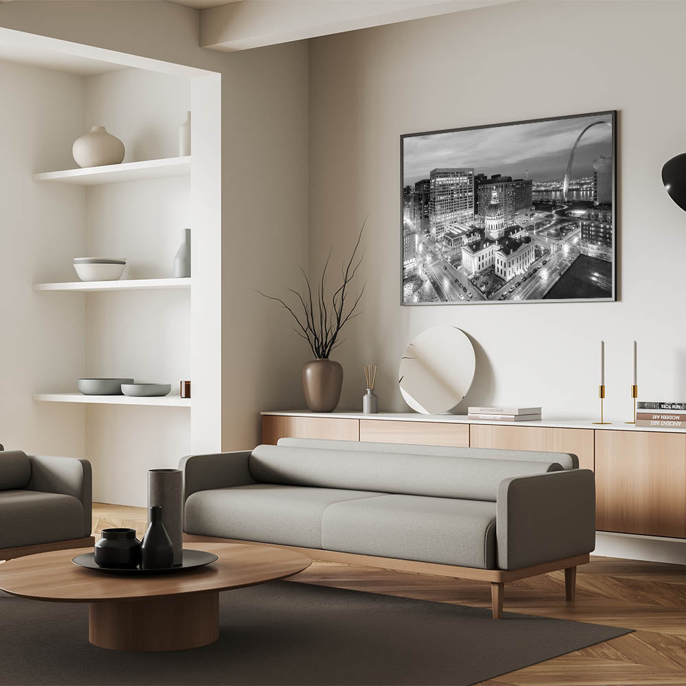 Capture the timeless beauty of St. Louis with our stunning black and white photography wall art. This elegant piece showcases the historic Old Courthouse set against the modern skyline, with the iconic Gateway Arch rising in the background. The monochromatic palette highlights the architectural details and adds a classic touch to any decor, making it a perfect addition to your home or office.