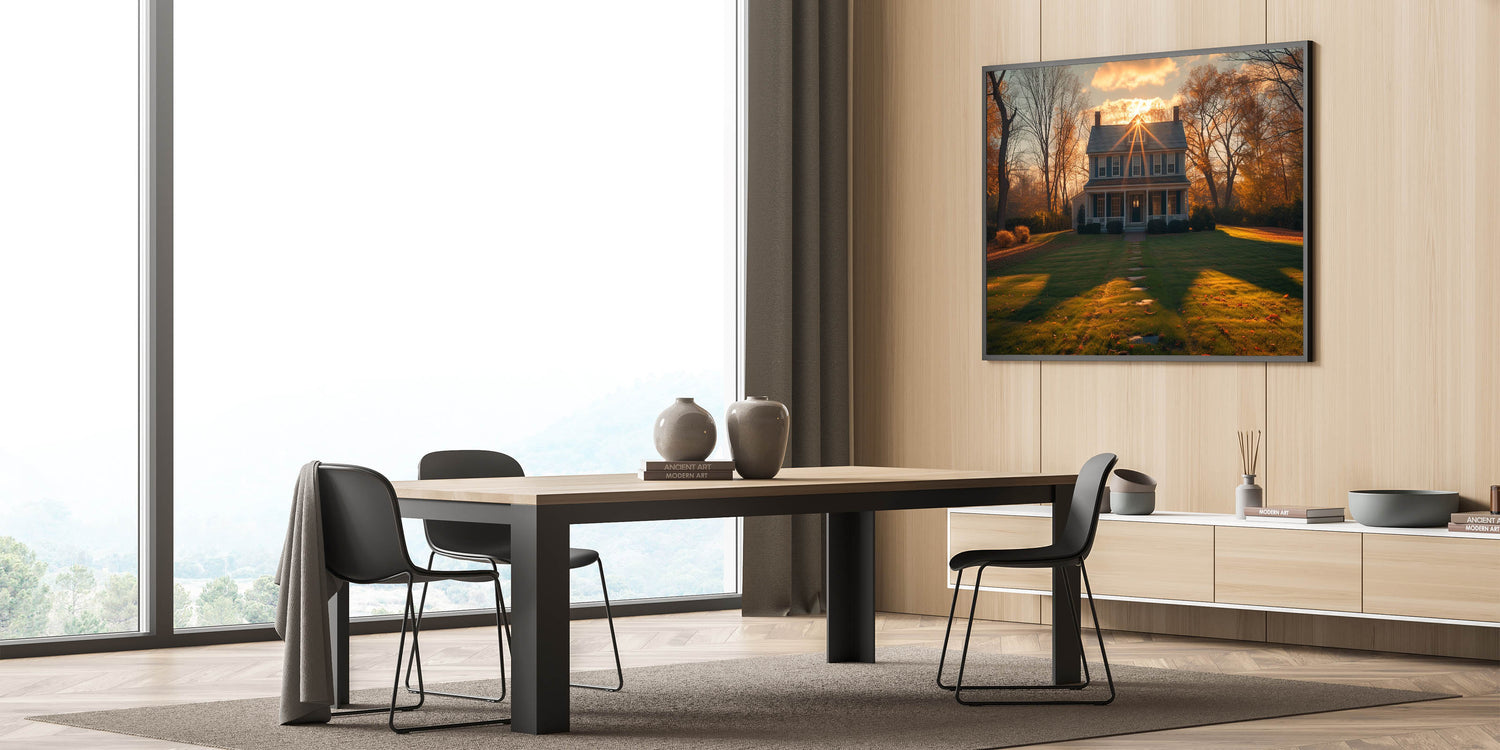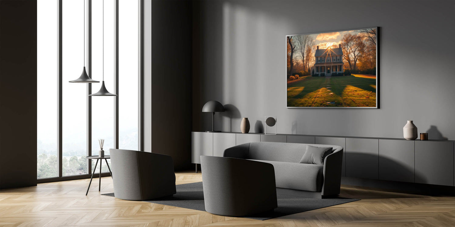 Transform your living space with the timeless beauty of this house wall art. Capturing a classic home bathed in the golden rays of the setting sun, this artwork radiates warmth and tranquility. The sunlit scene, with its well-manicured lawn and majestic trees, evokes a sense of peace and nostalgia, making it a perfect addition to any room in need of a serene and elegant touch.