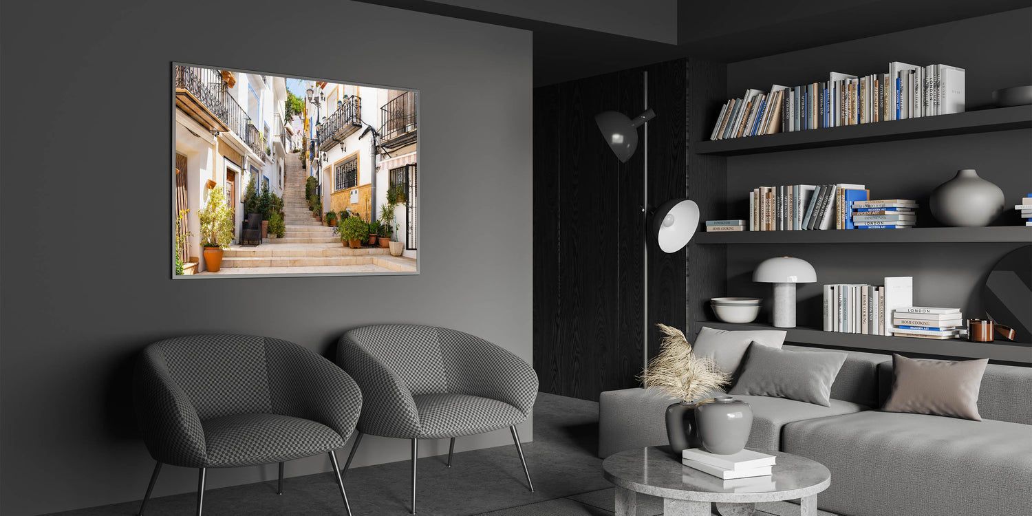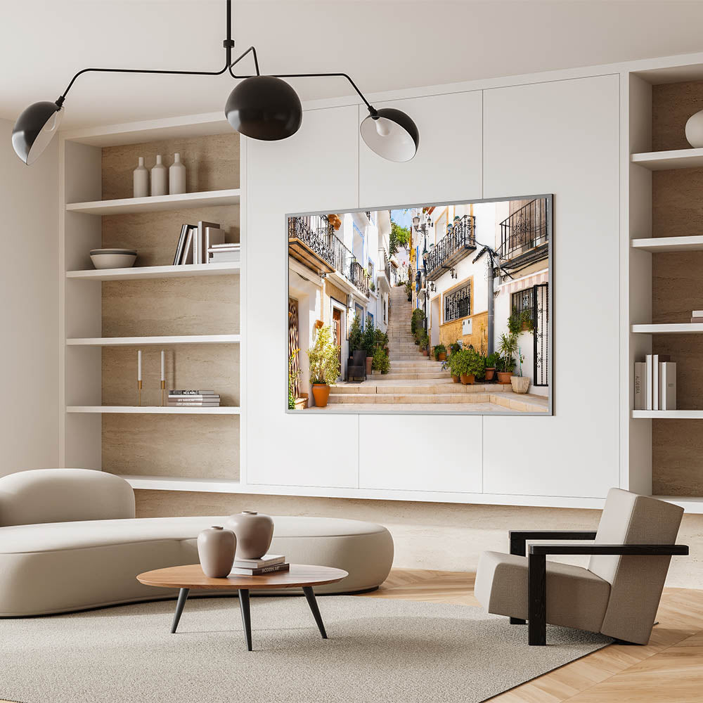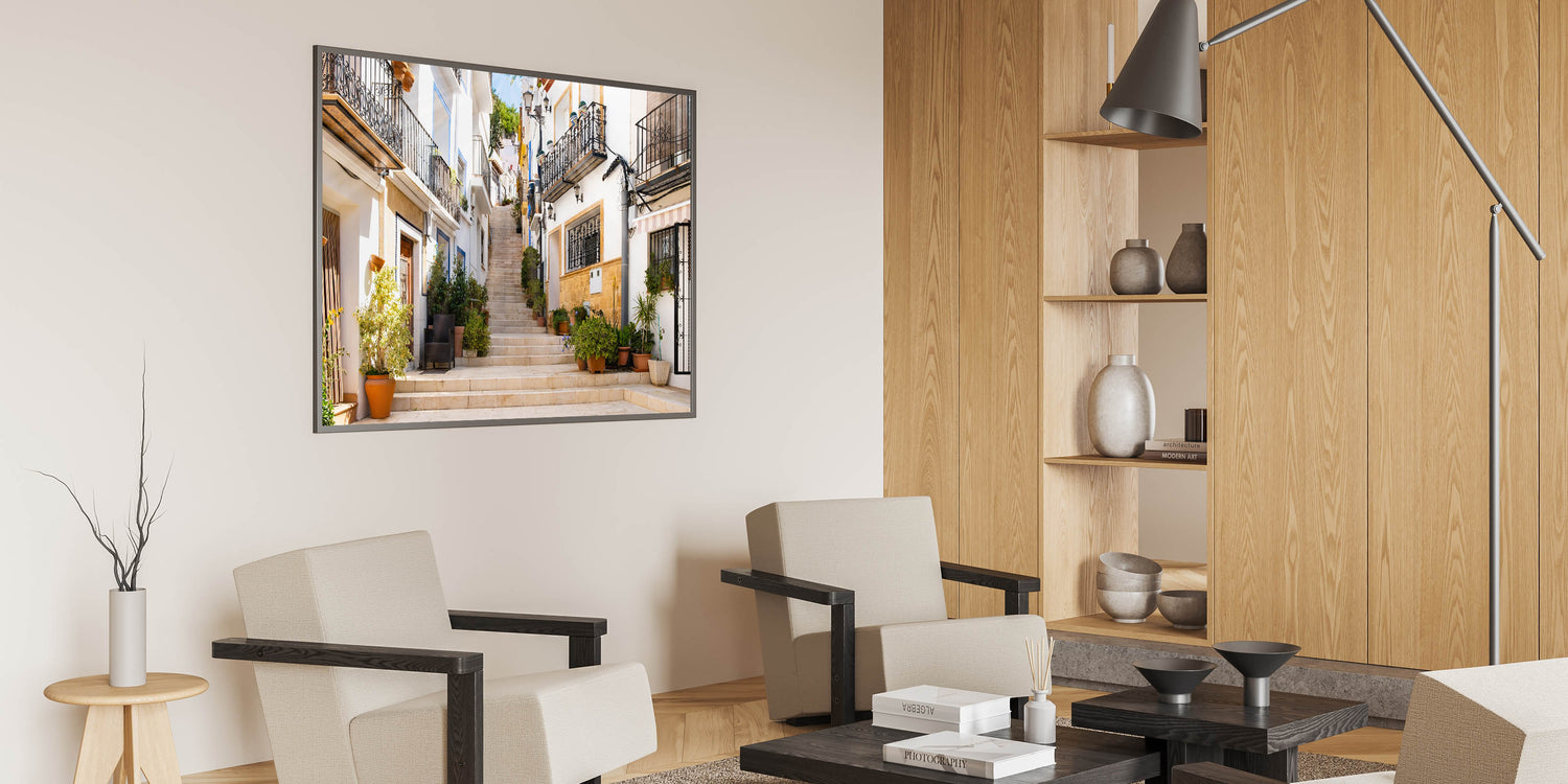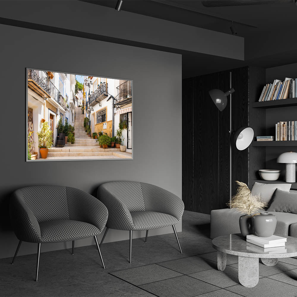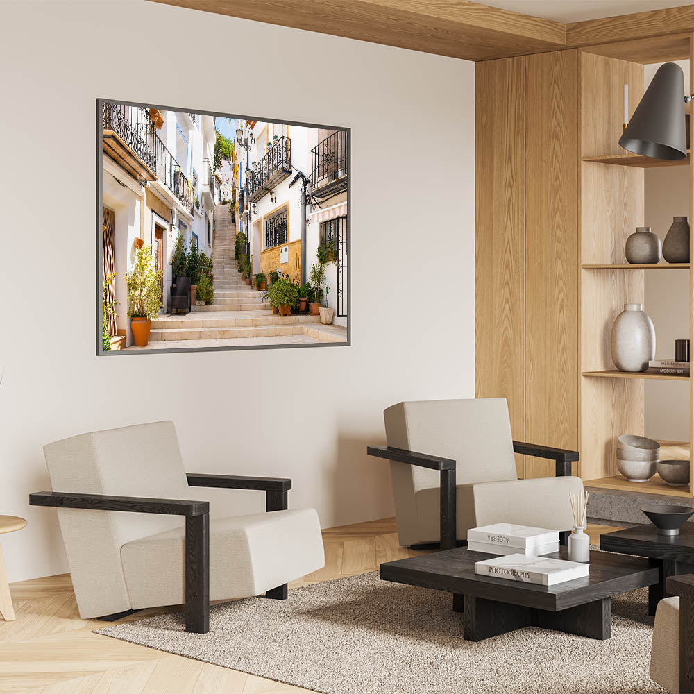 - Captures the essence of a sunlit Spanish street, ideal for modern and traditional spaces