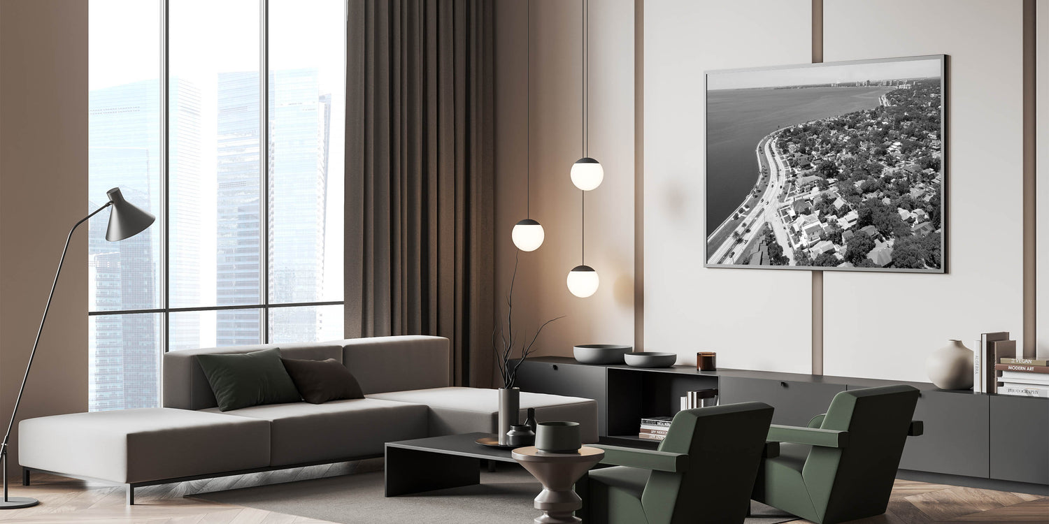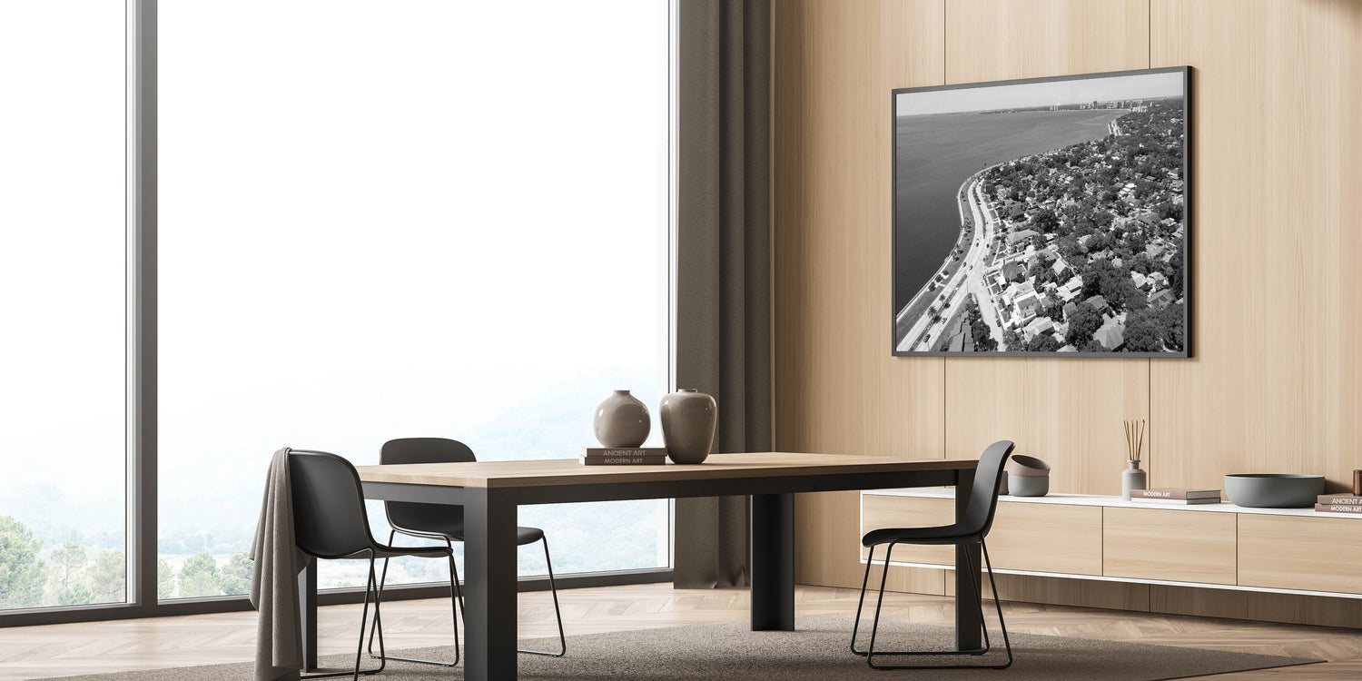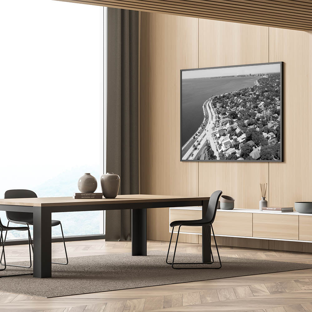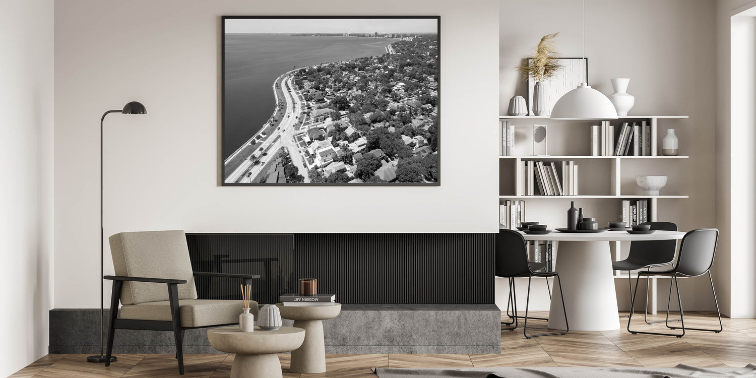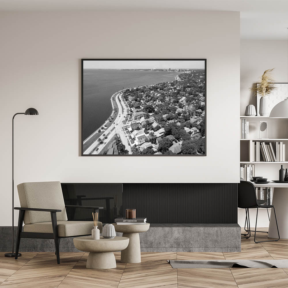 Immerse yourself in the timeless elegance of Tampa Bay with this classic black and white wall art. This aerial view captures the serene curve of the coastline, bordered by charming homes and lush greenery, all set against the expansive waters of Tampa Bay. The monochrome effect enhances the nostalgic feel, making it a perfect piece for those who appreciate minimalist and sophisticated decor.