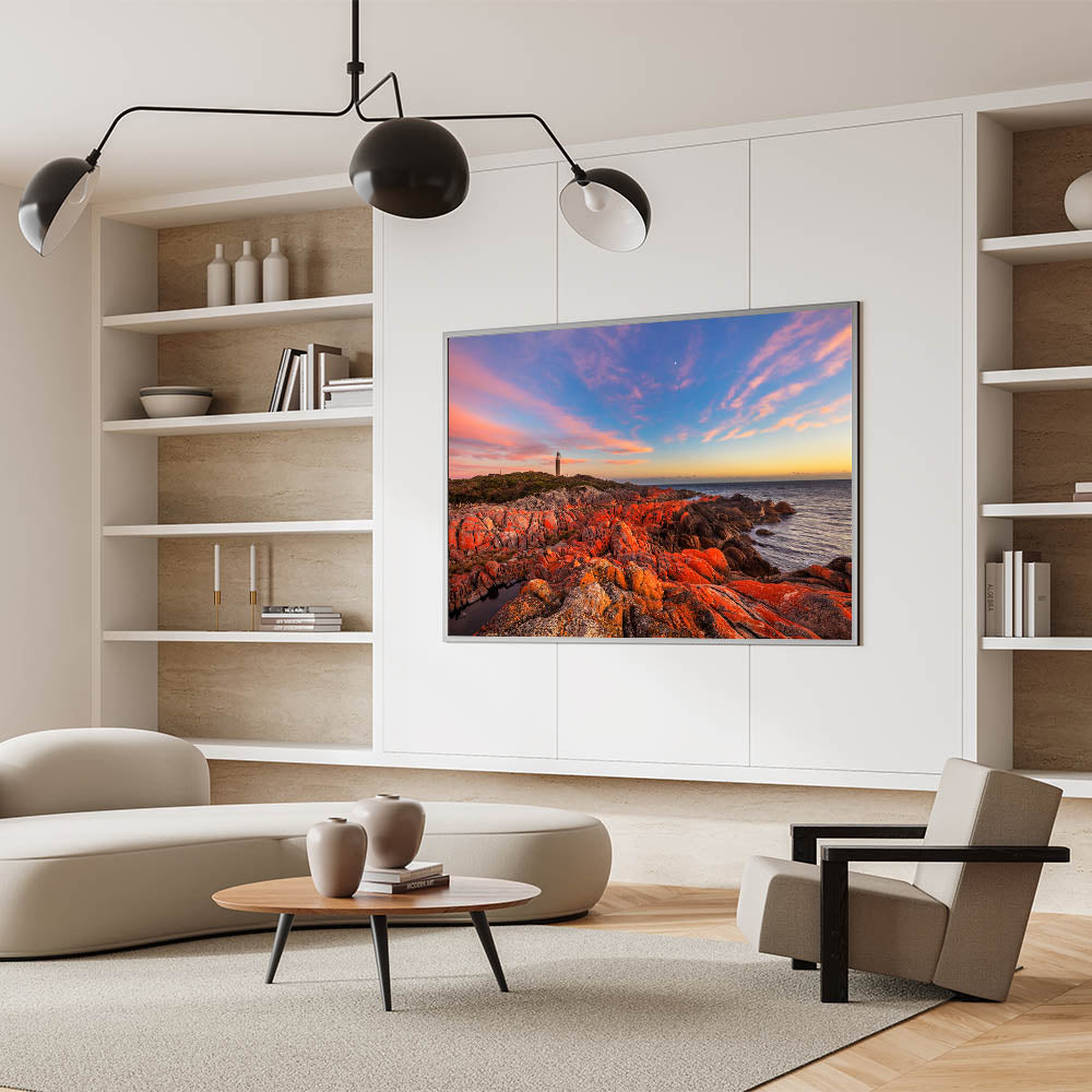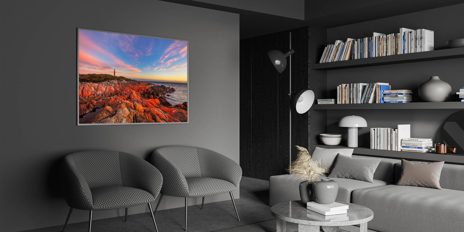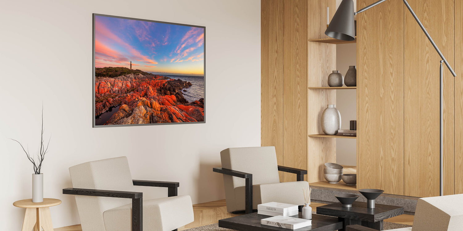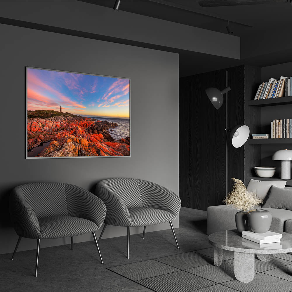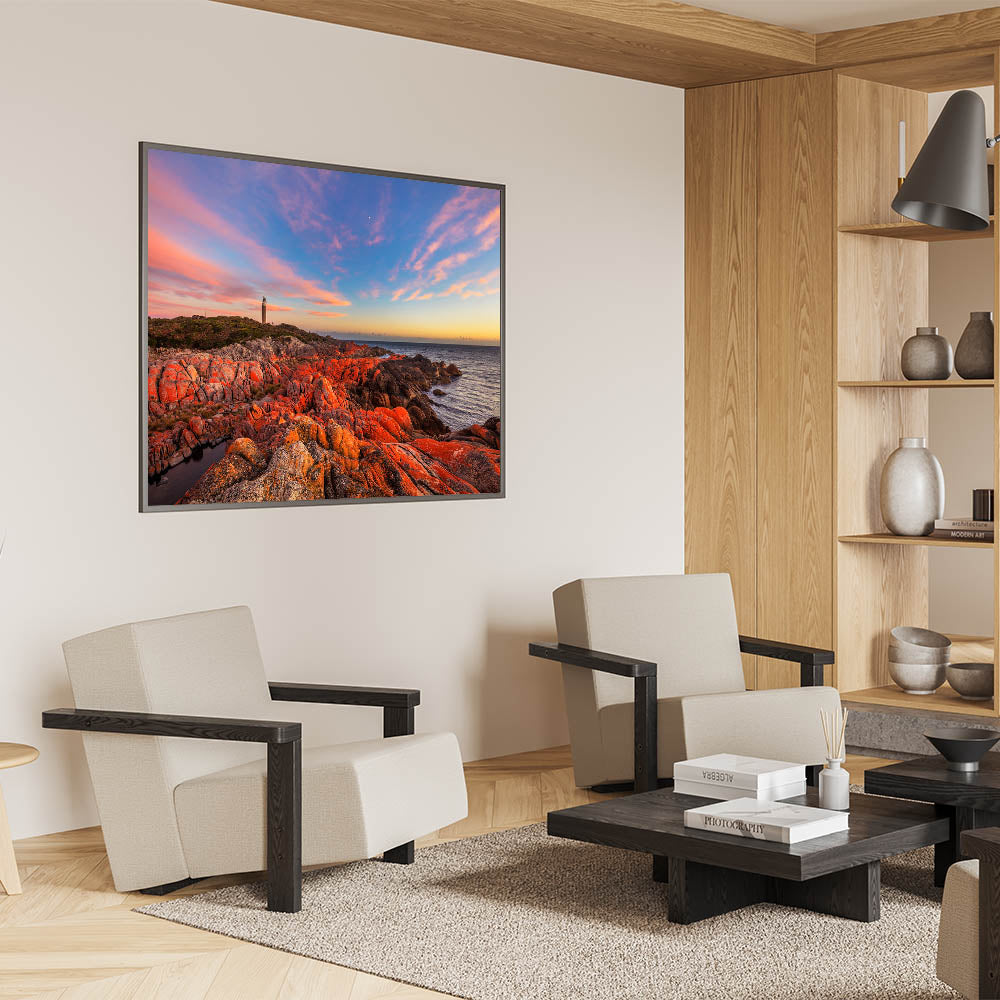 Bring the beauty of Tasmania’s iconic coastline into your space with this captivating Tasmania scenery print. This artwork showcases a peaceful lighthouse standing tall amidst the vibrant orange rocks and a calm sea at sunset. It's the perfect piece for anyone who appreciates Tasmanian landscape art and the region’s stunning natural features.