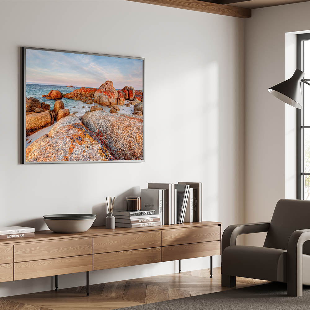 This Tasmanian landscape art captures the vibrant beauty of Tasmania’s iconic rocky shoreline. The striking orange and red hues of the lichen-covered rocks contrast with the soft blue ocean, creating a visually stunning coastal scene. The weathered textures of the rocks, paired with the peaceful water and sky, make this artwork ideal for anyone looking to bring a piece of Tasmania’s natural beauty into their space.