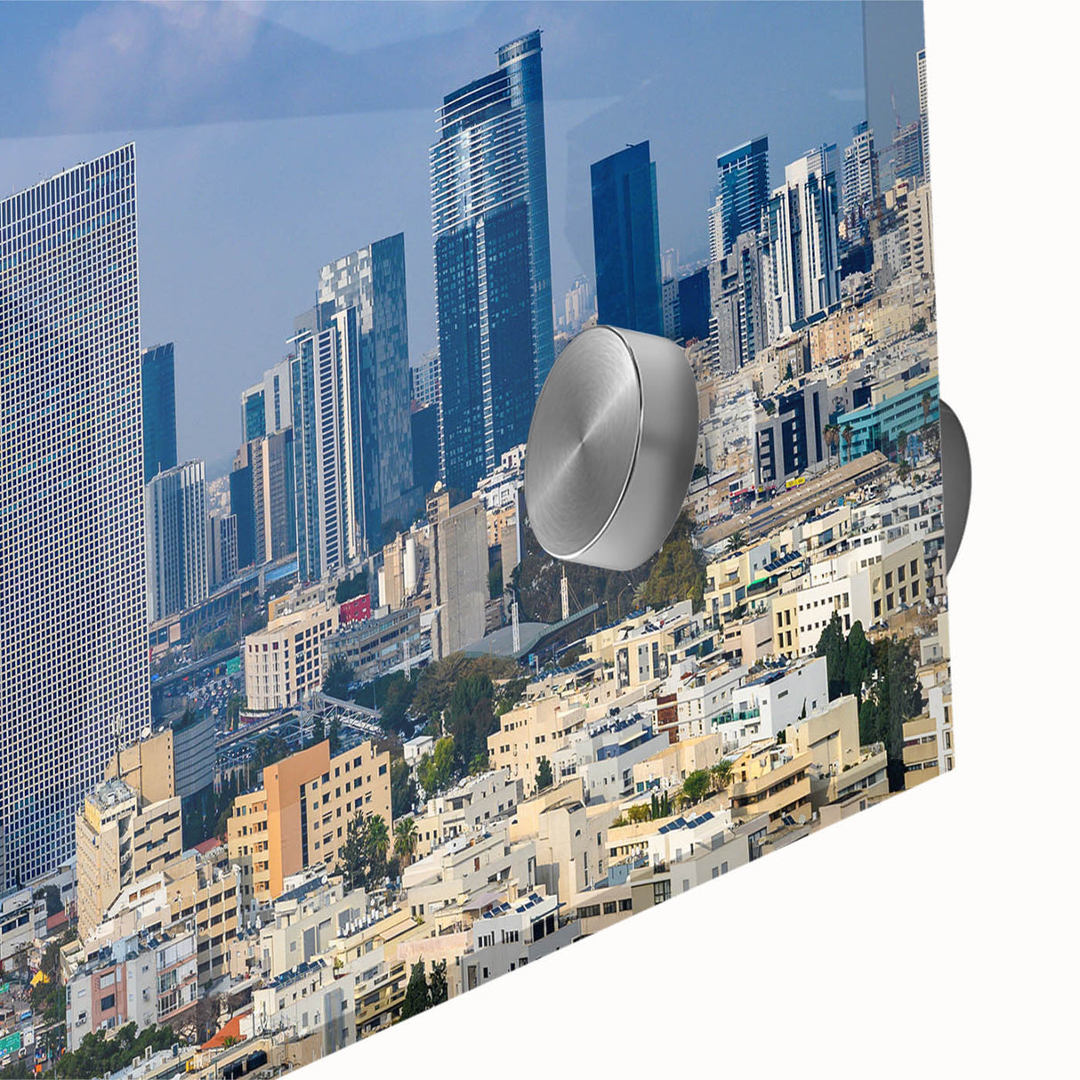 Showcase the modern beauty of Tel Aviv with this striking skyline wall art. This artwork captures the city’s iconic skyscrapers, including the uniquely structured Azrieli Towers and the bold, angular architecture of the surrounding high-rises. The clear blue sky and sleek glass façades reflect the city’s contemporary spirit, making this piece perfect for lovers of urban landscapes and modern architecture.