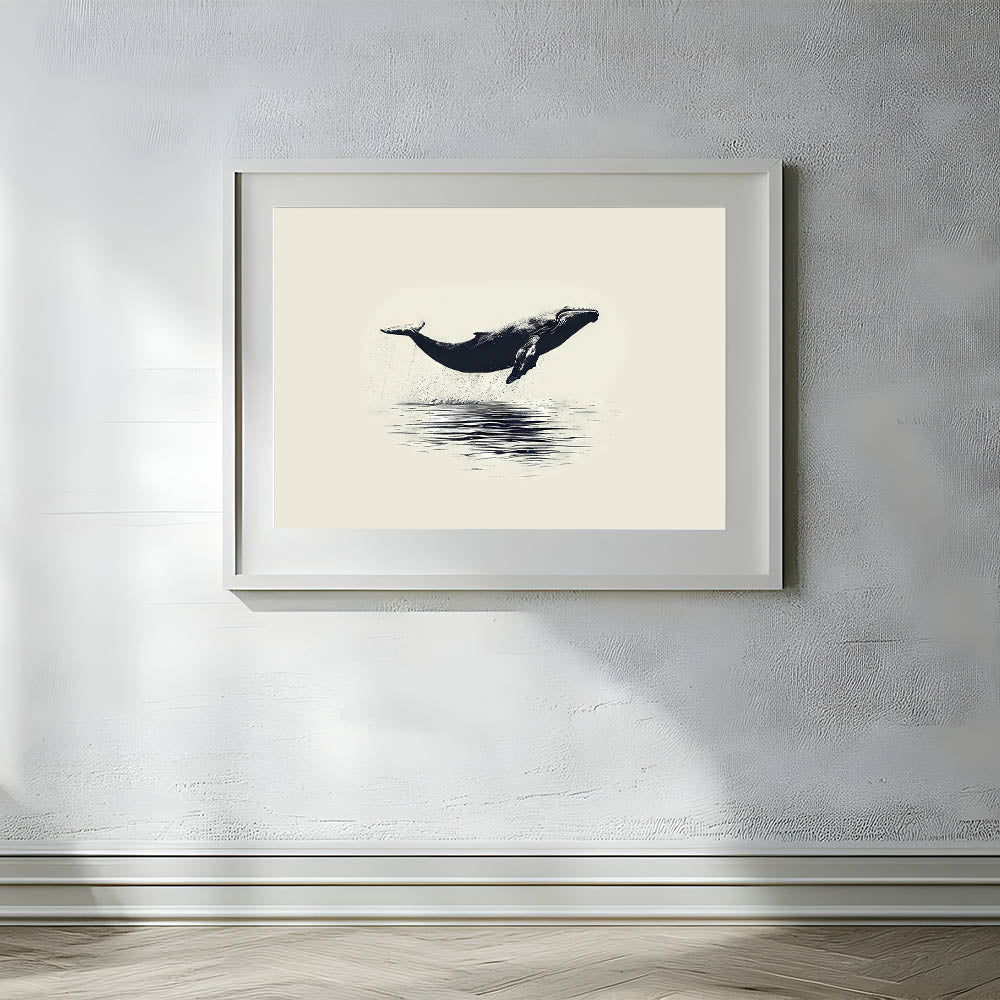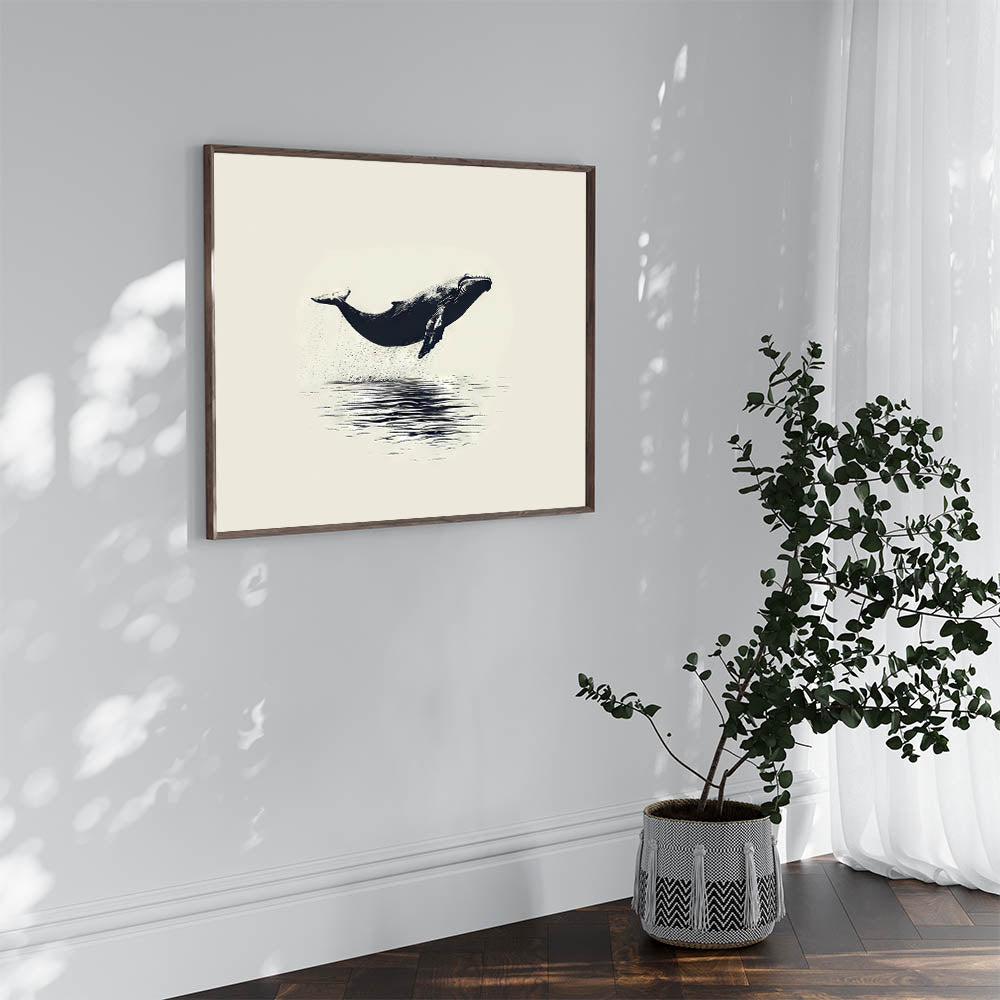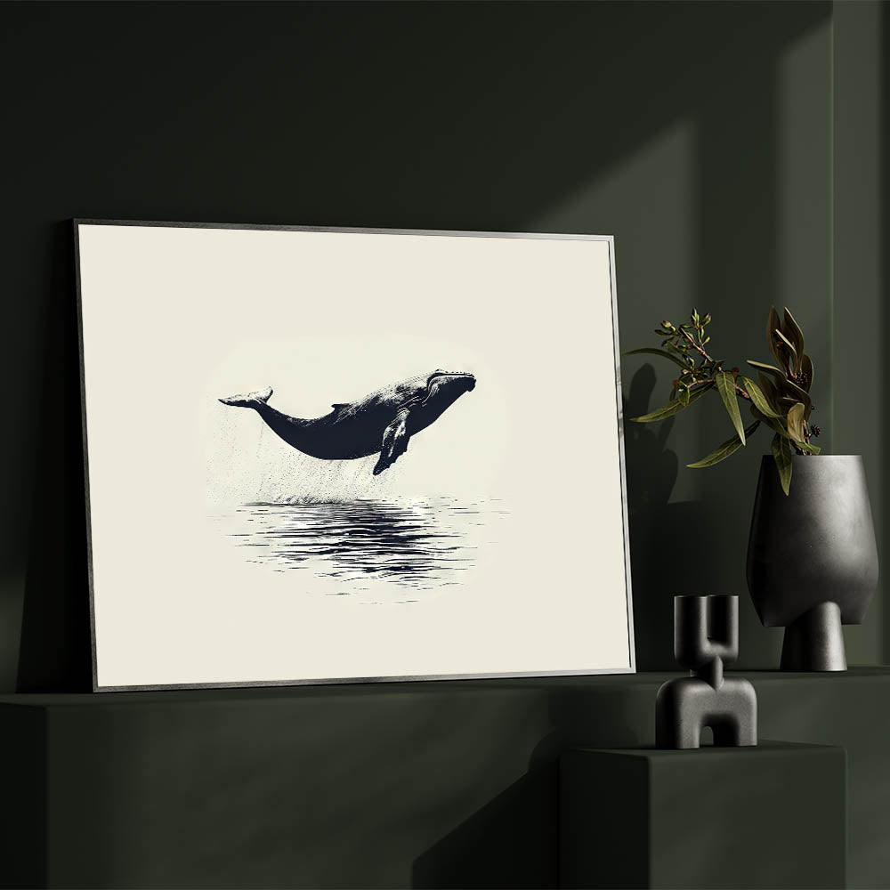 Add a touch of timeless elegance to your space with this minimalist orca wall art. This beautifully simple piece captures an orca in mid-leap, suspended above the still waters below. The clean lines and classic black-and-white palette make this artwork a versatile choice that can seamlessly blend with various decor styles.