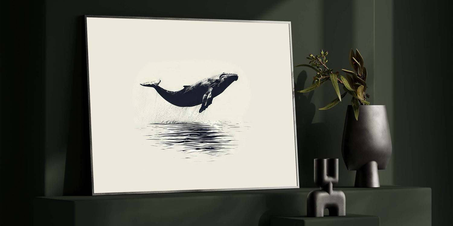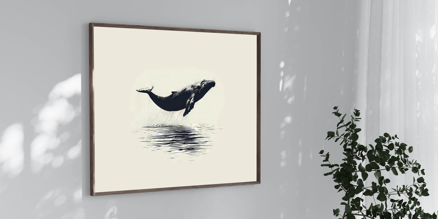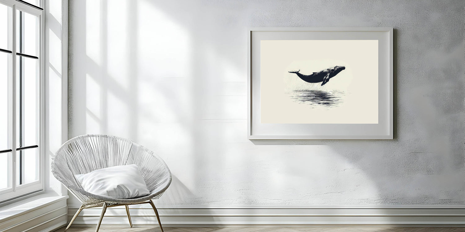 Add a touch of timeless elegance to your space with this minimalist orca wall art. This beautifully simple piece captures an orca in mid-leap, suspended above the still waters below. The clean lines and classic black-and-white palette make this artwork a versatile choice that can seamlessly blend with various decor styles.