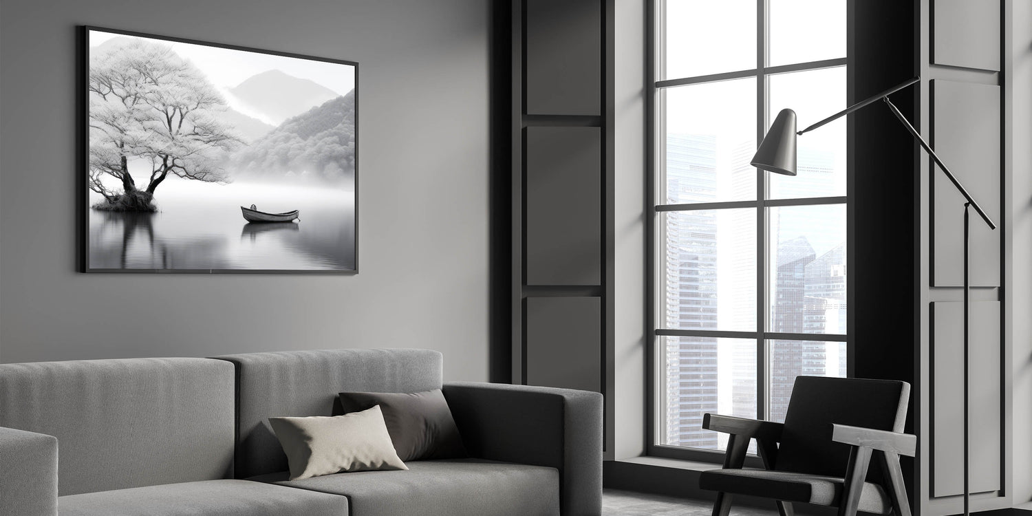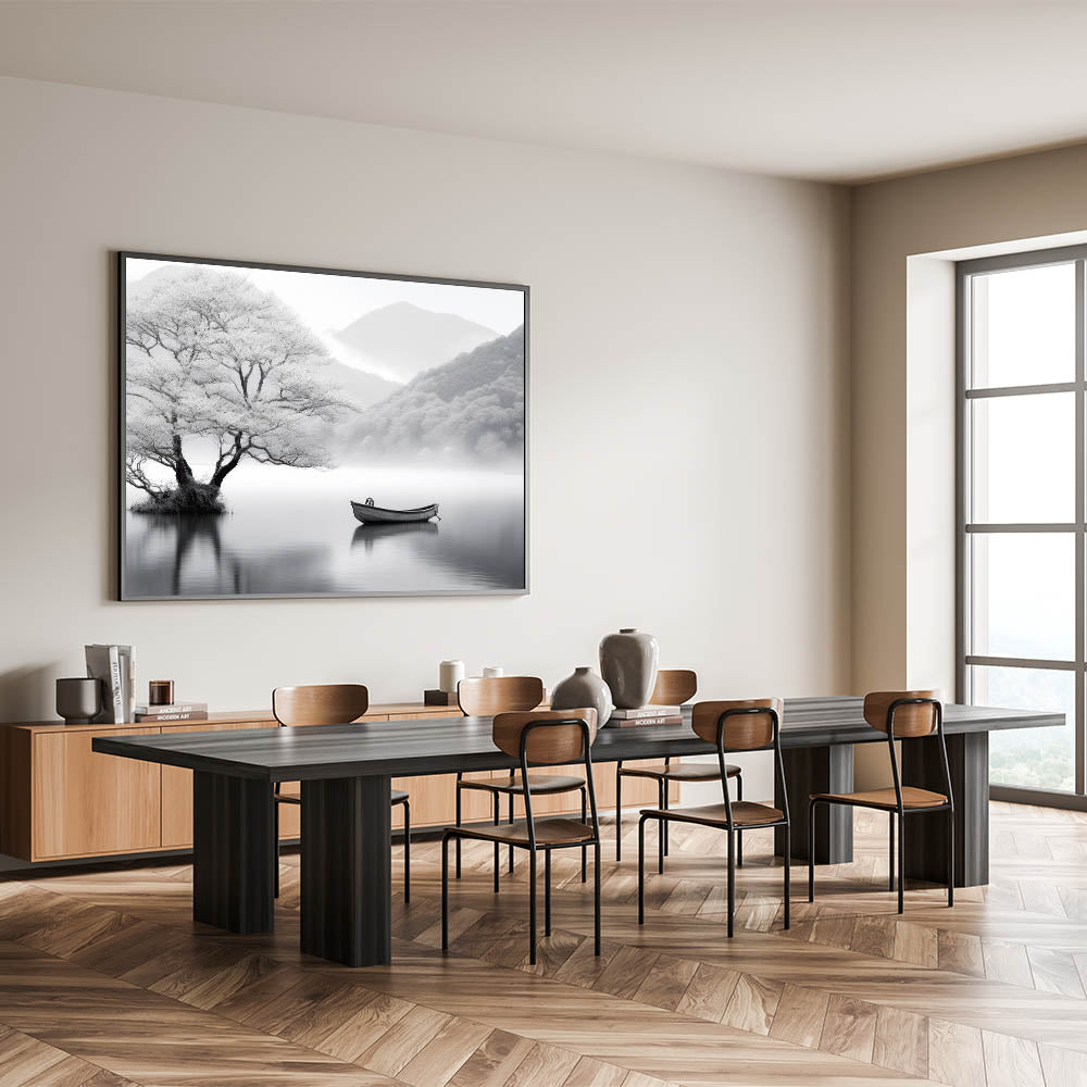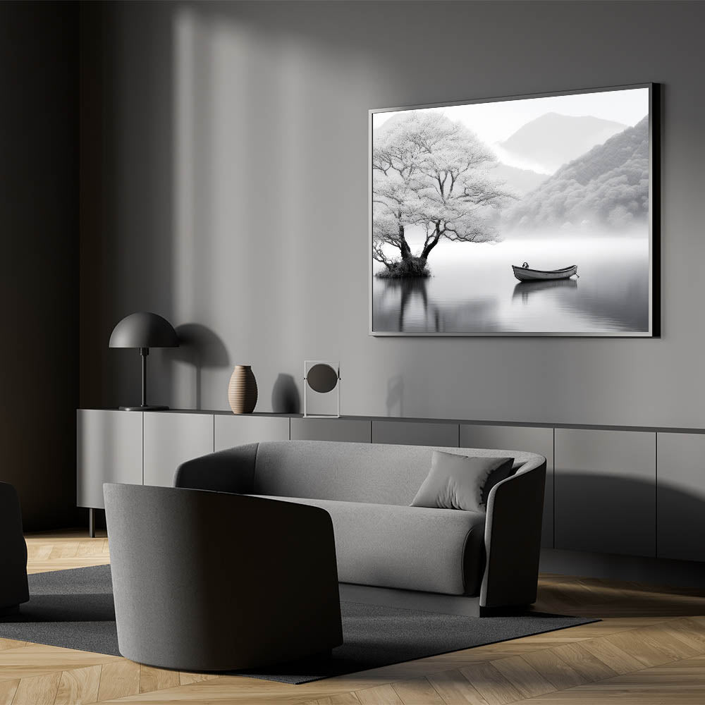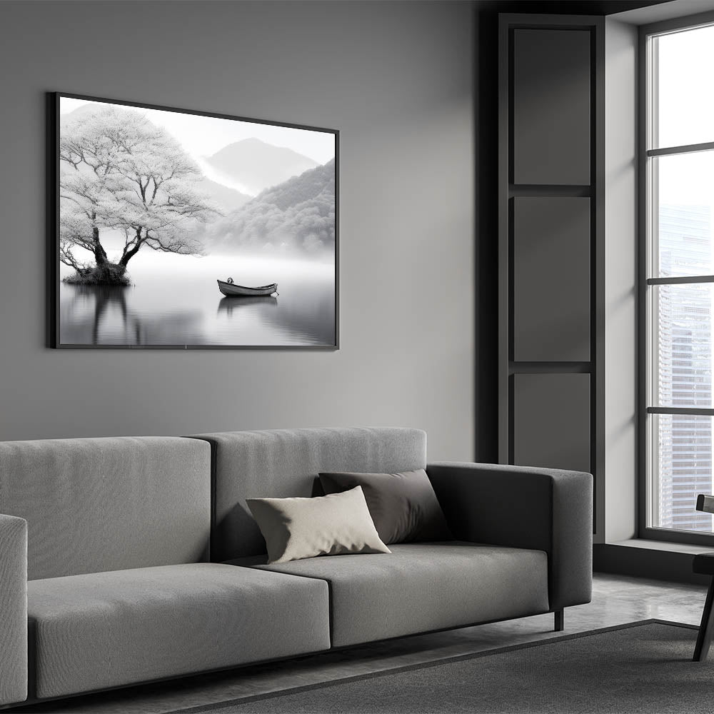 Embrace the elegance of simplicity with this tranquil black and white lake wall art. This minimalist artwork features a serene scene of a solitary tree and a small boat on a calm lake, all enveloped in a soft mist. The grayscale palette enhances the peaceful atmosphere, creating a timeless piece that brings a sense of calm and tranquility to any space. The balance between the delicate details and the open space in the composition invites the viewer to pause and reflect.