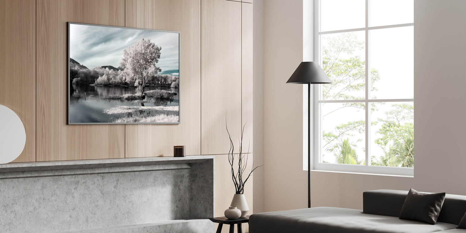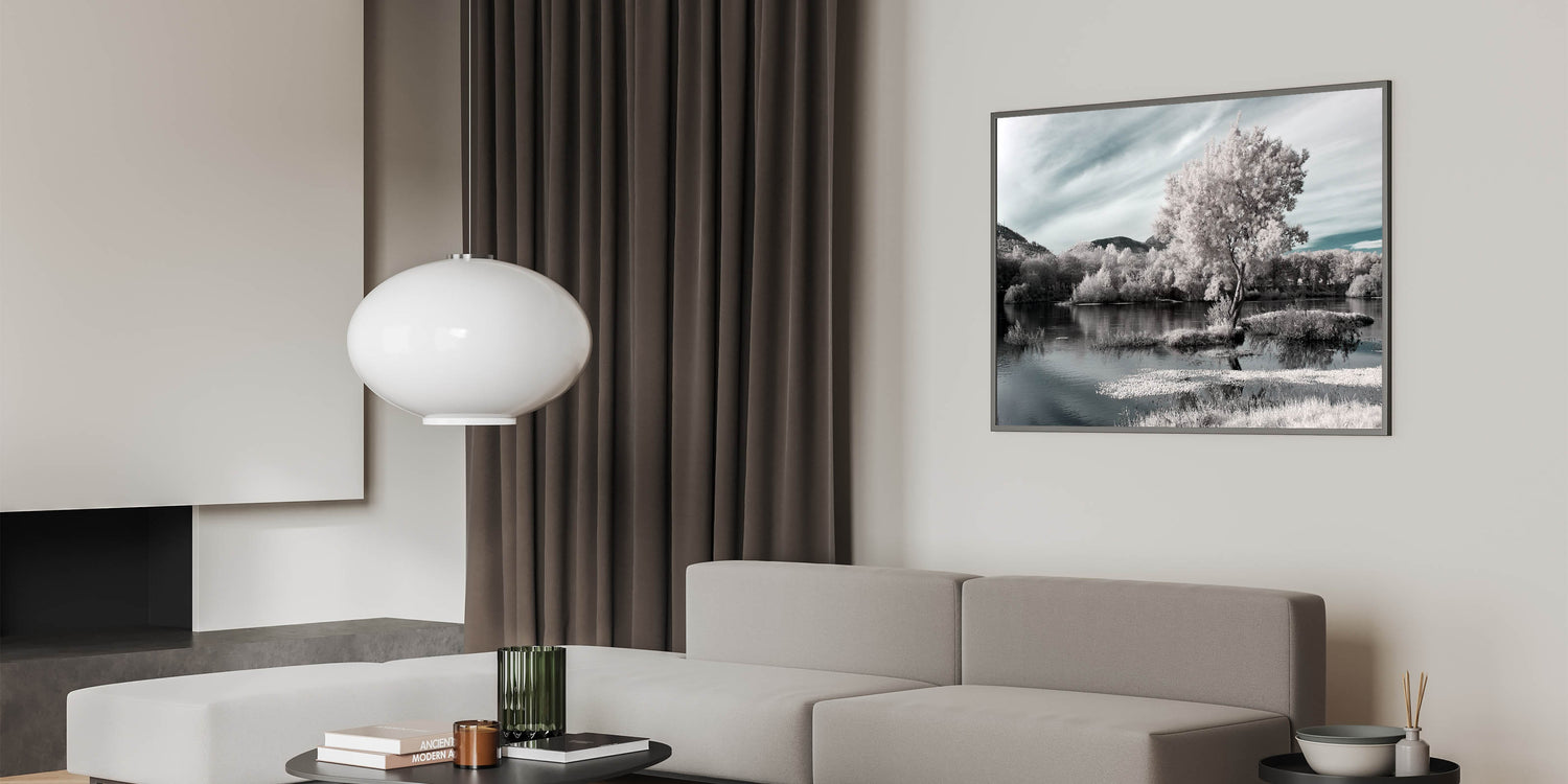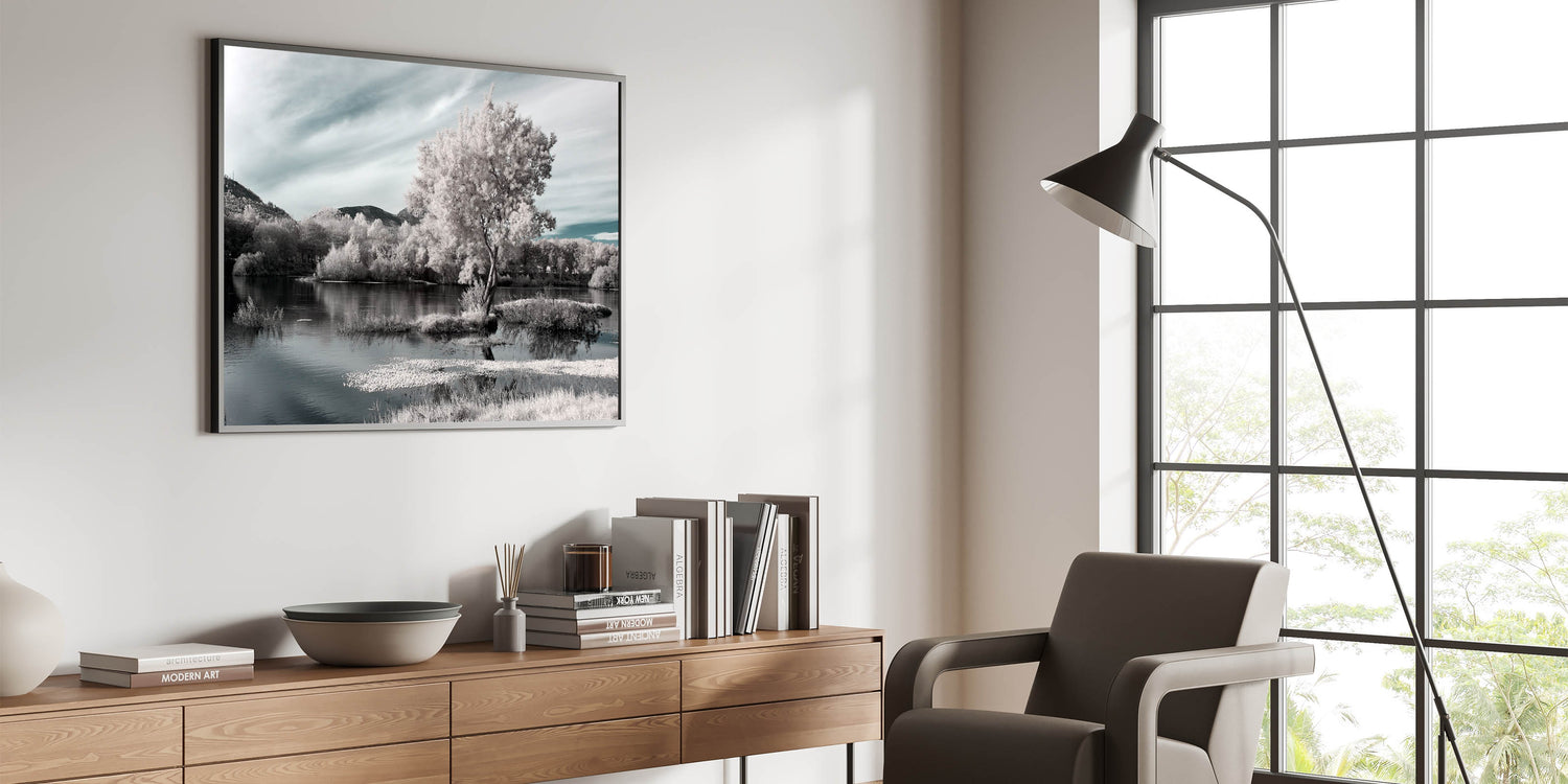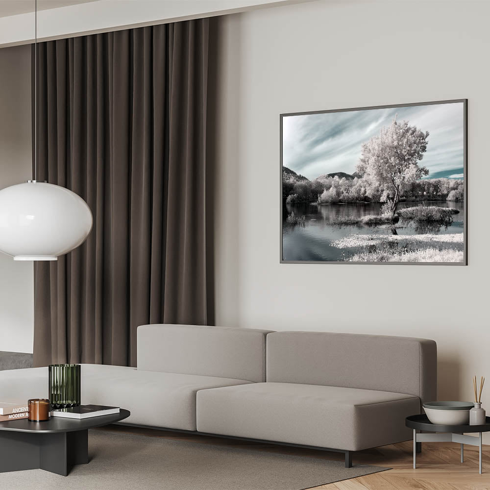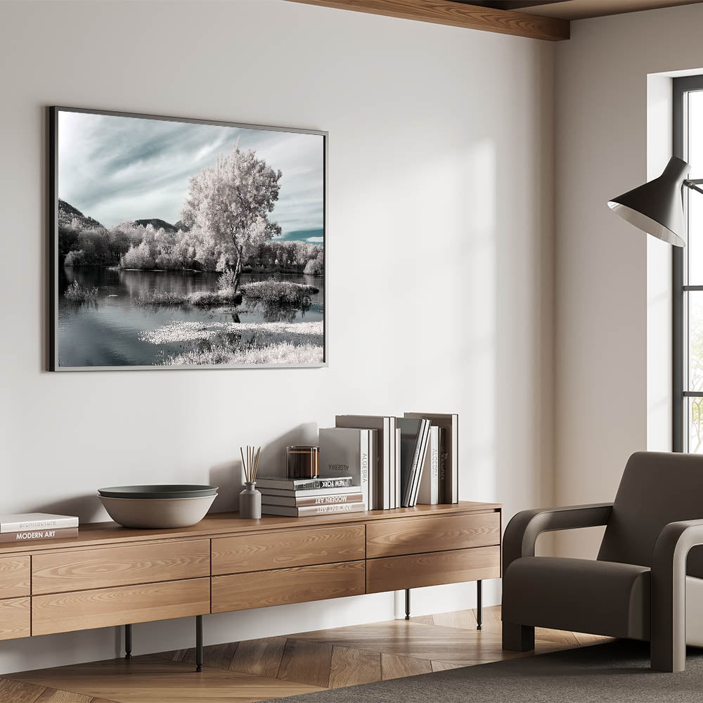 Add a touch of nature-inspired lake prints to your decor with this panoramic lake view. The serene lake scene will bring a sense of peace and relaxation to any space.