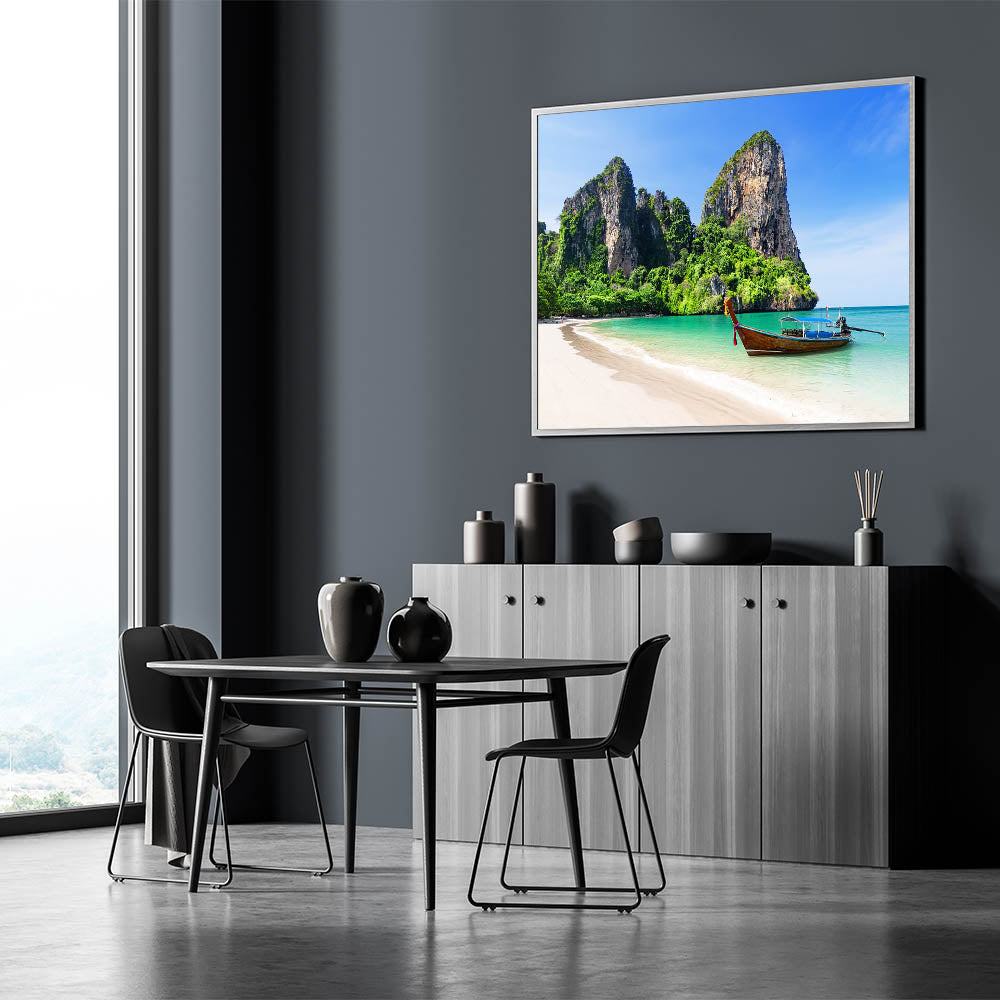 Bring the vibrant beauty of a tropical paradise into your home with this stunning beach landscape wall art. This ocean beach canvas art captures the lush greenery and towering cliffs of an exotic coastal location, complemented by the serene turquoise waters. The scene is completed by a traditional wooden boat resting on the shore, making this artwork an ideal choice for adding a touch of adventure and tranquility to your beach-themed decor.