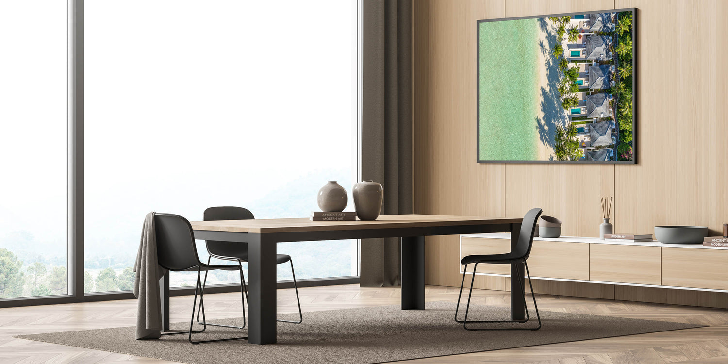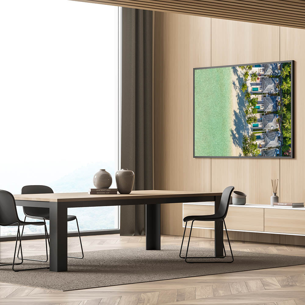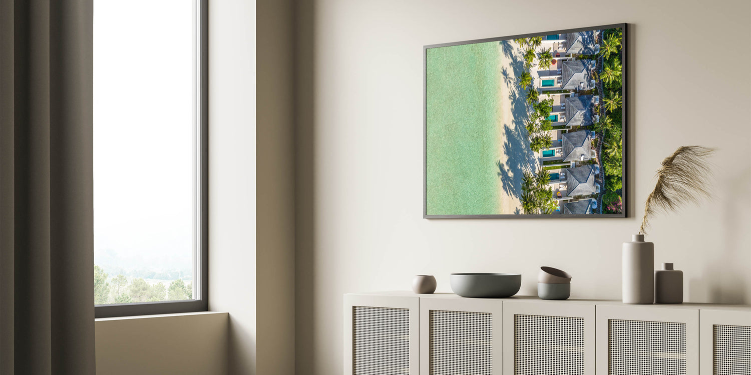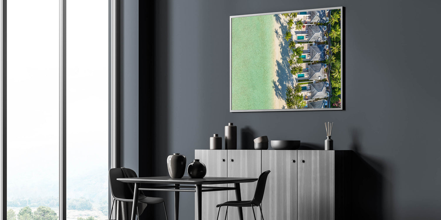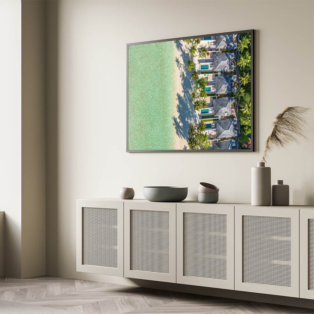 Immerse yourself in the tranquil beauty of the French Polynesian coast with our "Tropical Beachfront Retreat Canvas". This stunning artwork showcases a bird's-eye view of luxurious villas nestled among palm trees, with the pristine turquoise waters of Tahiti lapping at the sandy shores.
