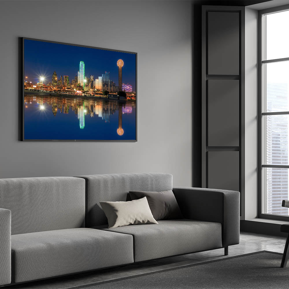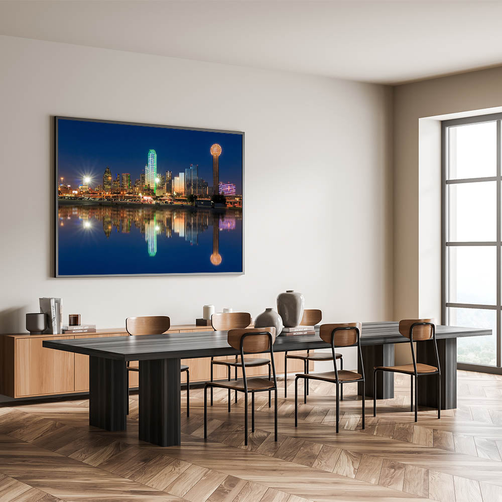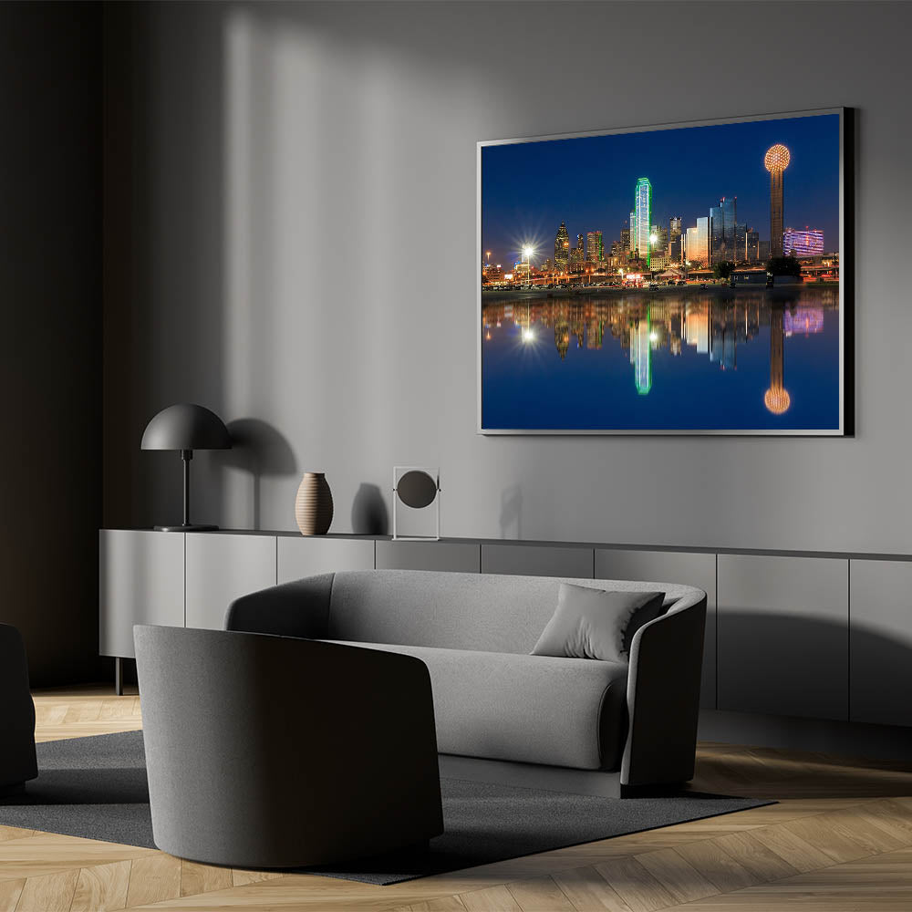 Experience the captivating energy of Dallas at night with this stunning skyline wall art. Featuring the iconic Reunion Tower and the shimmering lights of the city reflected perfectly in the calm waters below, this piece is a must-have for those who love urban landscapes. This Dallas night skyline art is ideal for adding a dynamic and contemporary touch to your home or office decor. Available in a range of formats including stretched canvas, framed prints, and acrylic glass, this artwork is designed to suit any interior style.
