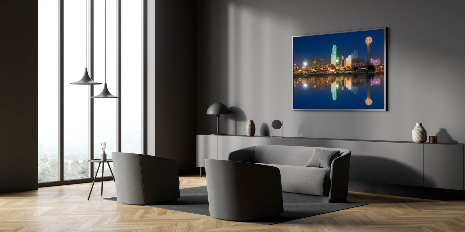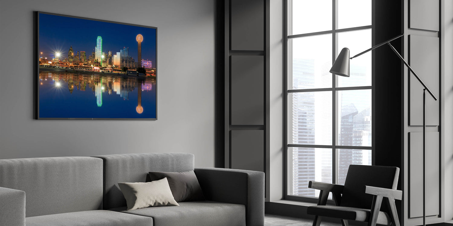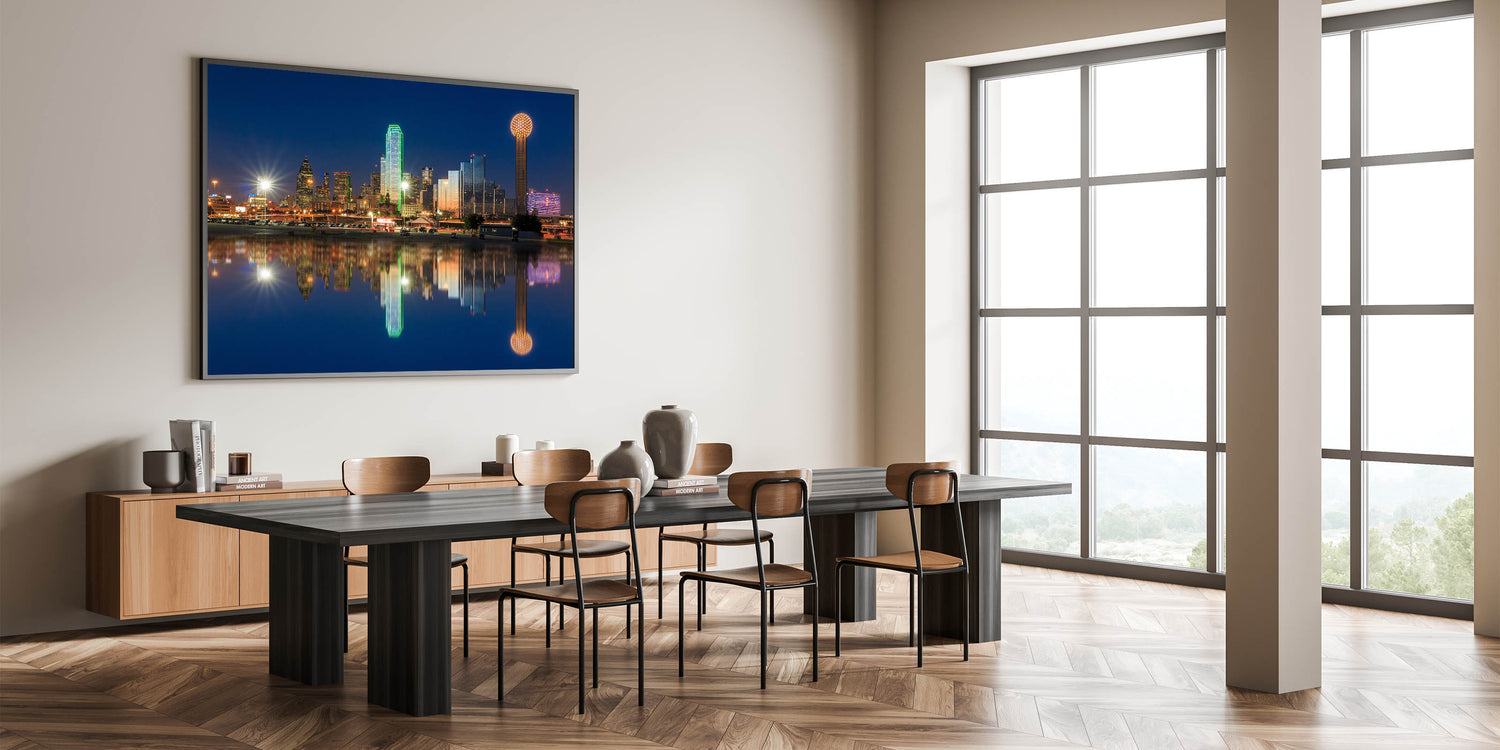 Experience the captivating energy of Dallas at night with this stunning skyline wall art. Featuring the iconic Reunion Tower and the shimmering lights of the city reflected perfectly in the calm waters below, this piece is a must-have for those who love urban landscapes. This Dallas night skyline art is ideal for adding a dynamic and contemporary touch to your home or office decor. Available in a range of formats including stretched canvas, framed prints, and acrylic glass, this artwork is designed to suit any interior style.