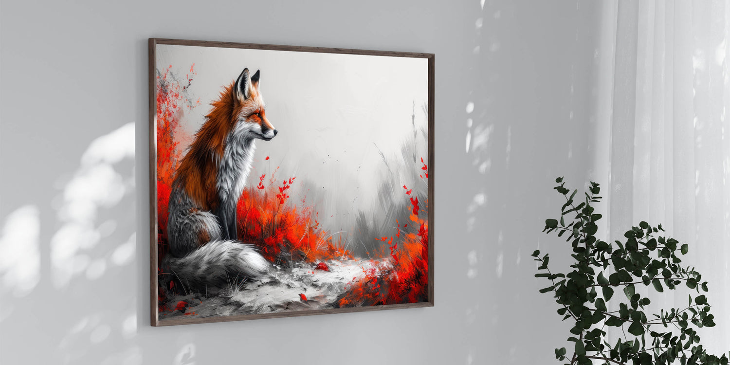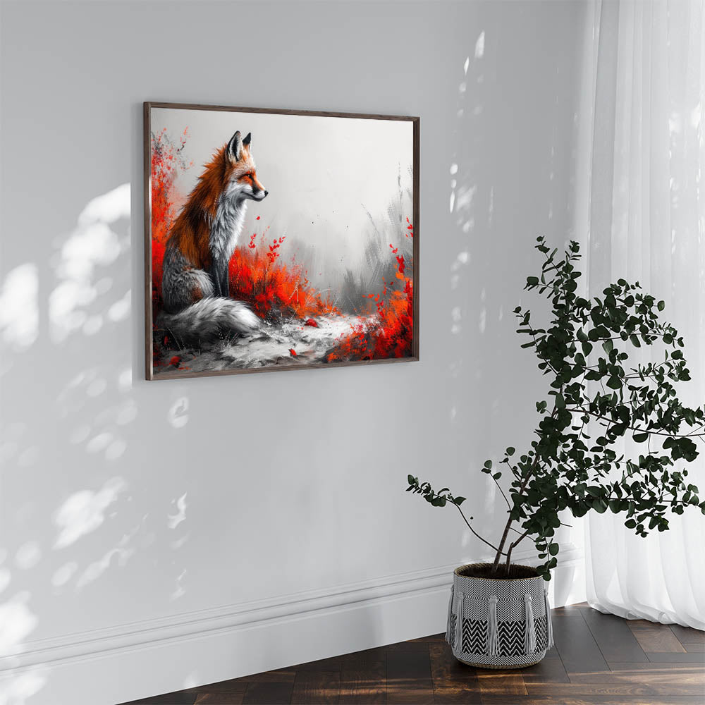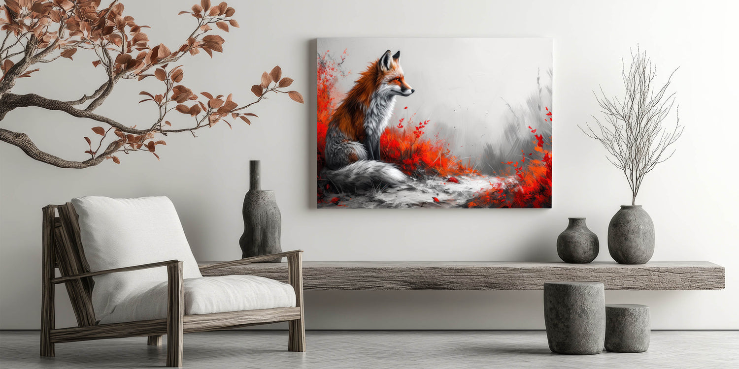 Make a bold statement in your living space with this stunning fox wall art. Featuring a majestic fox surrounded by vibrant red foliage against a soft grey background, this artwork combines the beauty of nature with a modern artistic twist. The contrast between the fiery red tones and the muted grey creates a visually captivating piece that will draw attention and admiration in any room.