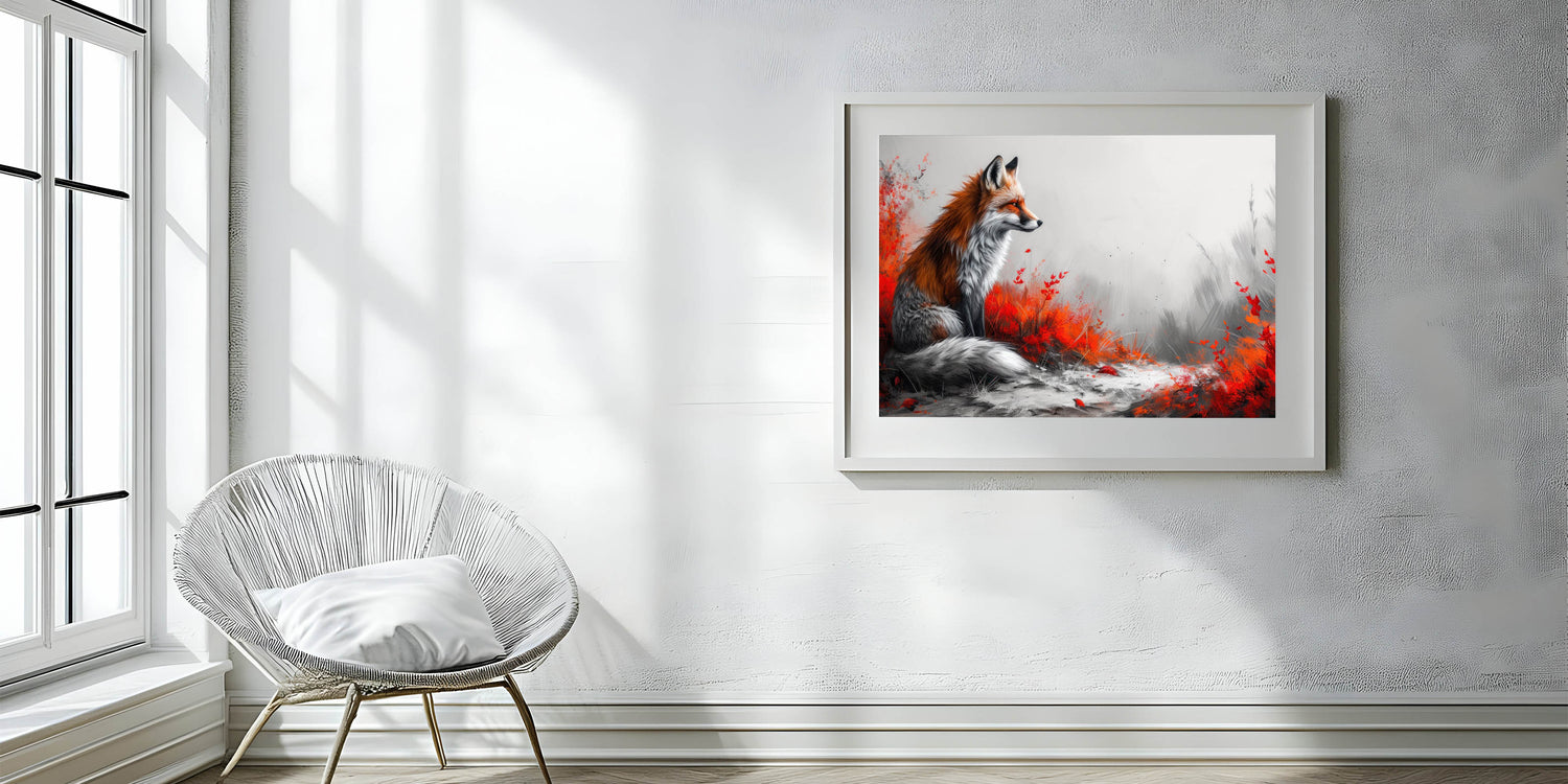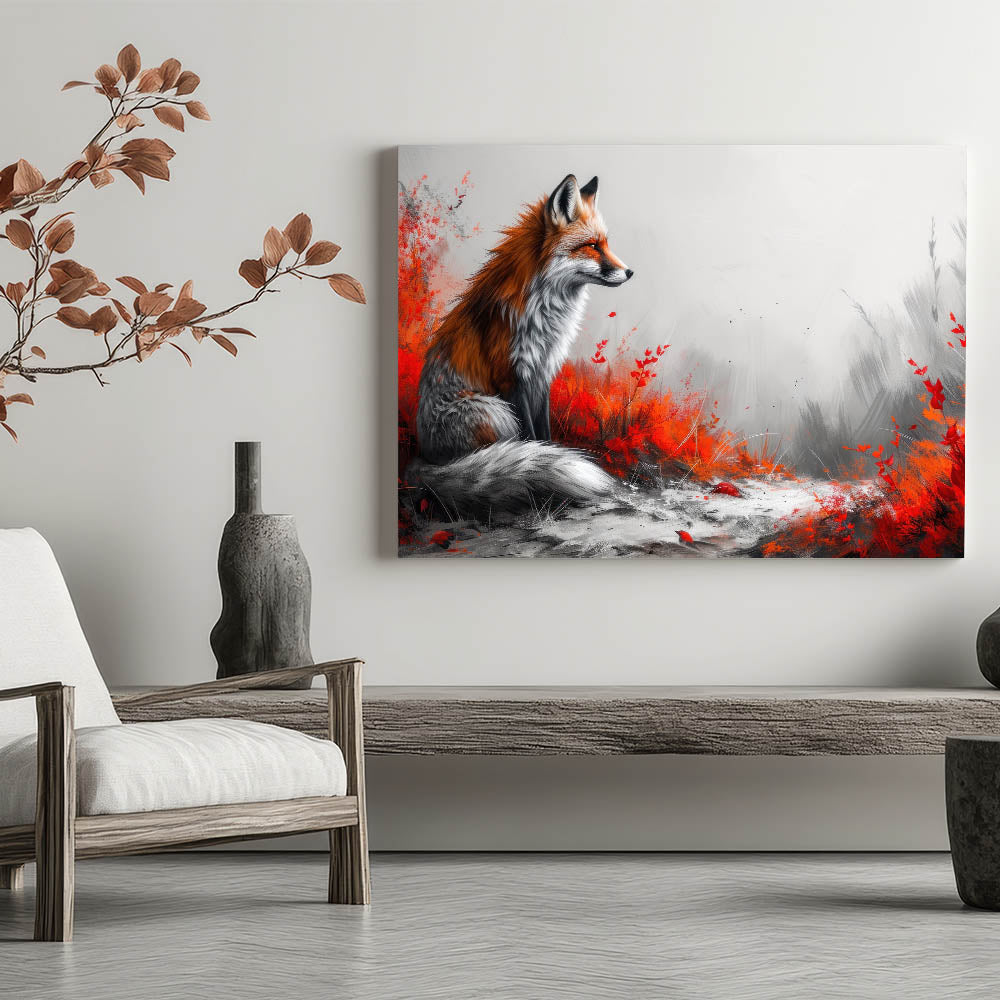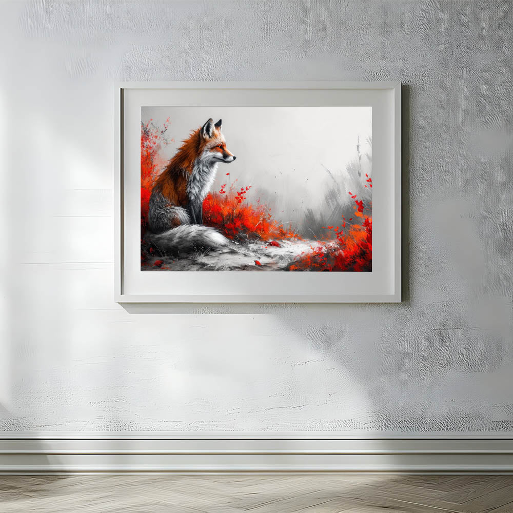Make a bold statement in your living space with this stunning fox wall art. Featuring a majestic fox surrounded by vibrant red foliage against a soft grey background, this artwork combines the beauty of nature with a modern artistic twist. The contrast between the fiery red tones and the muted grey creates a visually captivating piece that will draw attention and admiration in any room.