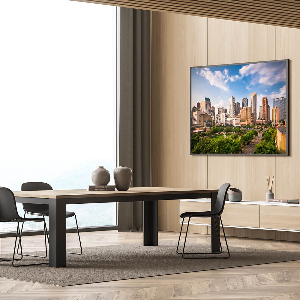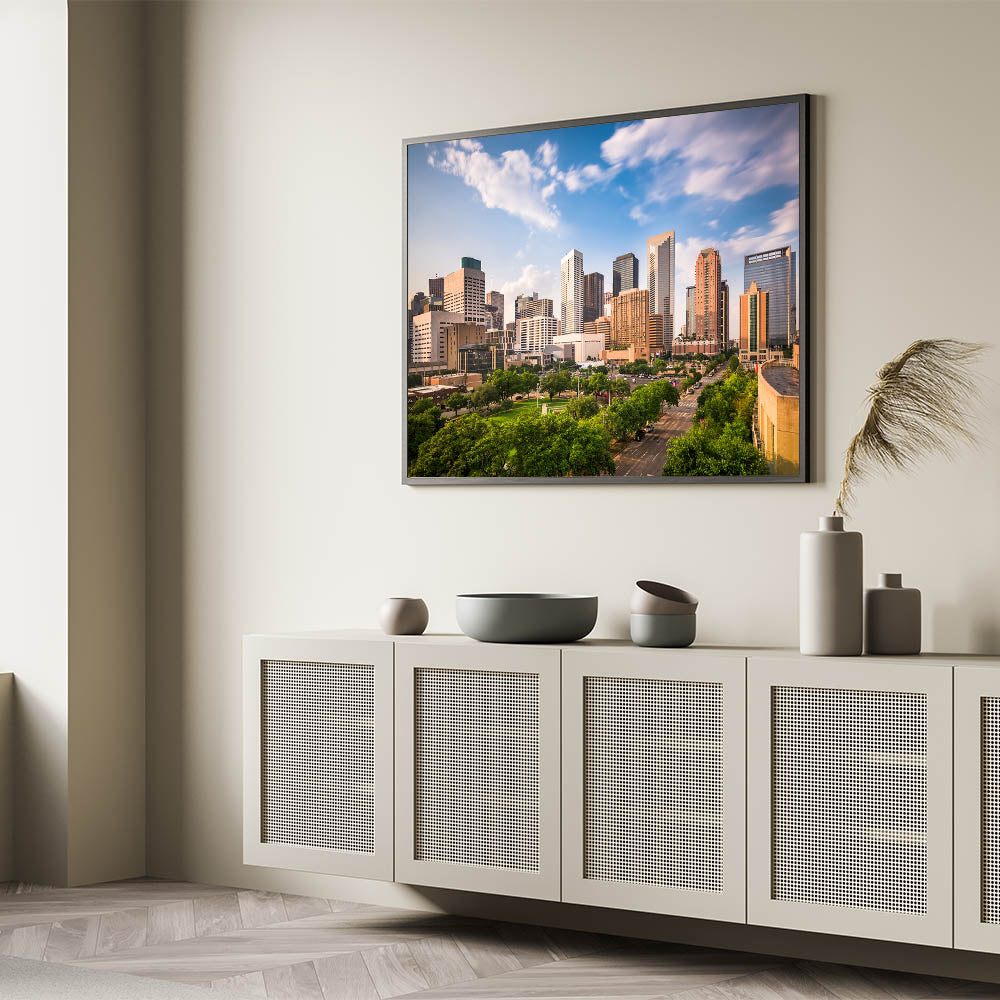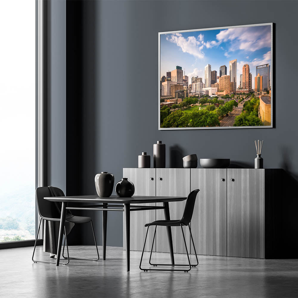 Capture the essence of Houston's vibrant urban life with this stunning Houston skyline wall art. Perfect for enhancing both home and office decor, this piece of art offers a breathtaking view of Houston’s downtown skyline under a clear blue sky. The sharp architectural lines and the natural greenery in the foreground create a harmonious balance, making it an ideal choice for modern interiors.