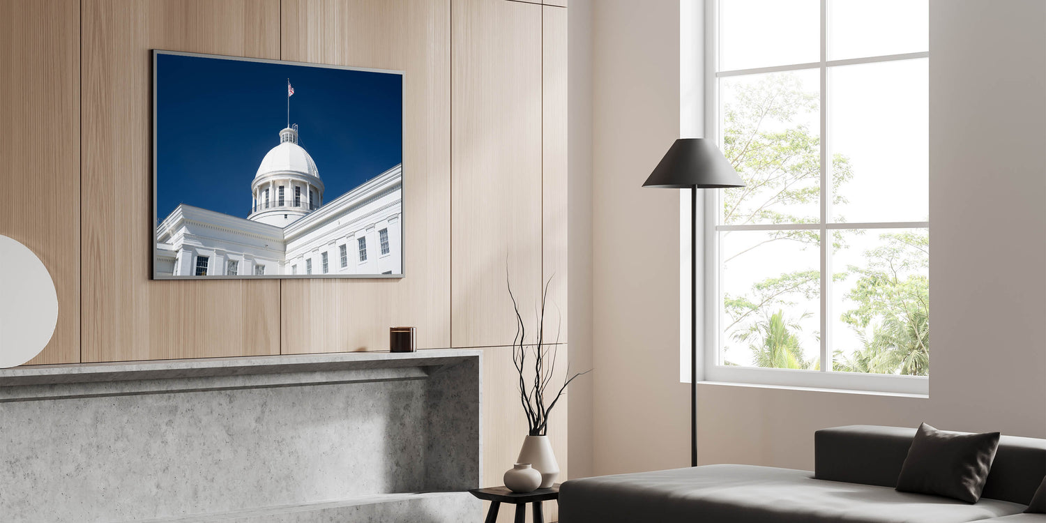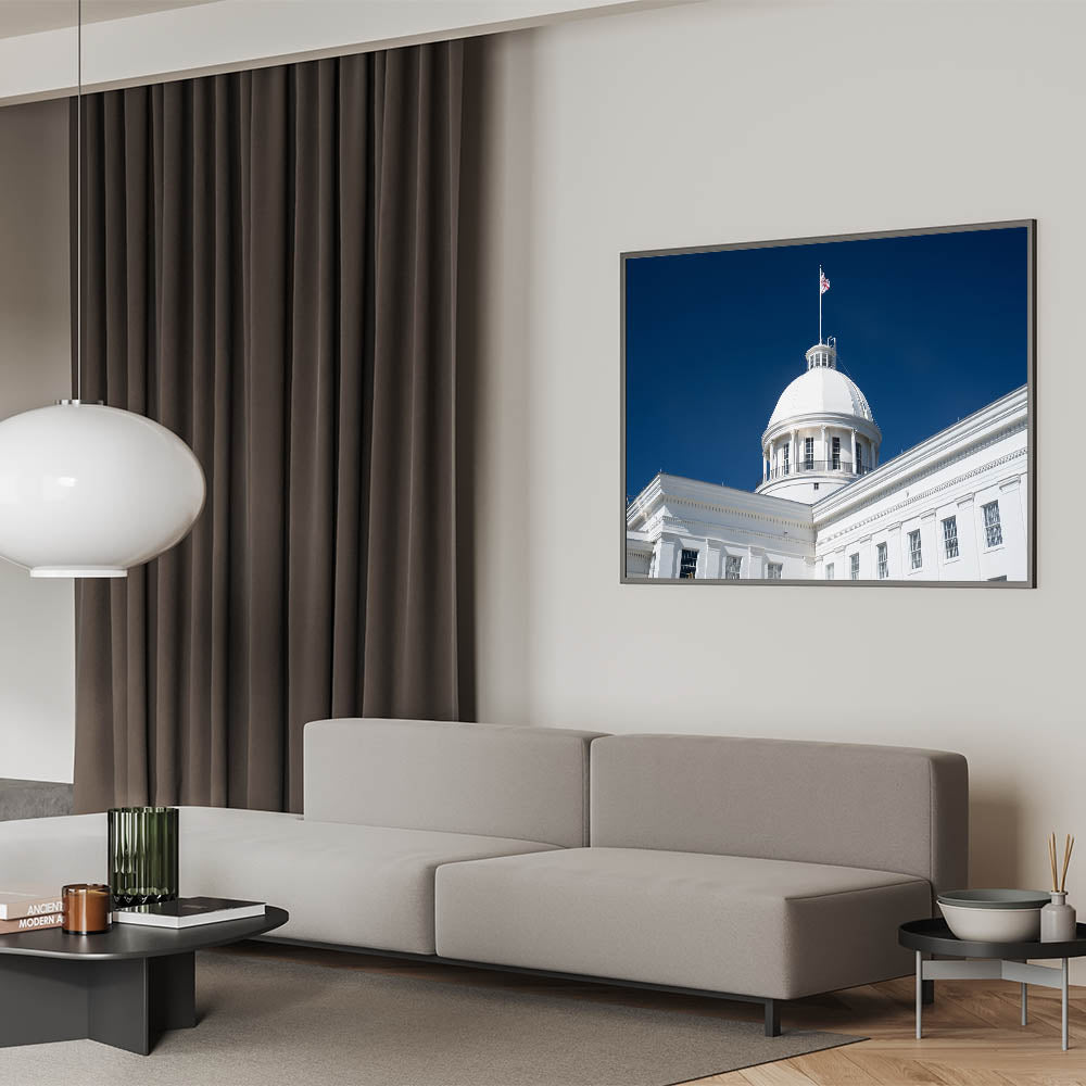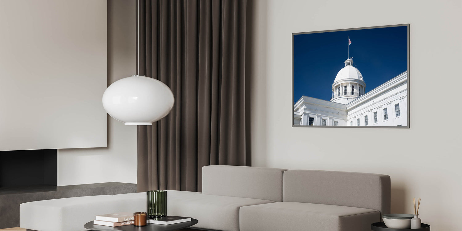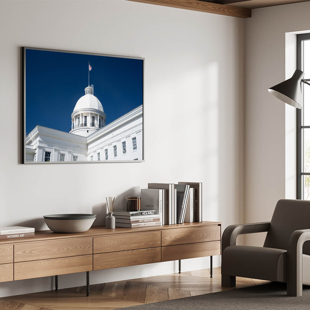- High-Quality Prints: This Alabama landscape print is meticulously crafted to showcase the fine architectural details and the brilliance of the white dome against the vibrant sky.