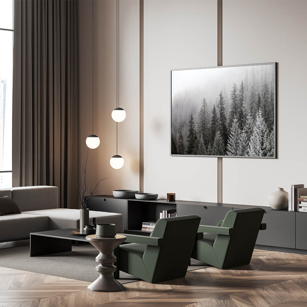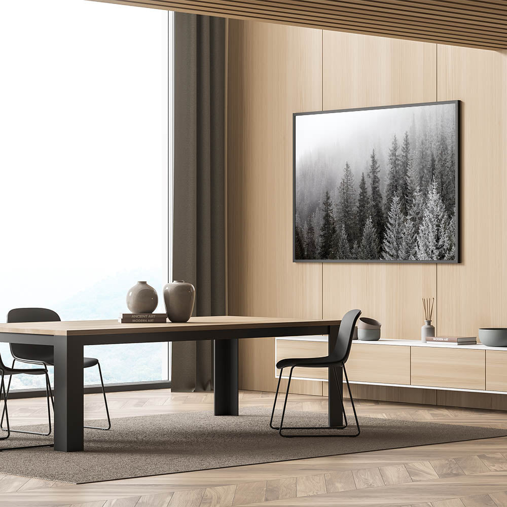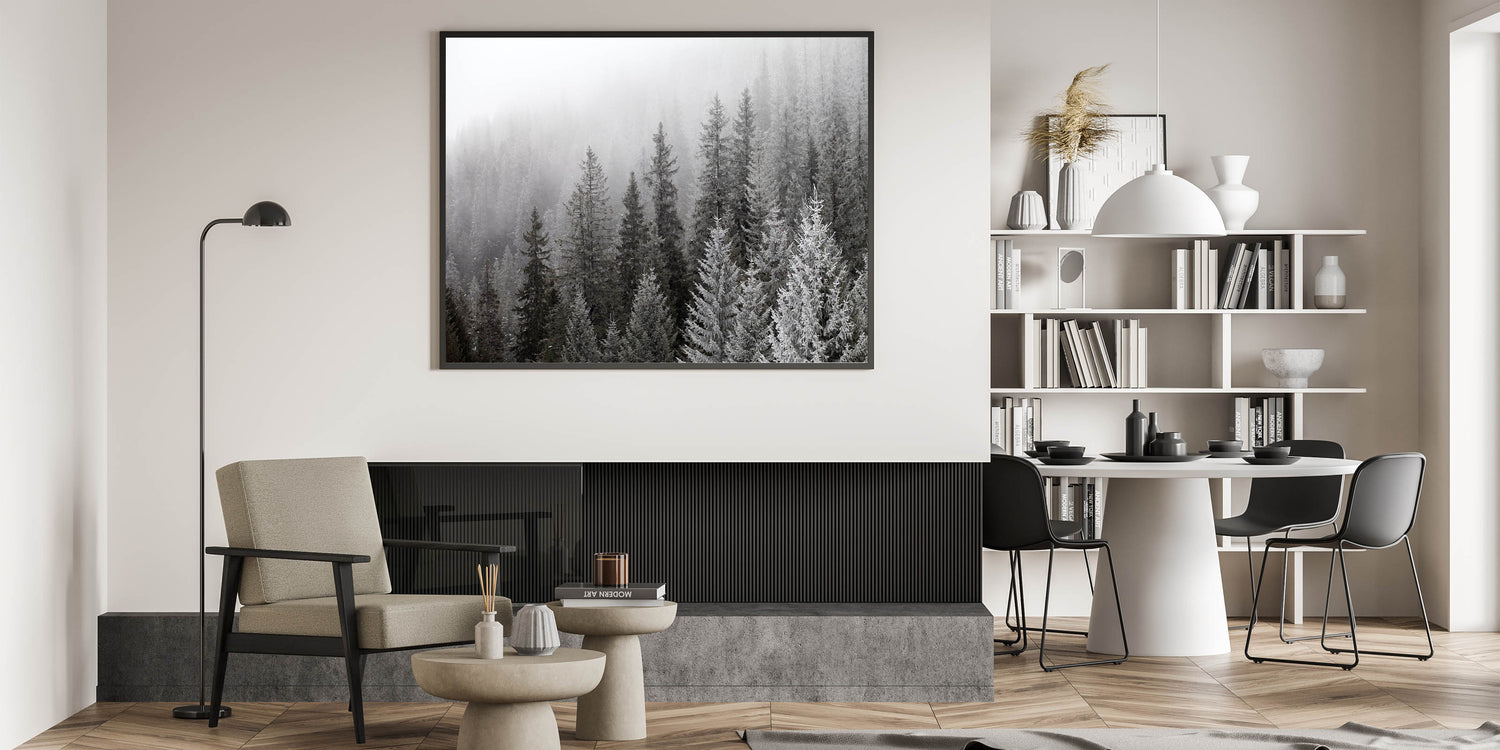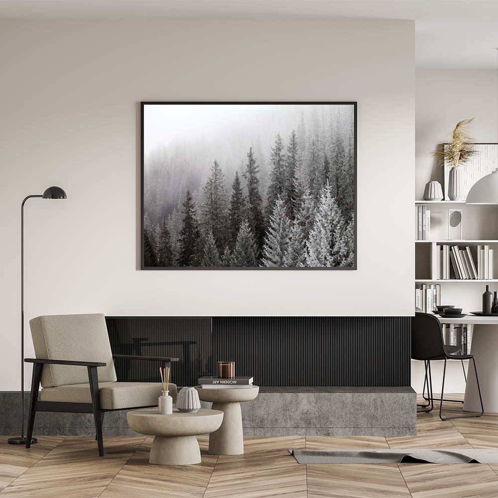 Capture the serene beauty of winter with this stunning frosty forest wall art. Featuring snow-covered evergreen trees rising through a misty, ethereal landscape, this artwork brings a calm and tranquil atmosphere to any space. The detailed depiction of the frost-laden trees against the soft fog creates a peaceful scene that evokes the quiet stillness of a winter morning. Perfect for nature lovers, this winter landscape art is ideal for those who enjoy the clean, minimalist look of snowy scenery.