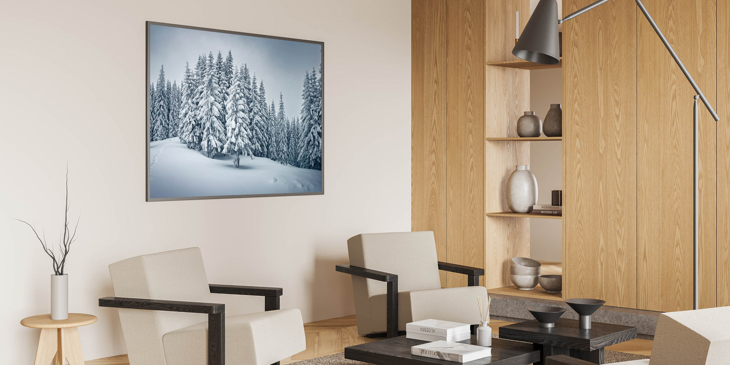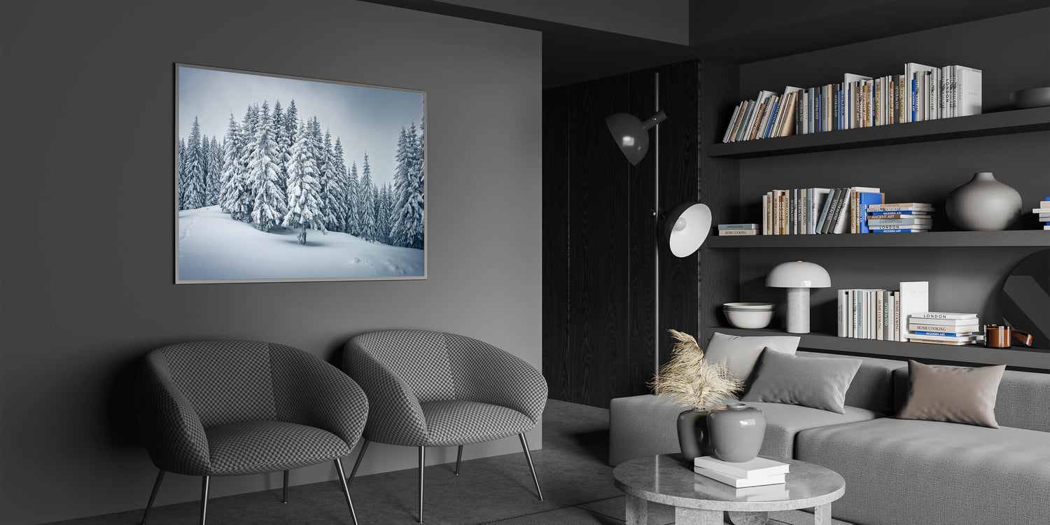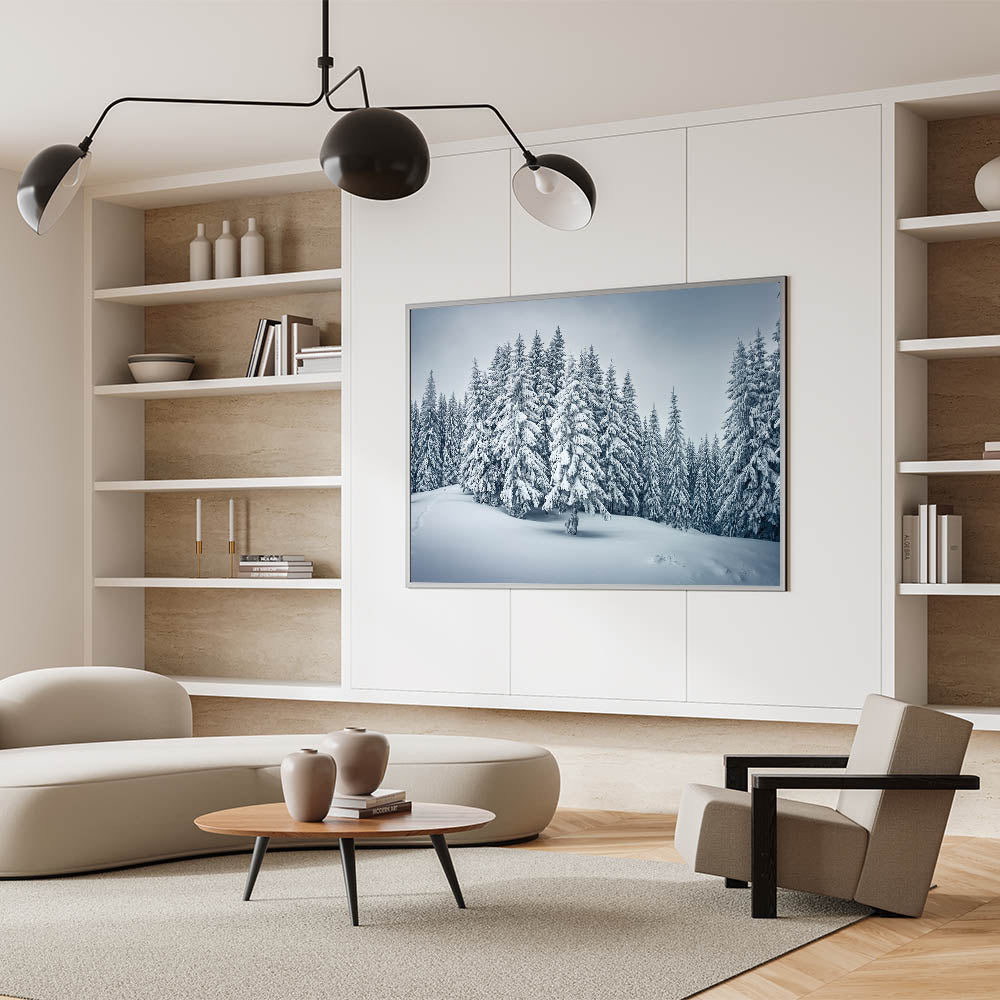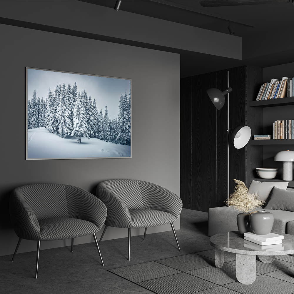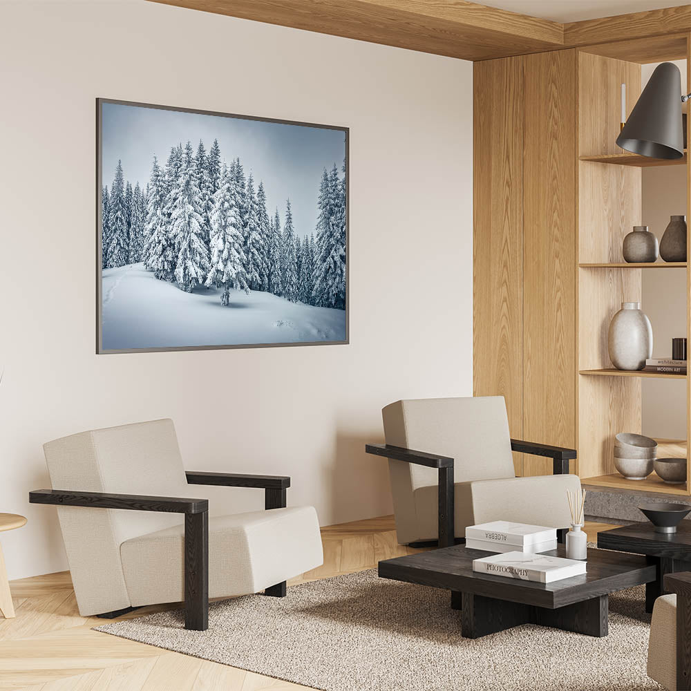 Step into a winter wonderland with this captivating forest wall art, showcasing snow-covered trees in a serene landscape. The detailed depiction of the snowy pines, combined with the soft, powdery snow covering the ground, evokes the quiet beauty of a peaceful winter day. Perfect for those who appreciate the elegance of the colder months, this artwork brings a sense of tranquility and calm to any space.