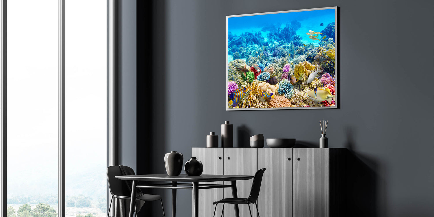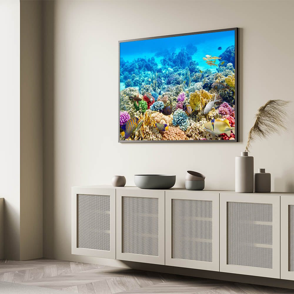 - High-quality canvas print of Australia’s Great Barrier Reef, showcasing colorful coral reefs and tropical fish.