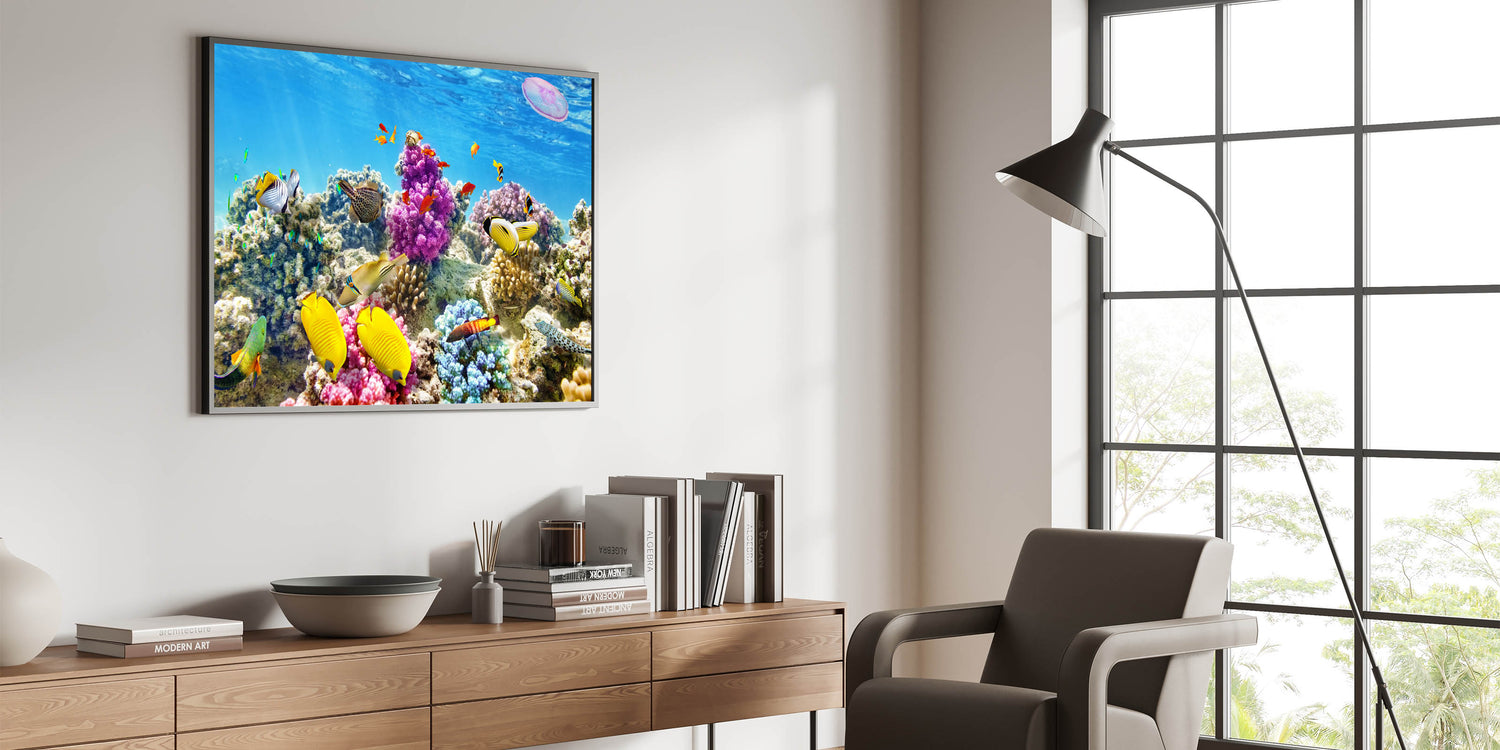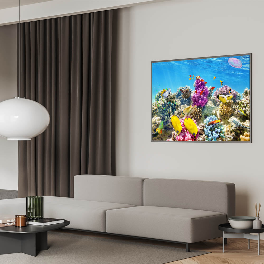 Immerse yourself in the vibrant beauty of Australia’s Great Barrier Reef with this stunning underwater coral photography. This wall art showcases an explosion of colors with exotic tropical fish swimming among radiant corals, bringing the underwater world to life. Perfect for ocean lovers and marine life enthusiasts, this artwork will brighten any room and transport you to the depths of the ocean.