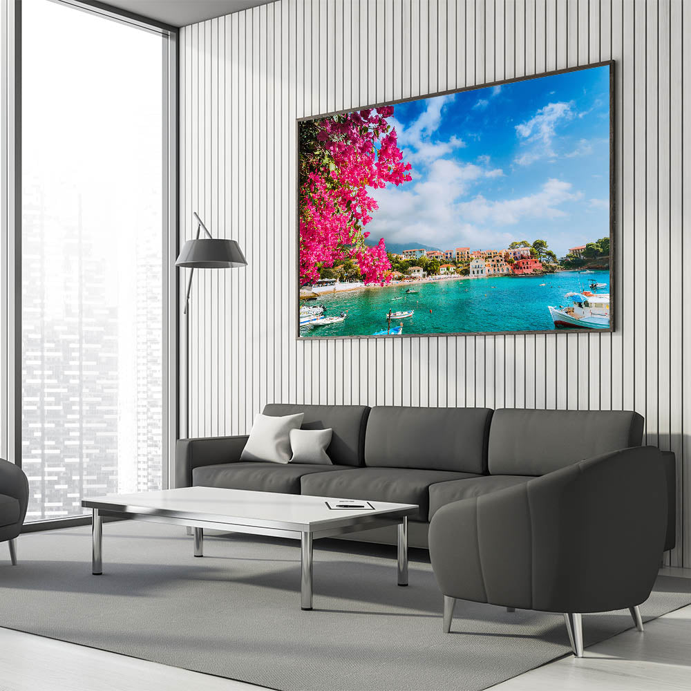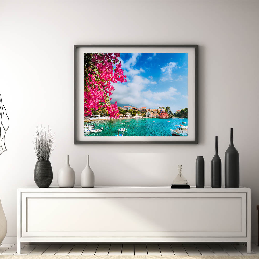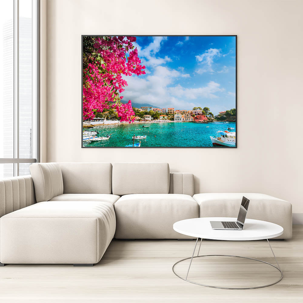 Bring the vibrant beauty of the Mediterranean into your home with this stunning Crete canvas print. Featuring bright bougainvillea flowers cascading over a turquoise bay, this picturesque scene captures the charm and color of a traditional Greek village by the sea. The bold pink blooms set against the serene blue waters and colorful village homes make this piece a perfect addition to any room that needs a pop of color and Mediterranean charm.