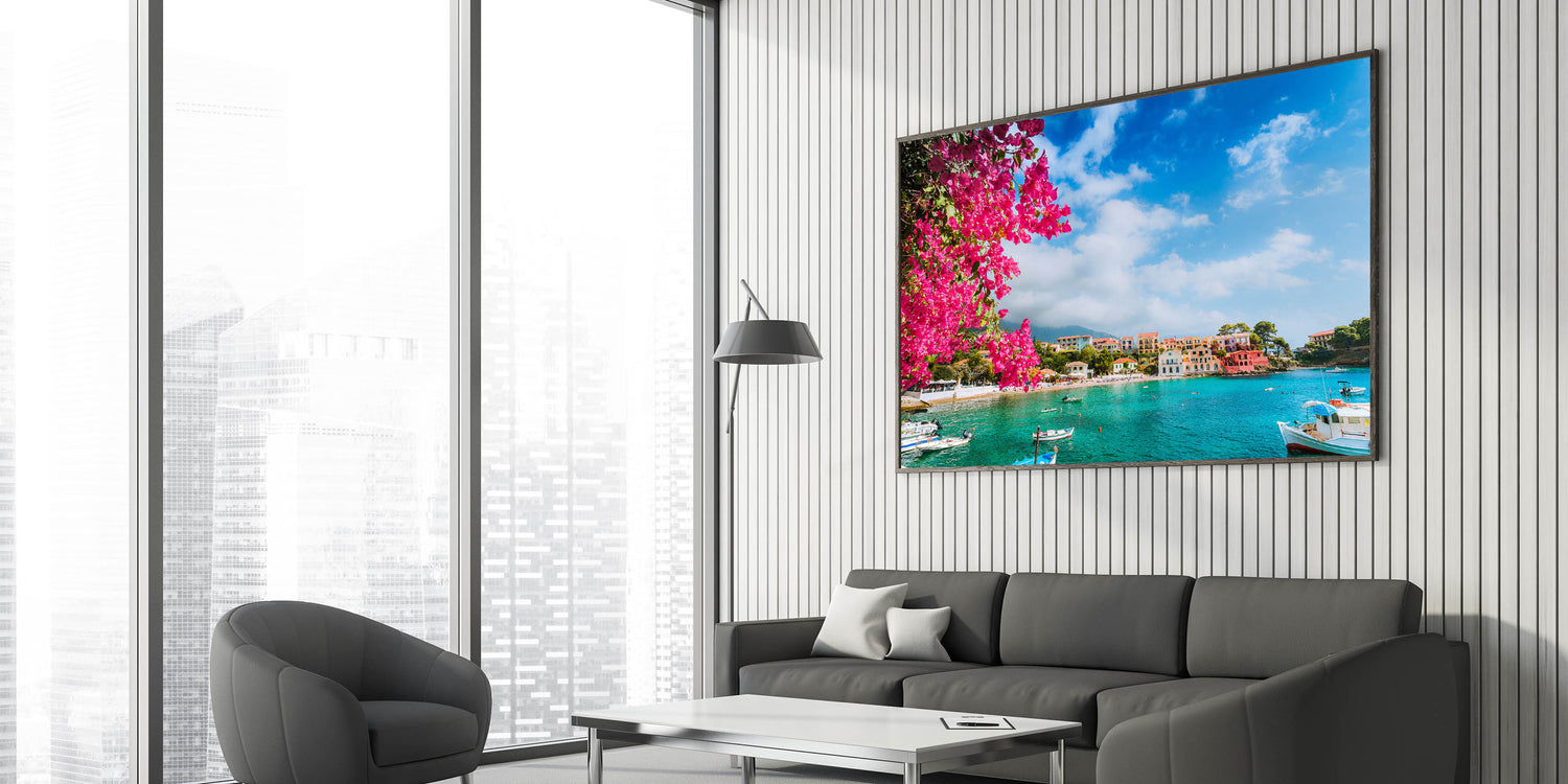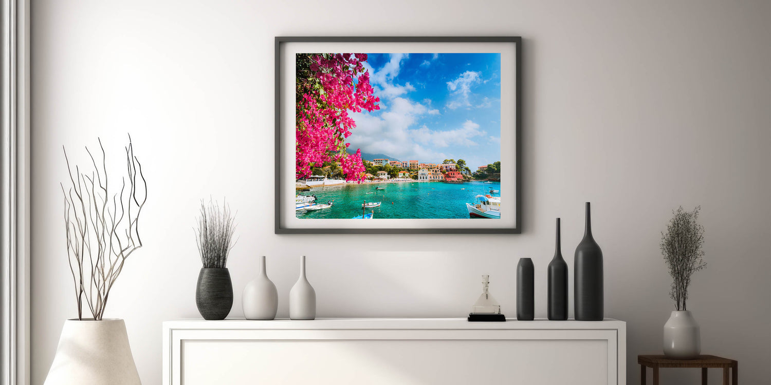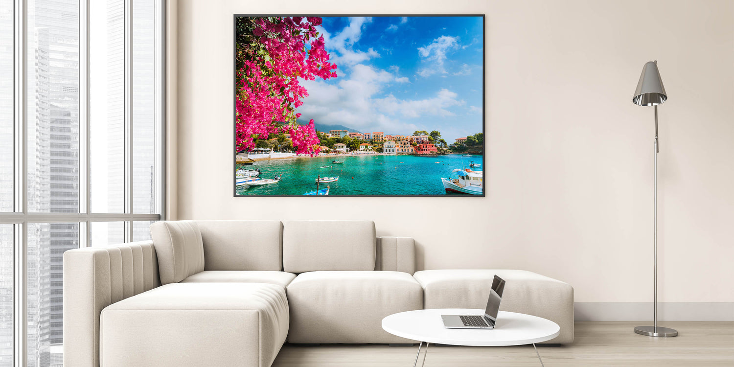 Bring the vibrant beauty of the Mediterranean into your home with this stunning Crete canvas print. Featuring bright bougainvillea flowers cascading over a turquoise bay, this picturesque scene captures the charm and color of a traditional Greek village by the sea. The bold pink blooms set against the serene blue waters and colorful village homes make this piece a perfect addition to any room that needs a pop of color and Mediterranean charm.