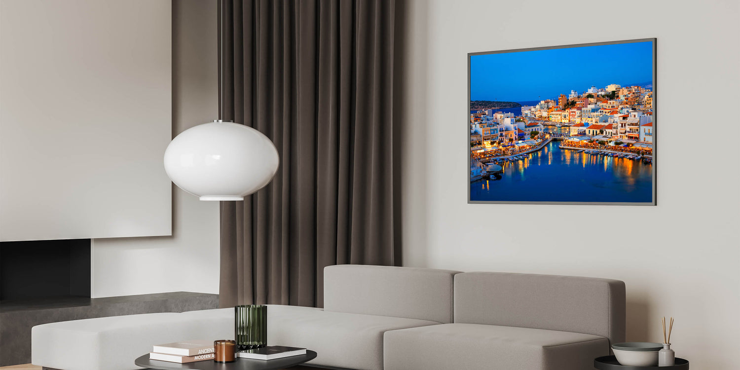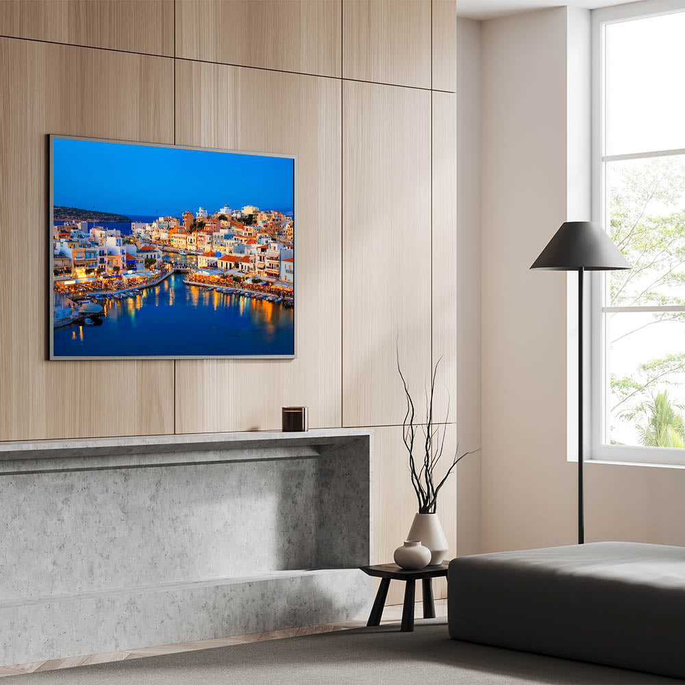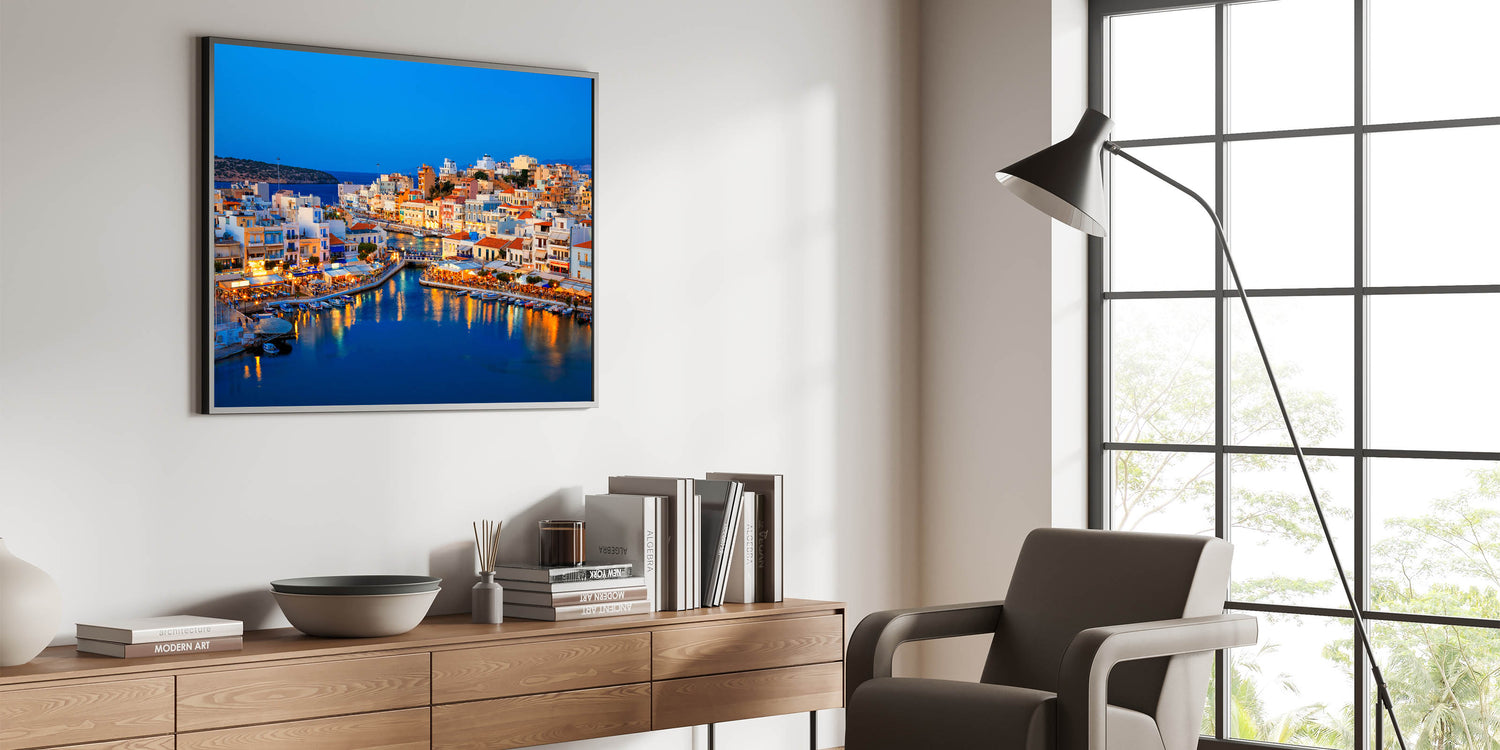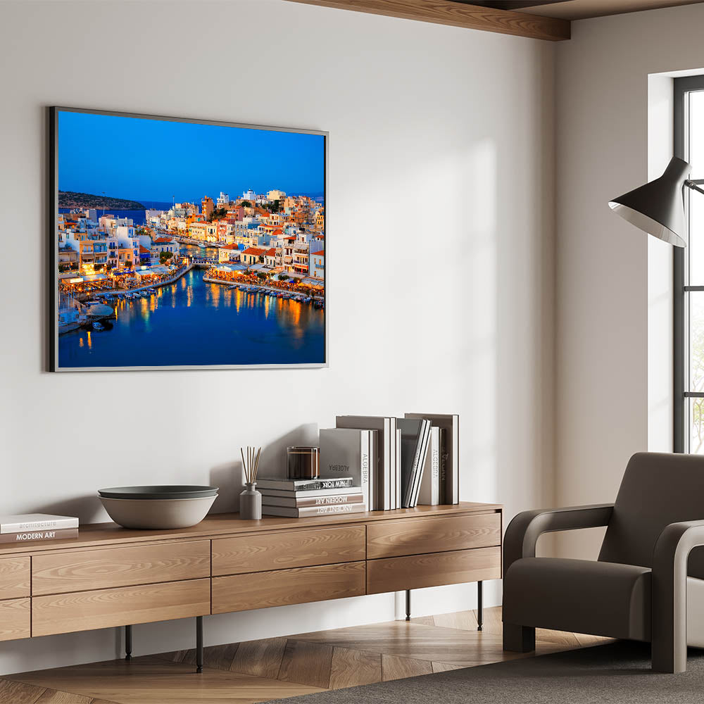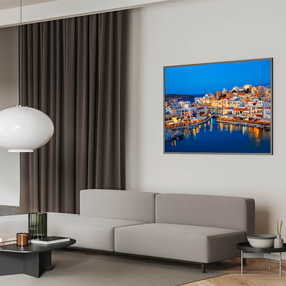 Let the vibrant evening lights of Agios Nikolaos add a touch of Greek island beauty to your decor. This piece of art will be a stunning focal point in any room, creating a warm and inviting atmosphere.