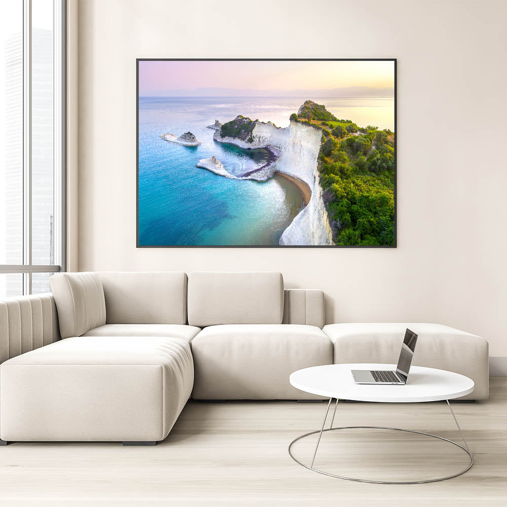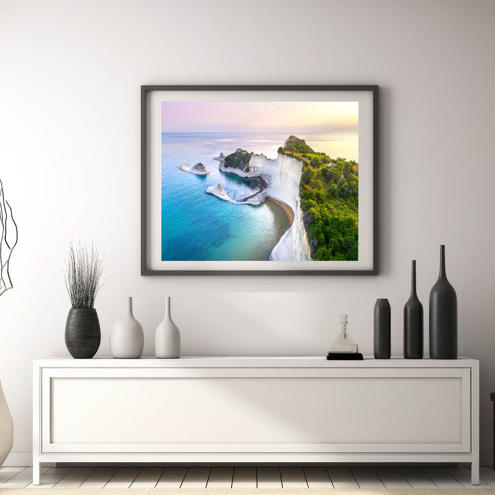 Explore the captivating beauty of Greece’s coastline with this striking Greek Coastline art featuring the dramatic cliffs and serene waters of Corfu. This artwork showcases the breathtaking landscape where steep white cliffs meet calm turquoise seas, capturing the peaceful yet awe-inspiring essence of Greece’s natural beauty. Perfect for lovers of coastal landscapes and Mediterranean charm, this piece adds a touch of tranquility to any space.