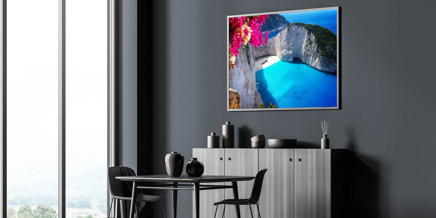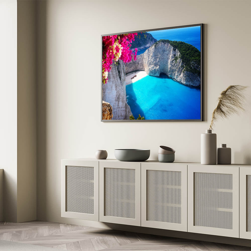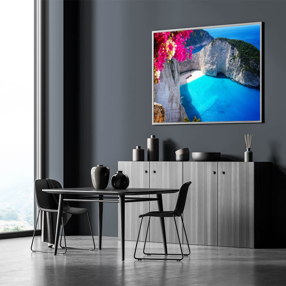 Immerse yourself in the vibrant beauty of Greece’s famous Navagio Beach with this stunning Greek Islands art print. This artwork captures the pristine turquoise waters and dramatic cliffs of the beach, framed by the vivid colors of blooming bougainvillea. The contrast of bright pink flowers against the serene blue ocean creates a mesmerizing and inviting atmosphere, perfect for any room looking for a splash of color and coastal charm.