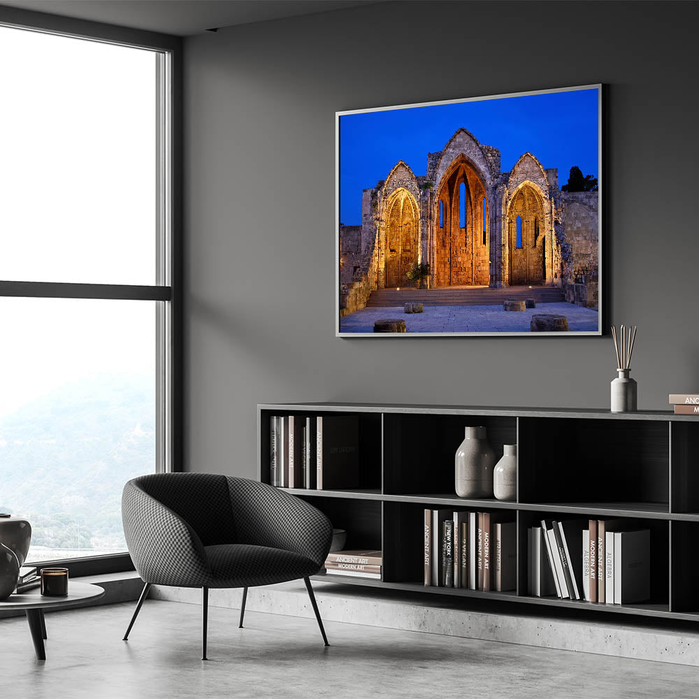 Step into history with this magnificent Historic Rhodes Painting, showcasing the ancient ruins of Rhodes Greece. Capturing the beauty of Greek Island Wall Decor, this artwork presents a striking contrast between the warm, illuminated stone arches and the deep blue twilight sky. Perfect for those who appreciate Historic Greek Landmarks, this piece brings the majestic history of Rhodes into your living space.