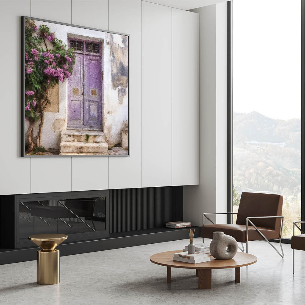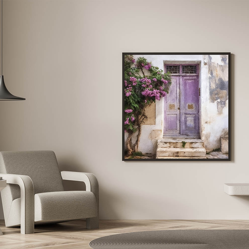 Experience the timeless beauty of Greek architecture with our Santorini Door Print. This artwork features a rustic light purple door framed by vibrant lilac flowers, set against a charming weathered wall. The piece captures the essence of Greek island life, bringing the tranquil atmosphere of the Mediterranean straight into your home. The harmonious blend of pastel tones and aged textures creates a serene and inviting focal point, perfect for enhancing any living space.